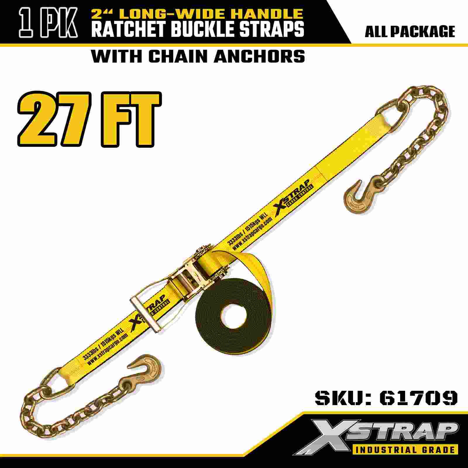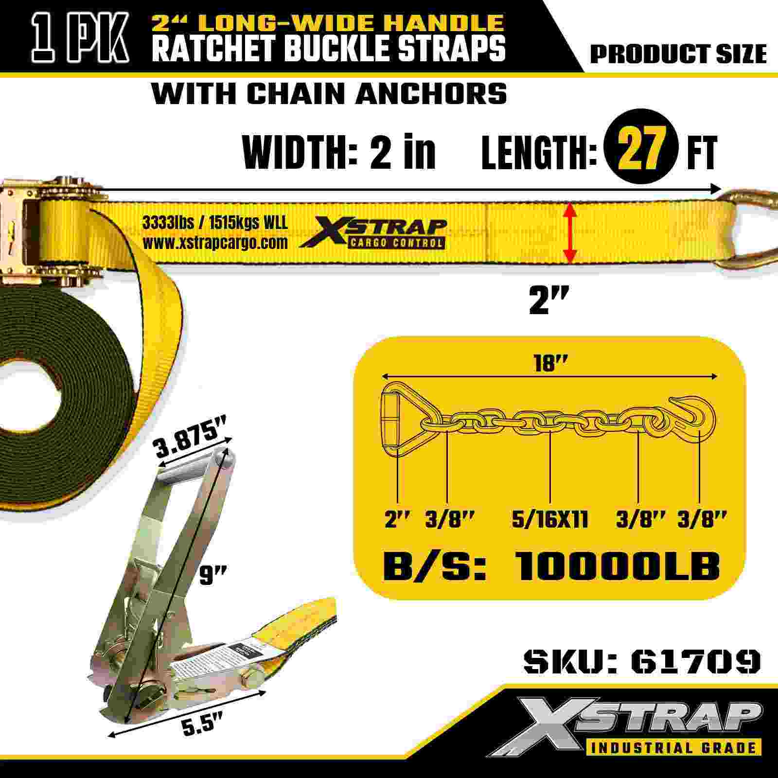 X-ремешок 61709 Длинные ремни с пряжкой с храповым механизмом и широкой ручкой, 2 x 27 футов (1 упаковка) с Цепные крючки, прочность на разрыв 10 000 фунтов, прочный привязной ремень для безопасной транспортировки