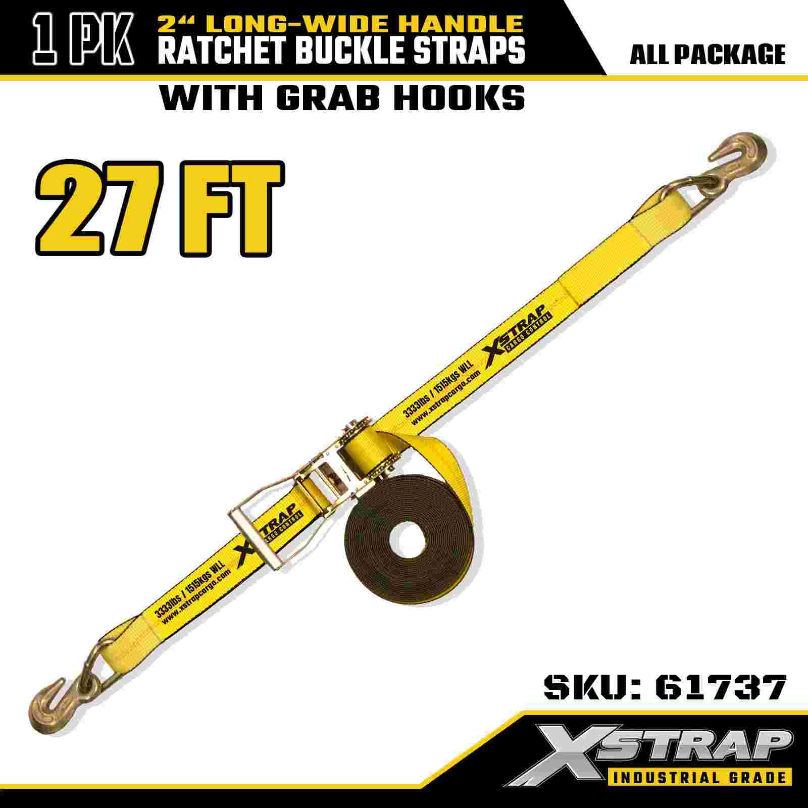 Xstrap 61737 Heavy Duty, 2 дюйма x 27 футов, 1 шт. Ремень с храповым механизмом и захватными крючками, желтый, рабочая нагрузка 3333 фунта, длинный ремень с храповым механизмом с широкой ручкой для машин и оборудования