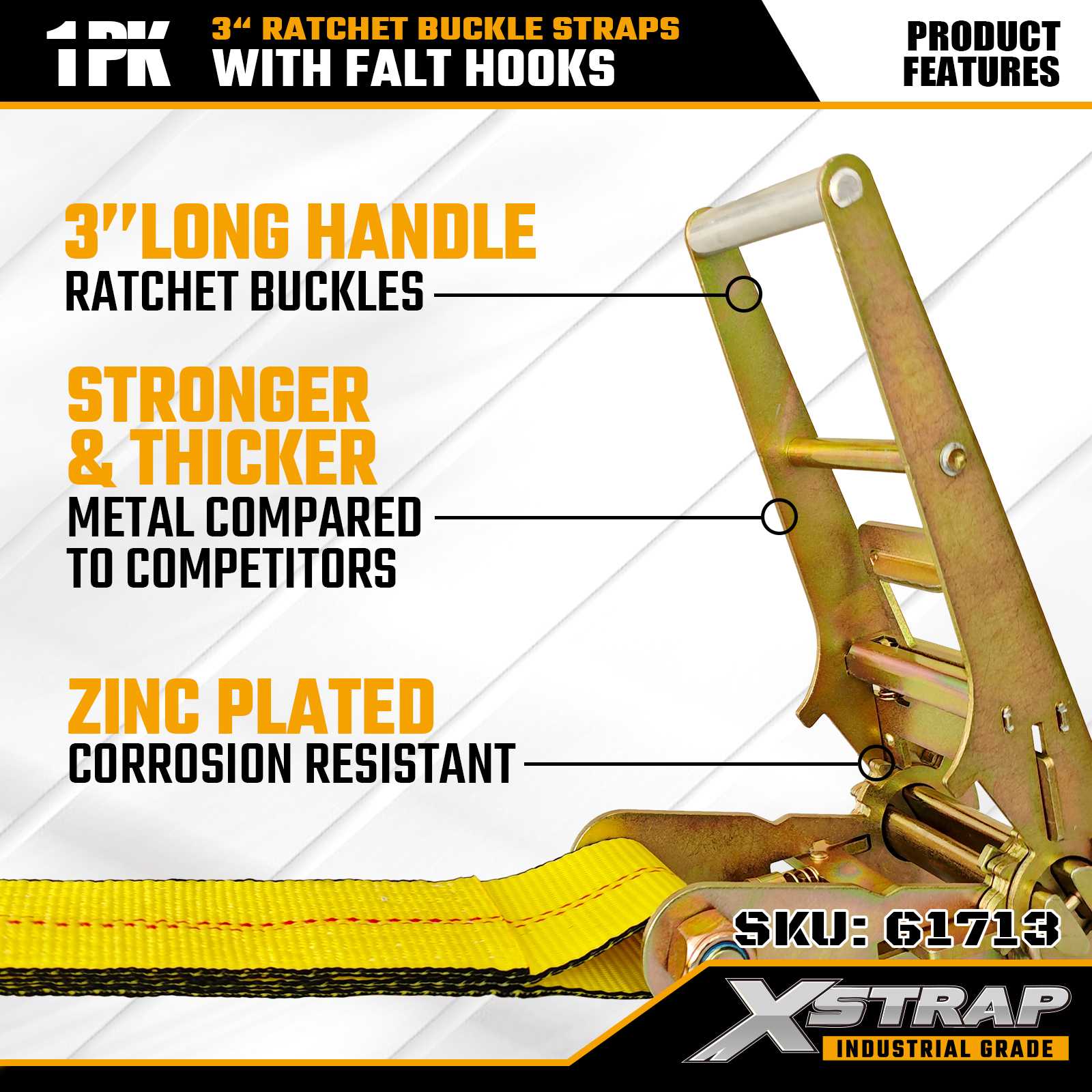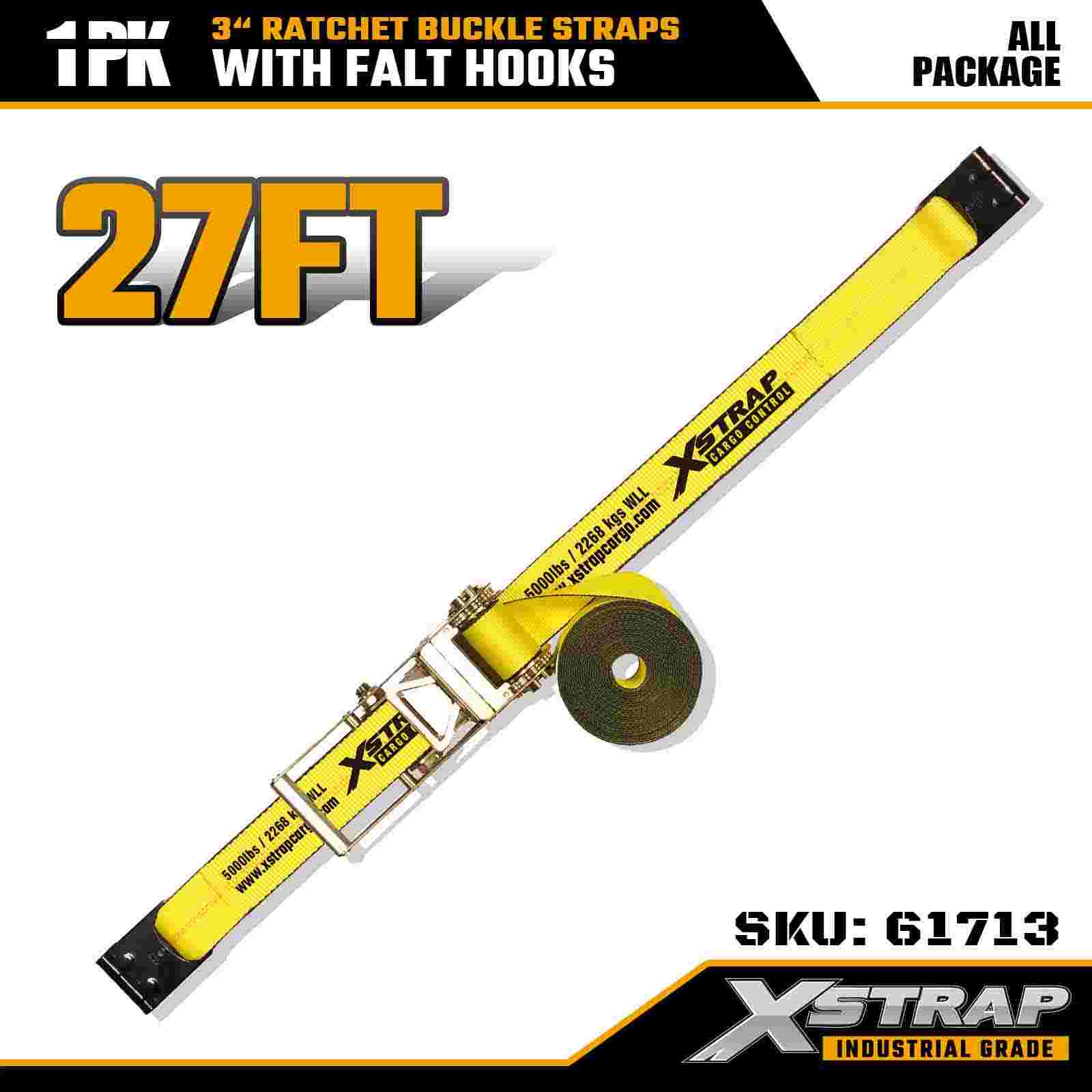 Xstrap 61713 Ремни с пряжкой с храповым механизмом размером 3 x 27 футов (1 упаковка) Плоские крючки, грузоподъемность 5 000 фунтов, прочность на разрыв 15 000 фунтов, усиленное крепление для грузовиков, прицепов и промышленного грузового транспорта.
