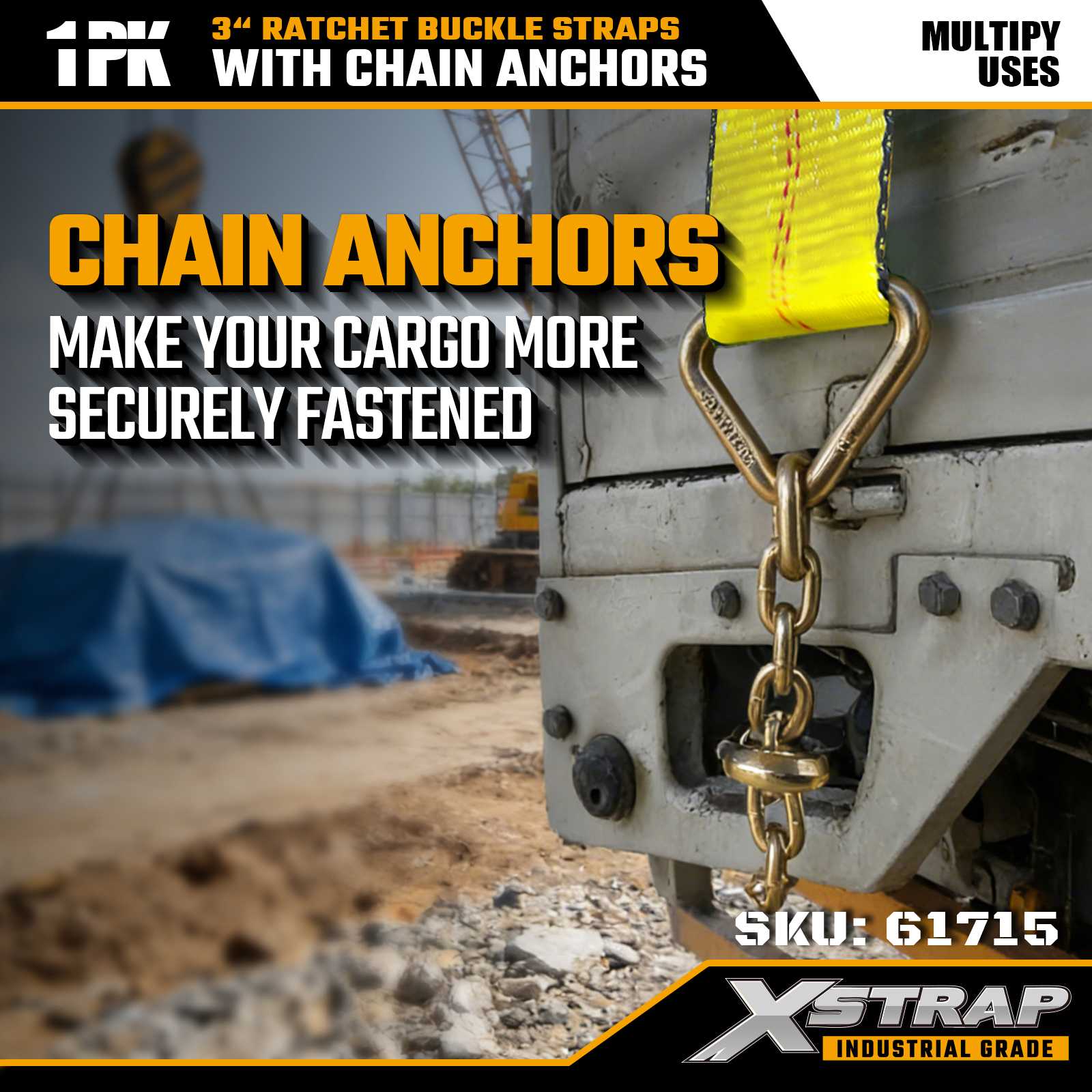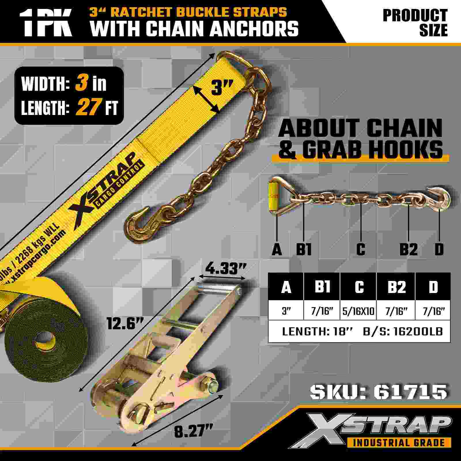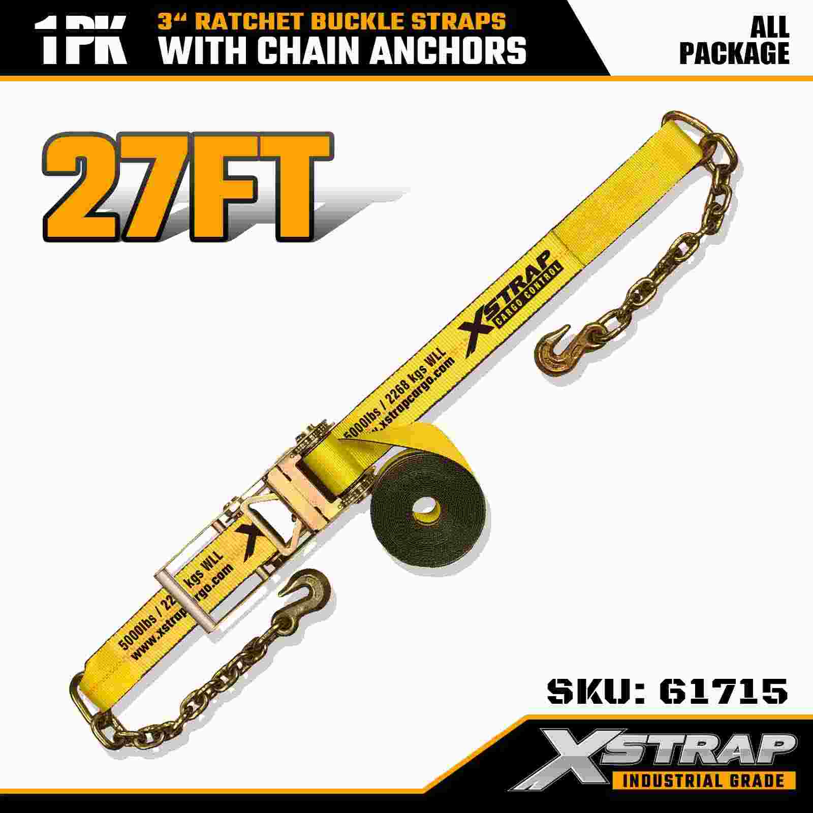 Xstrap 61715 Ремни с пряжкой с храповым механизмом размером 3 x 27 футов (1 упаковка) — якоря цепи, грузоподъемность 5000 фунтов, прочность на разрыв 15000 фунтов. Эти ремни, предназначенные для контроля тяжелых грузов, сочетают в себе лямки промышленного класса с концами якоря цепи для максимальной безопасности в грузовиках, прицепах и строительном транспорте.