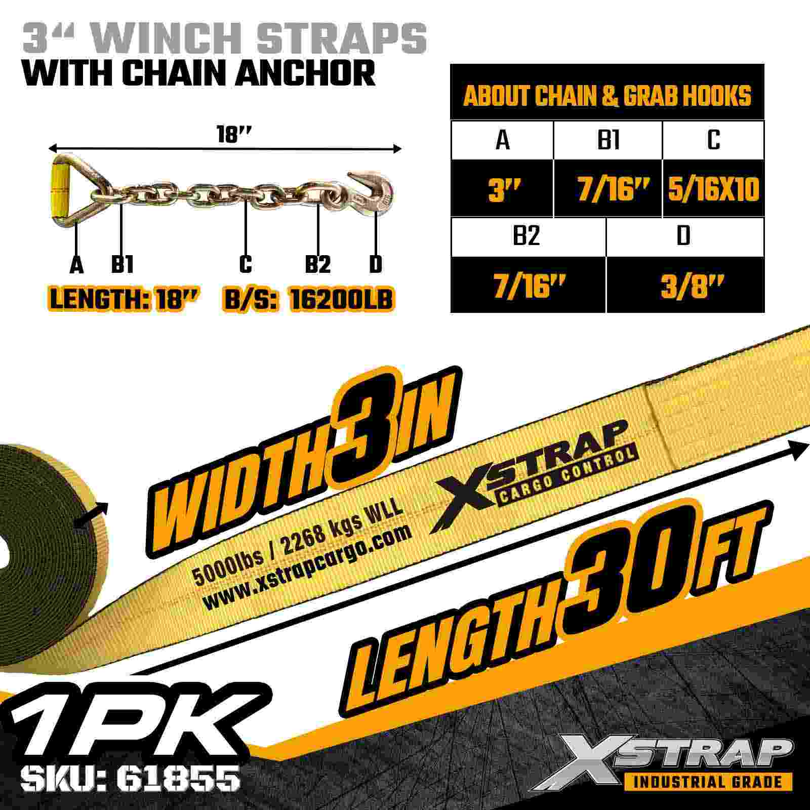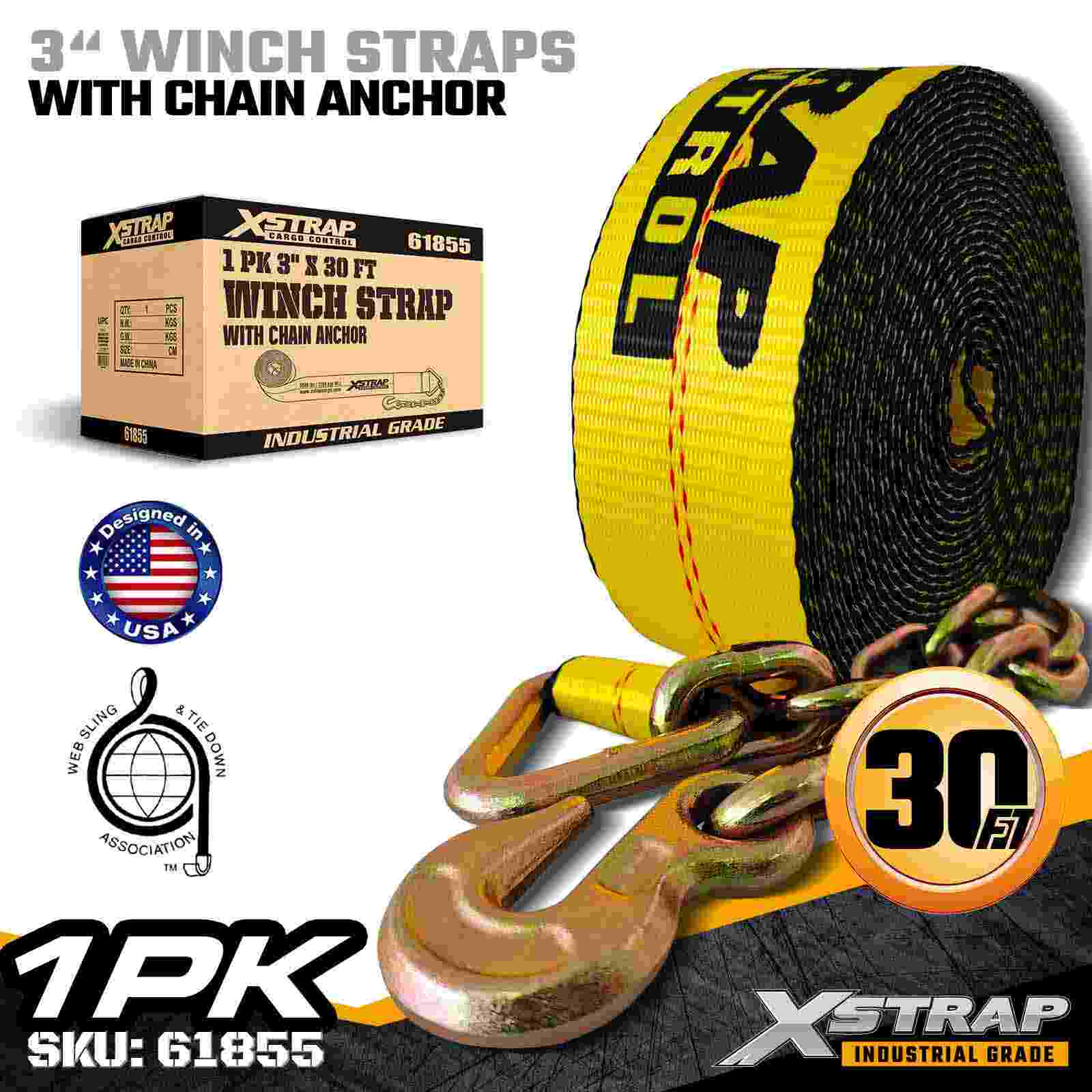 Стандартный ремень для лебедки 3 дюйма × 30 футов с цепным якорем