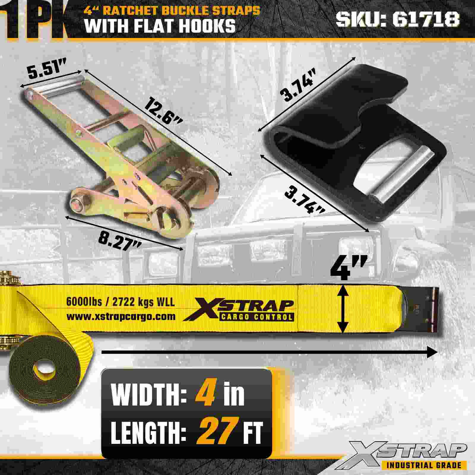 - Лента длиной 27 футов для универсального применения при перевозке грузов. Ремень длиной 27 футов обеспечивает достаточный радиус действия для крепления больших, широких или связанных грузов, таких как пиломатериалы, стальные трубы, машины и товары на поддонах.