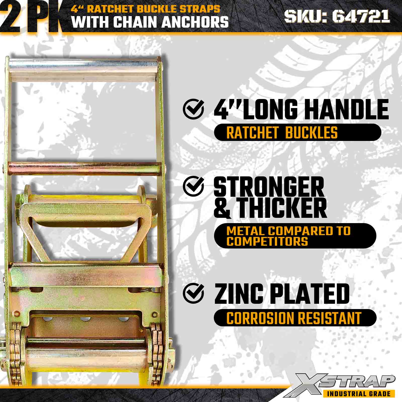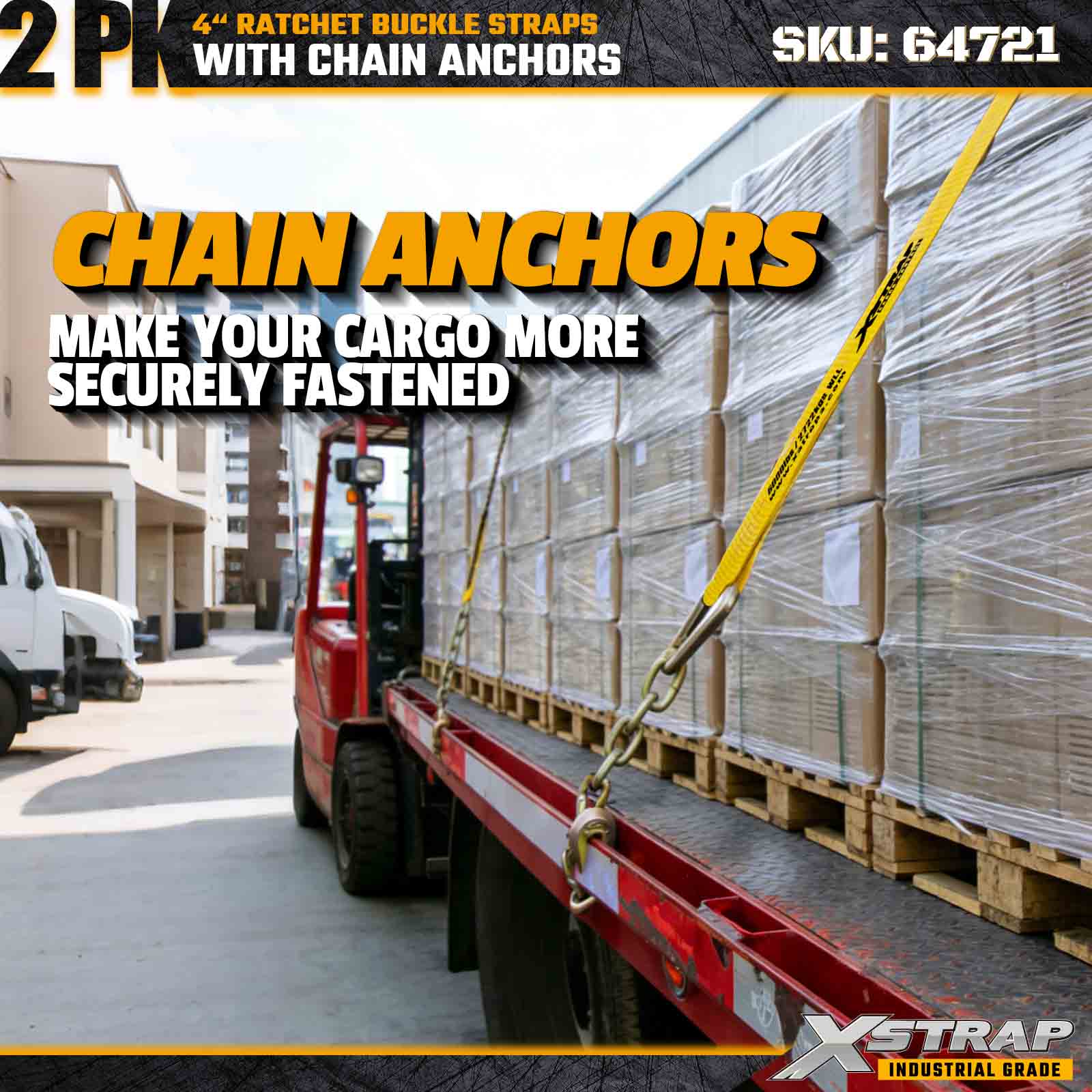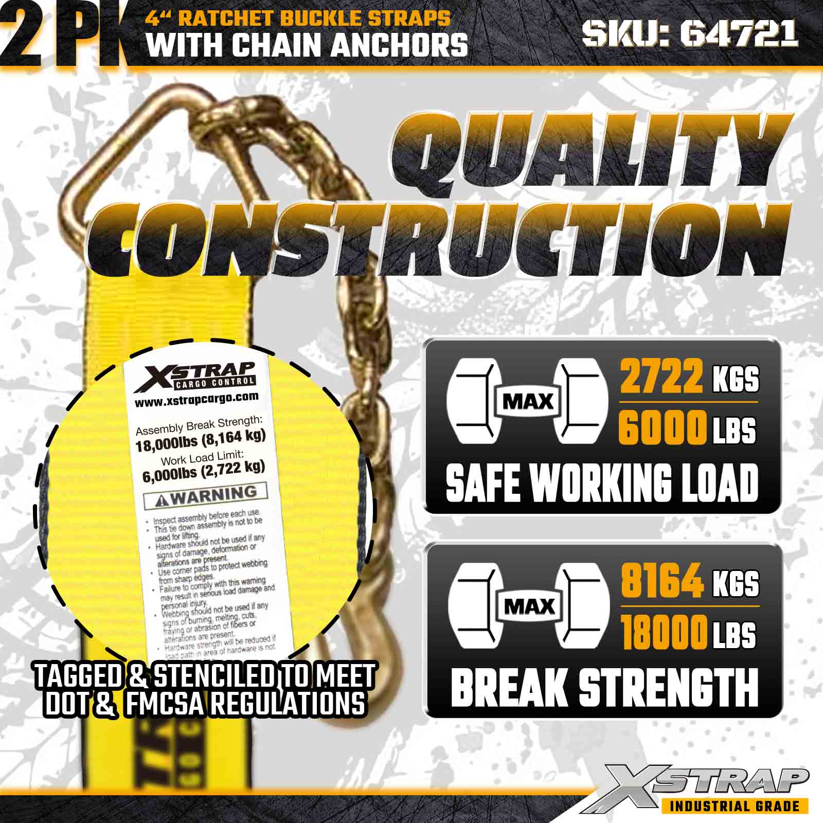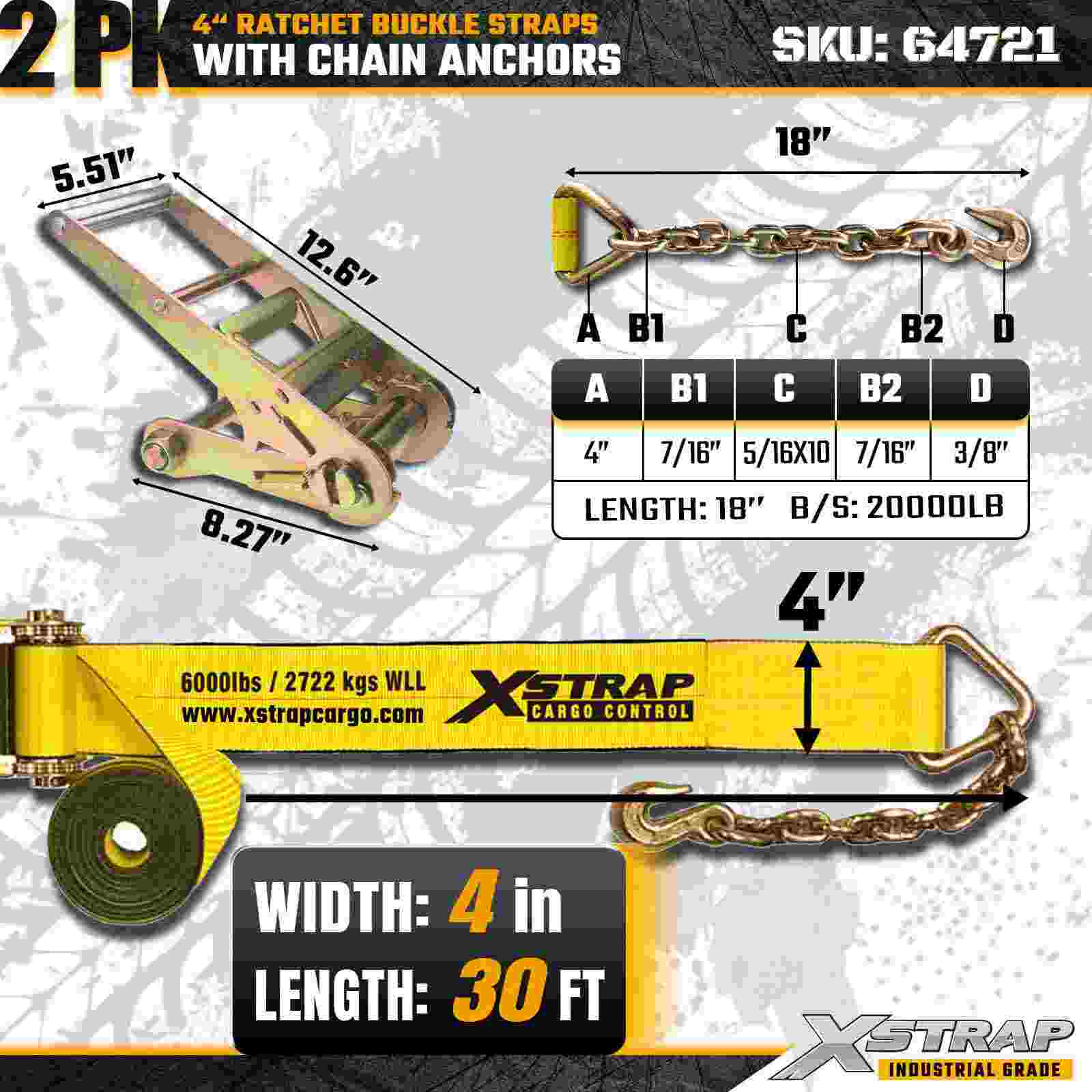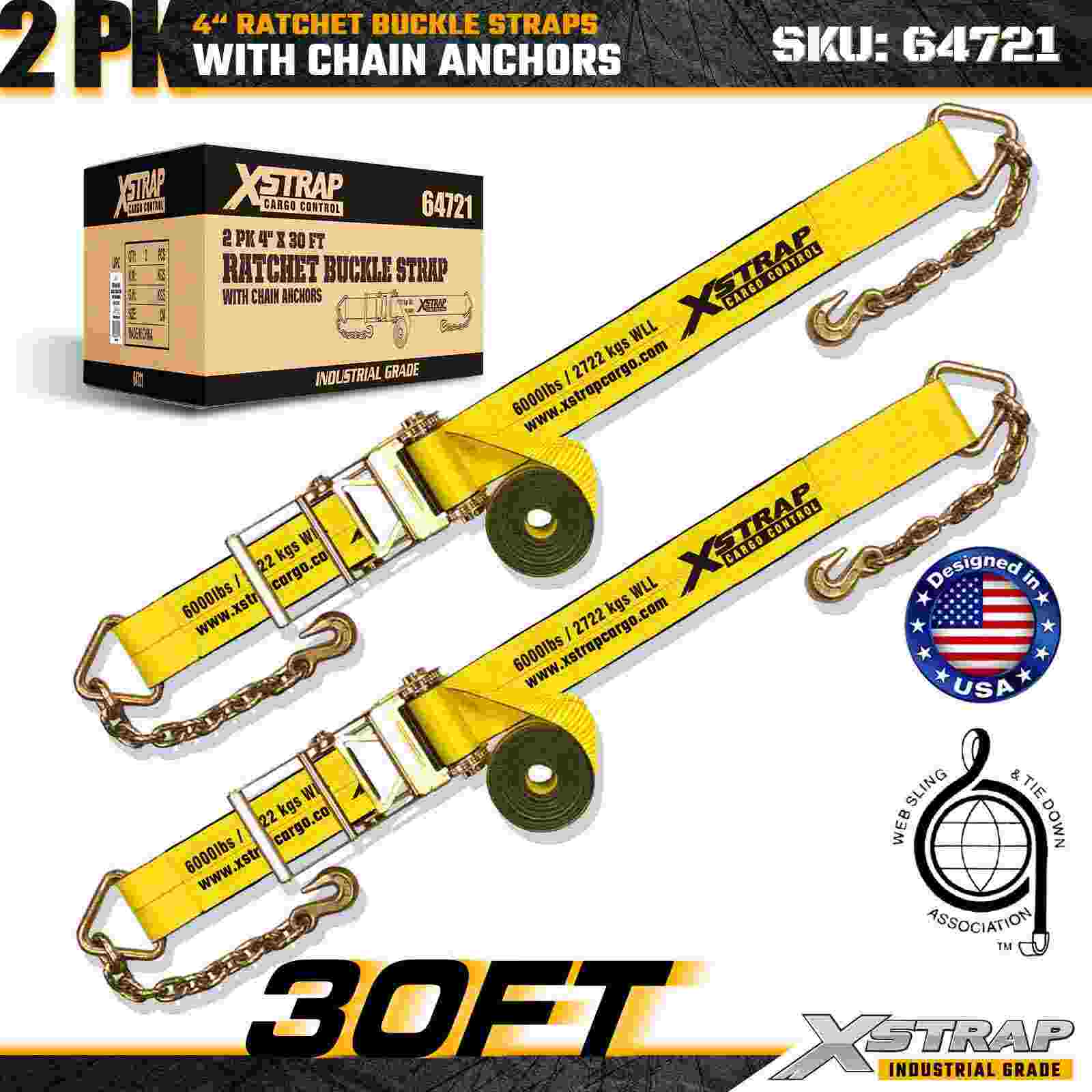 Ремни Xstrap 64721 с храповым механизмом размером 4 дюйма × 30 футов (2 шт.) разработаны для крепления тяжелых грузов и оснащены прочными цепными анкерами и усиленным храповым механизмом. Благодаря пределу рабочей нагрузки 6000 фунтов и прочности на разрыв 18 000 фунтов эти ремни идеально подходят для бортовой перевозки, транспортировки машин, стальных грузов и промышленных грузов, требующих максимальной прочности и надежности.