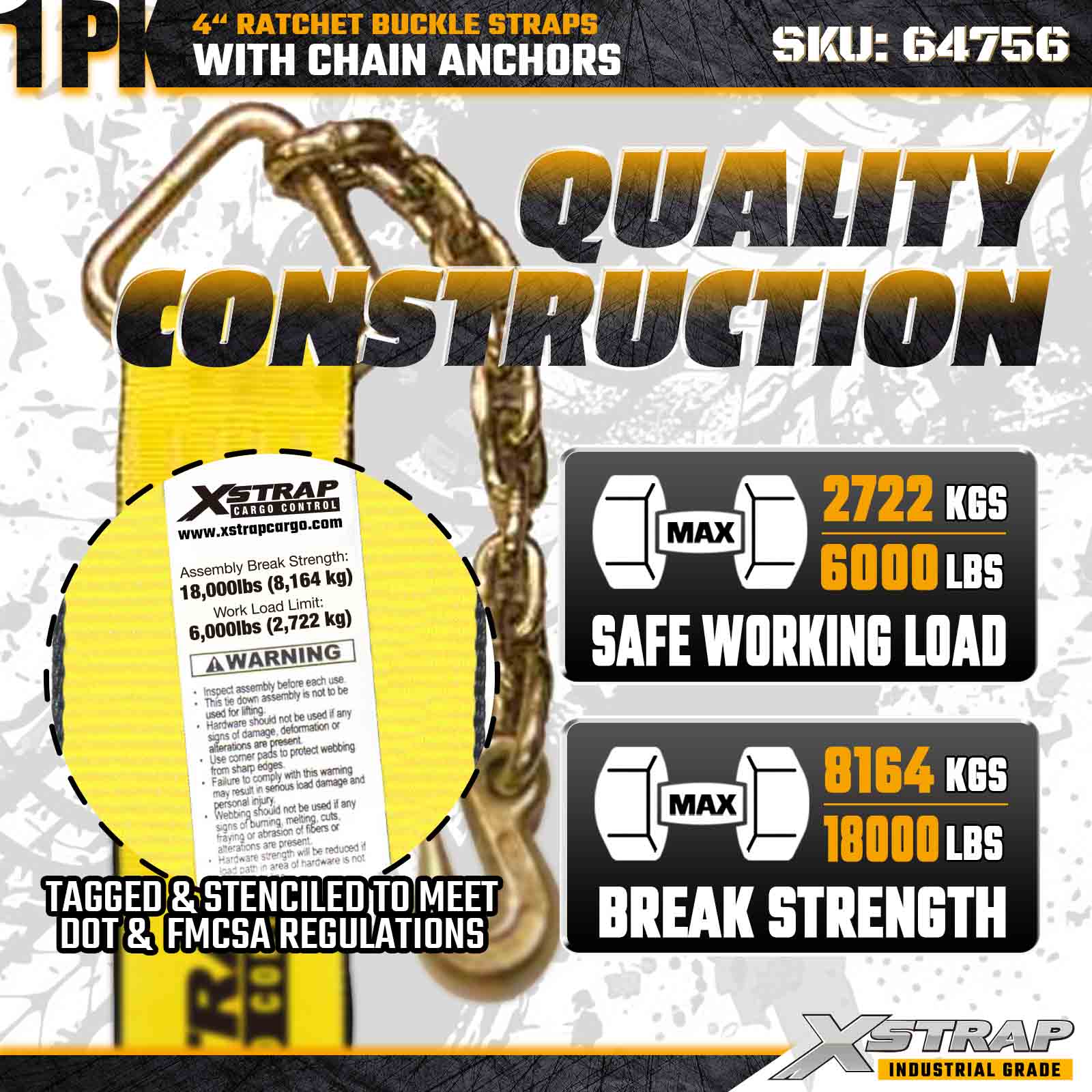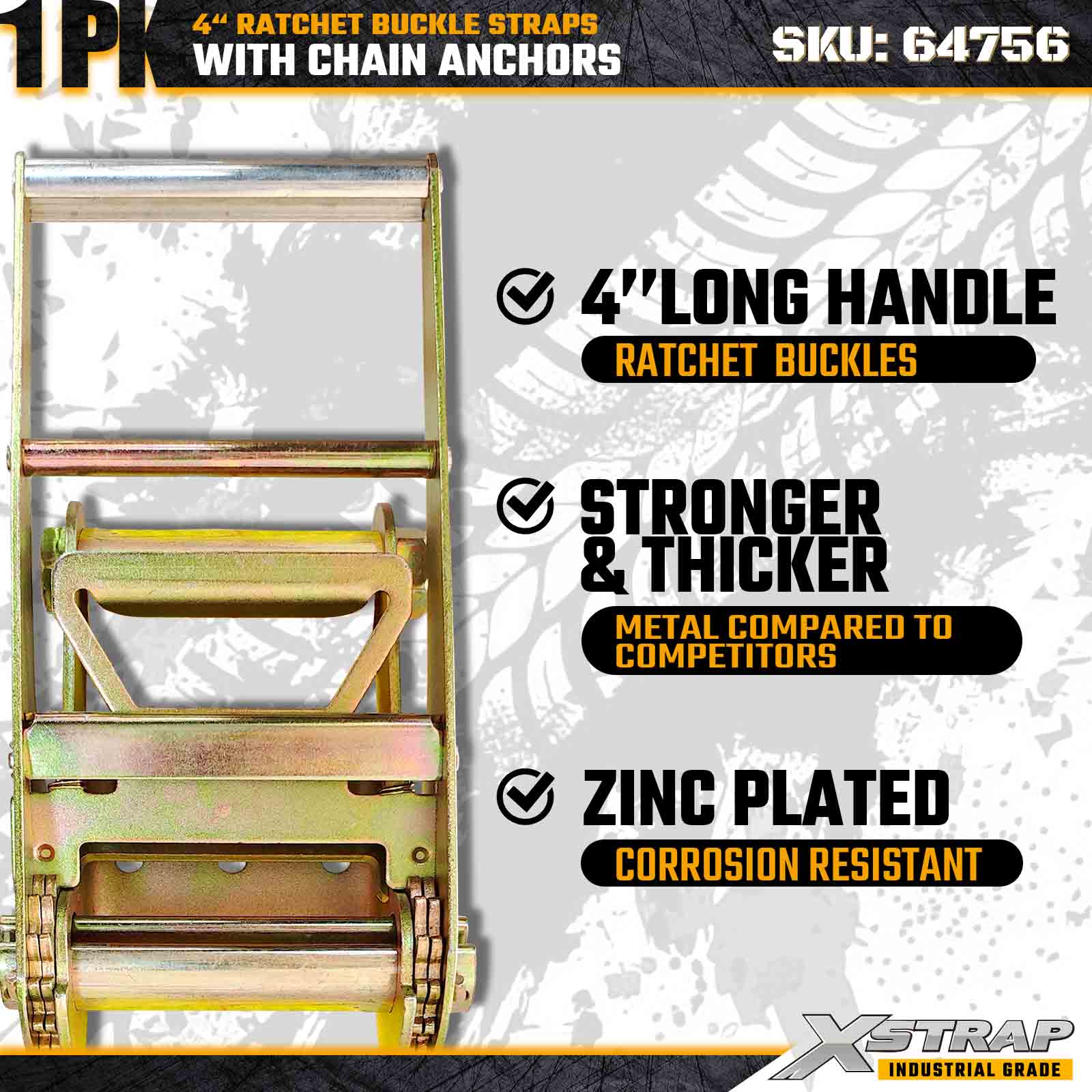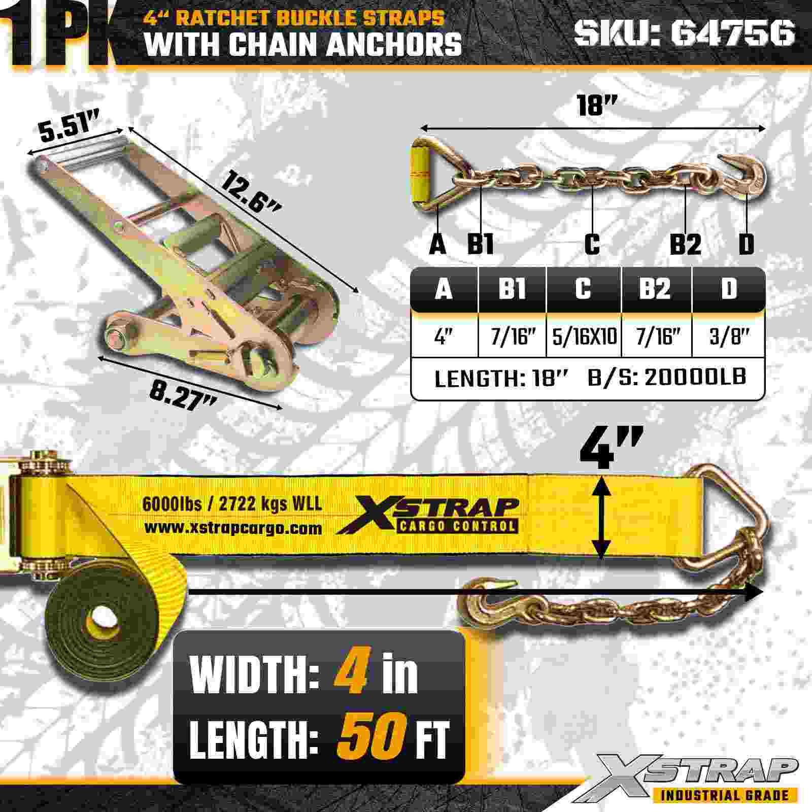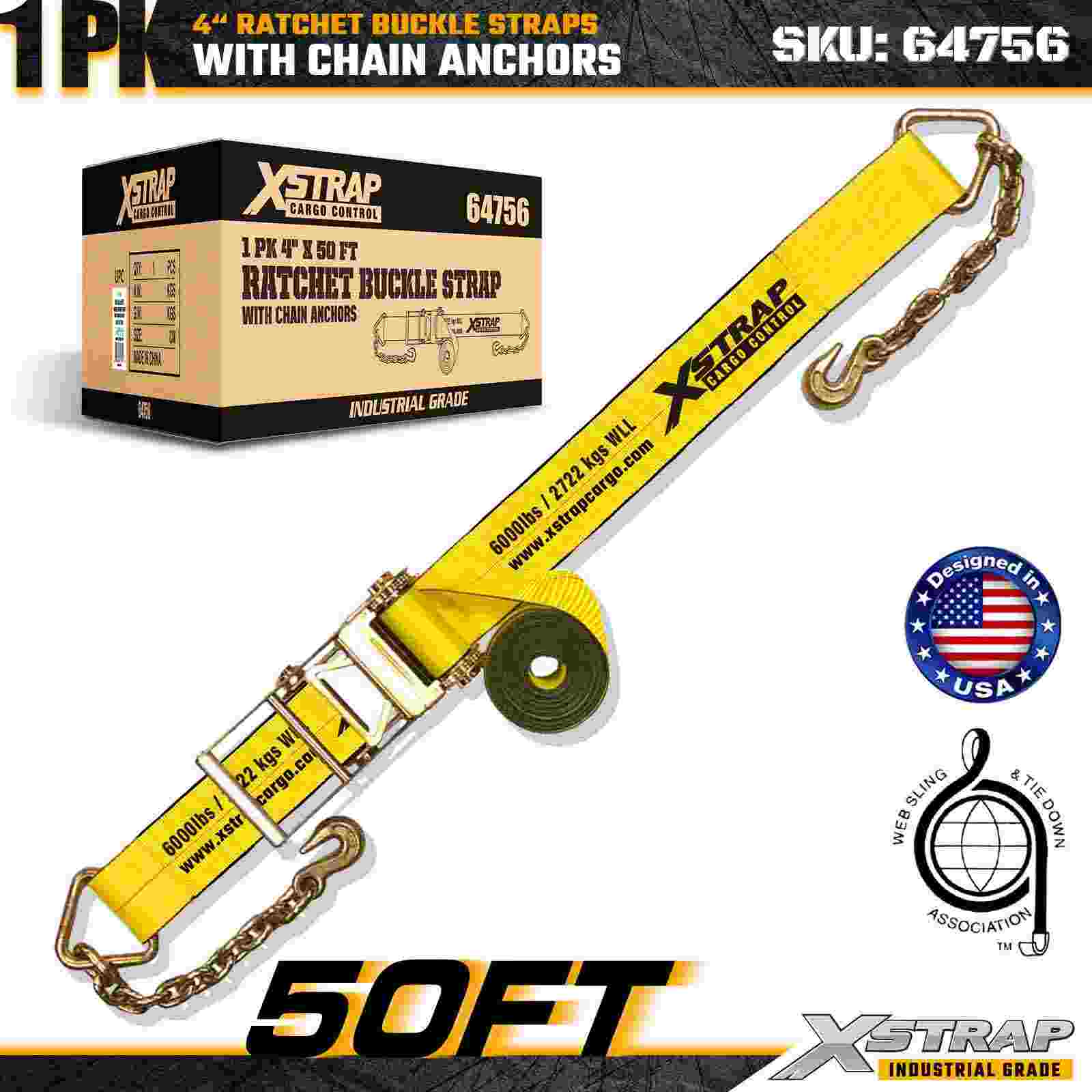 Xstrap 64756 Ремень с храповой пряжкой, 4 дюйма × 50 футов, с цепными якорями. Прочность на разрыв 18 000 фунтов (1 упаковка)
