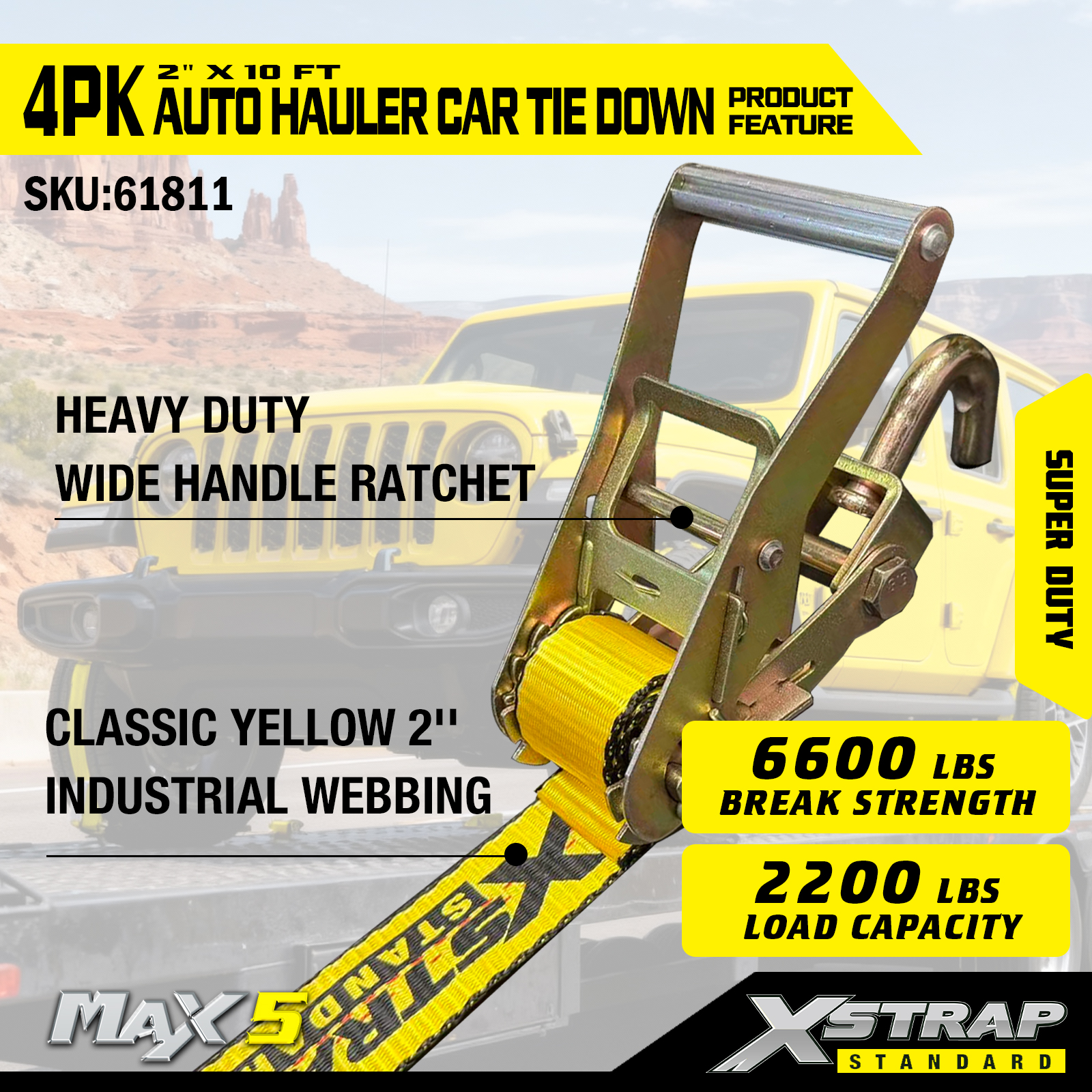 - Сверхмощные характеристики: каждый ремень рассчитан на безопасную рабочую нагрузку 2200. Безопасная рабочая нагрузка указана на предупреждающей табличке каждого крепежного ремня для облегчения проверки. Он создан для работы с тяжелыми транспортными средствами и сложными транспортными сценариями.