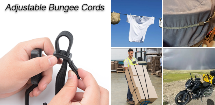 Регулируемые банджи-шнуры обеспечивают повышенную устойчивость и снижают вероятность зацепиться за предметы. Они универсальны и подходят для широкого спектра применений, включая оборудование, организацию хранения, привязку багажа или брезента, защиту уличного снаряжения, сада, гаража или путешествий.