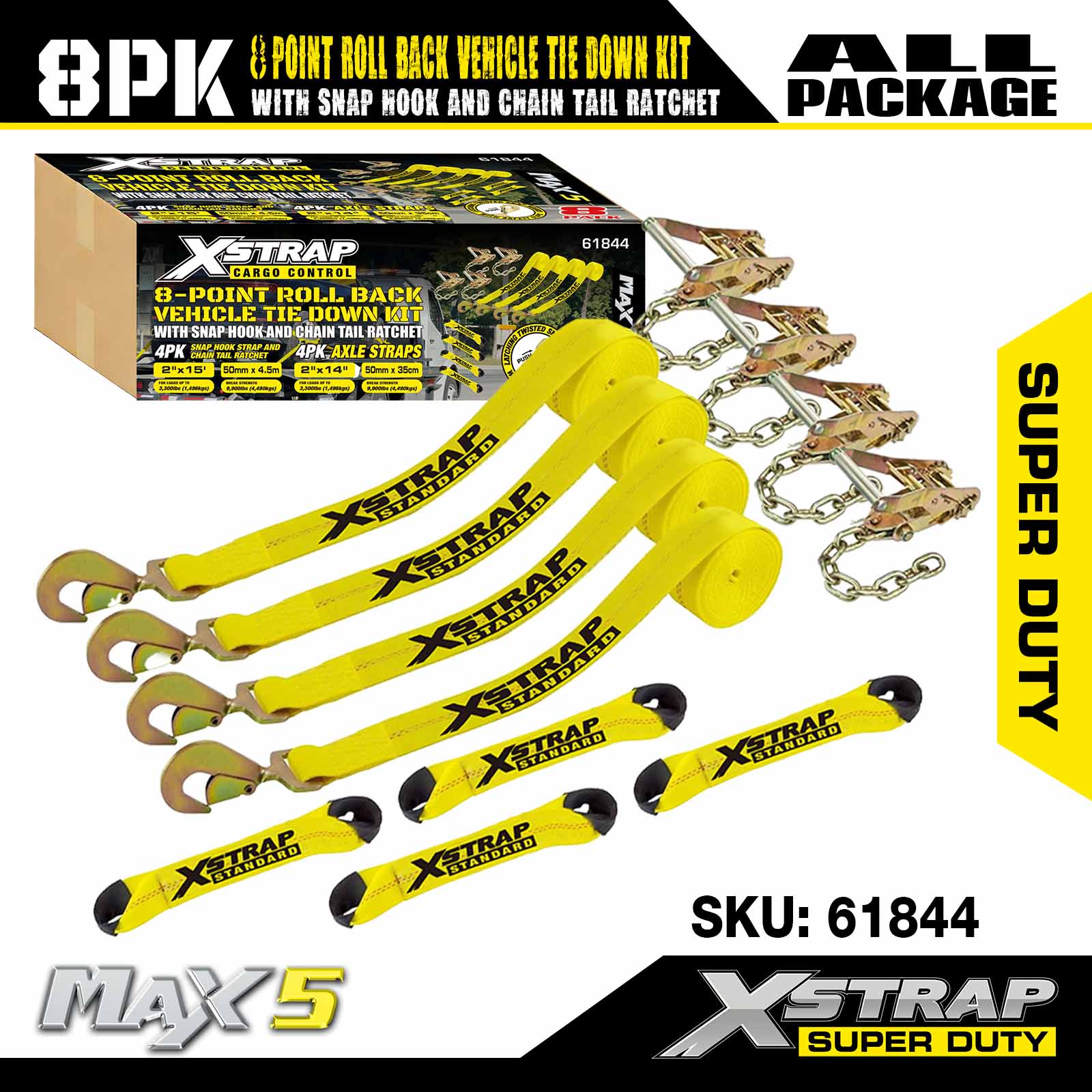 8-точечный комплект крепления автомобиля Xstrap с карабинами и храповым механизмом на обоих концах — набор из 4 штук — классический желтый