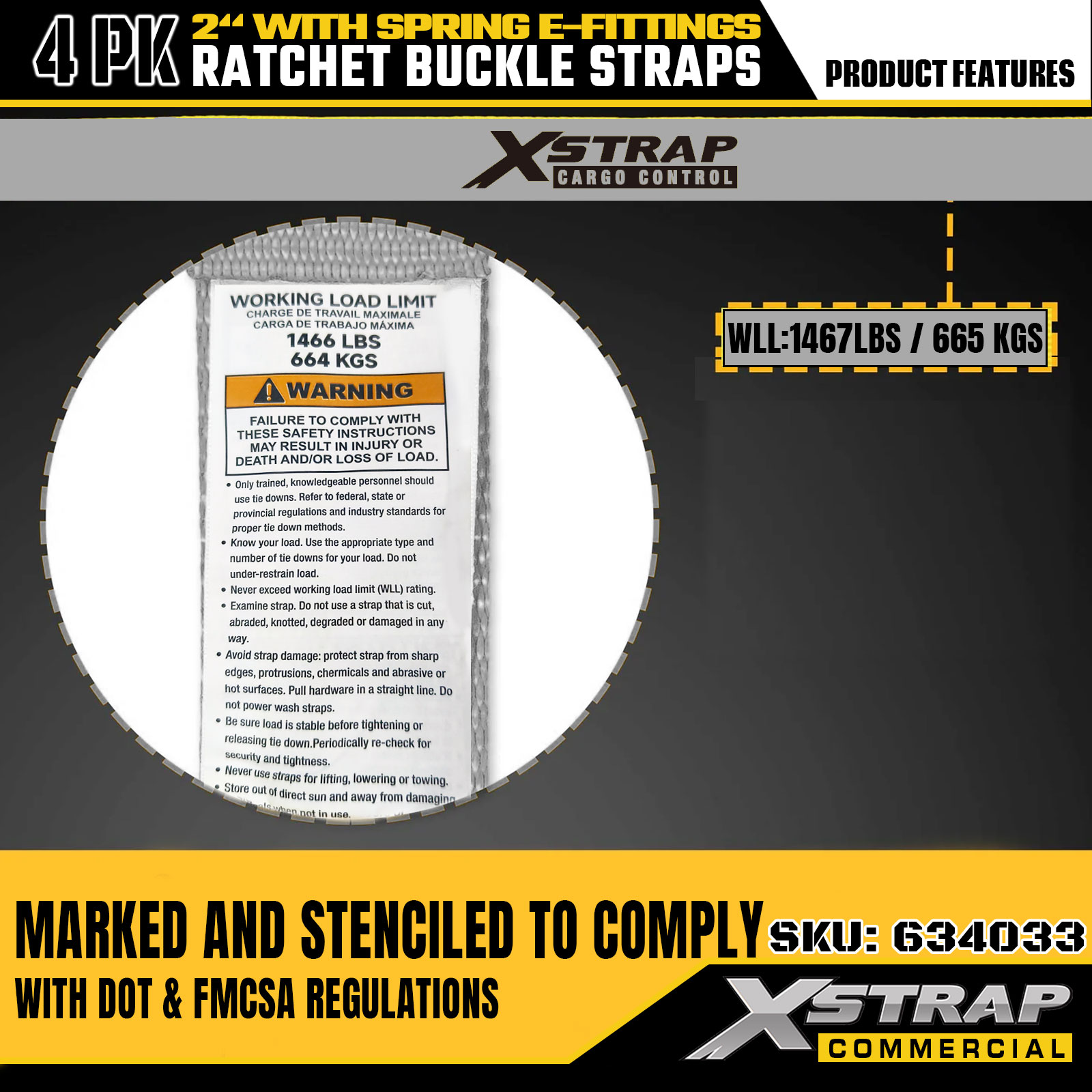 - 1467LBS SWL и 4401LBS Прочность на разрыв Каждый ремень имеет безопасную рабочую нагрузку SWL 1467 фунтов и максимальную прочность на разрыв 4401 фунт, что обеспечивает надежную несущую способность для управления тяжелыми грузами. Четкая маркировка безопасности предотвращает перегрузку и обеспечивает безопасную транспортировку грузовых автомобилей, косилок, квадроциклов и генеральных грузов.