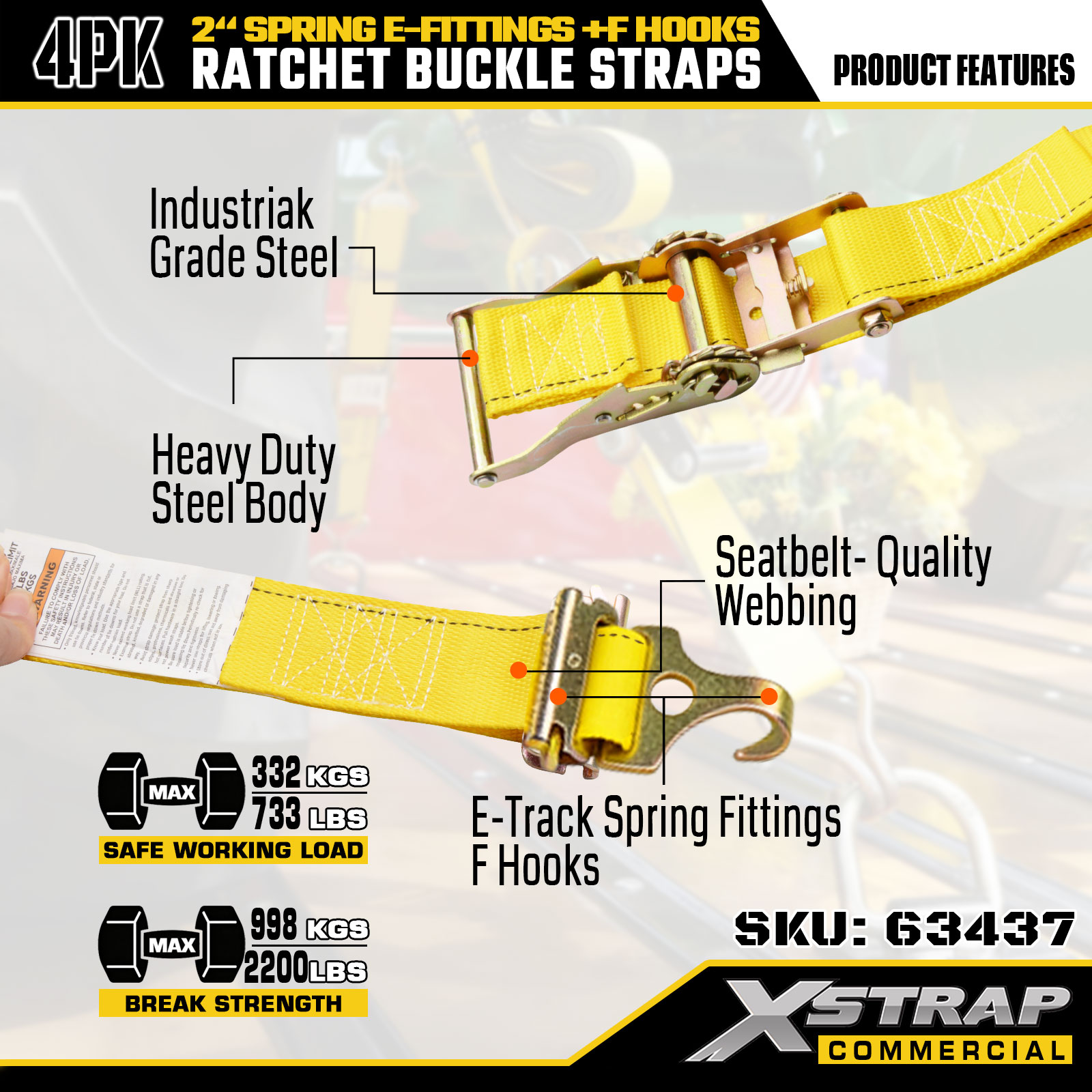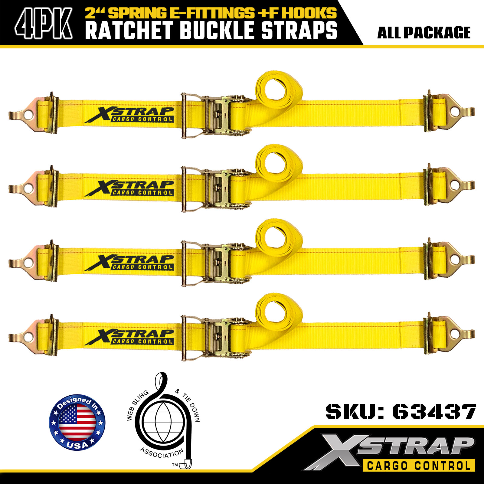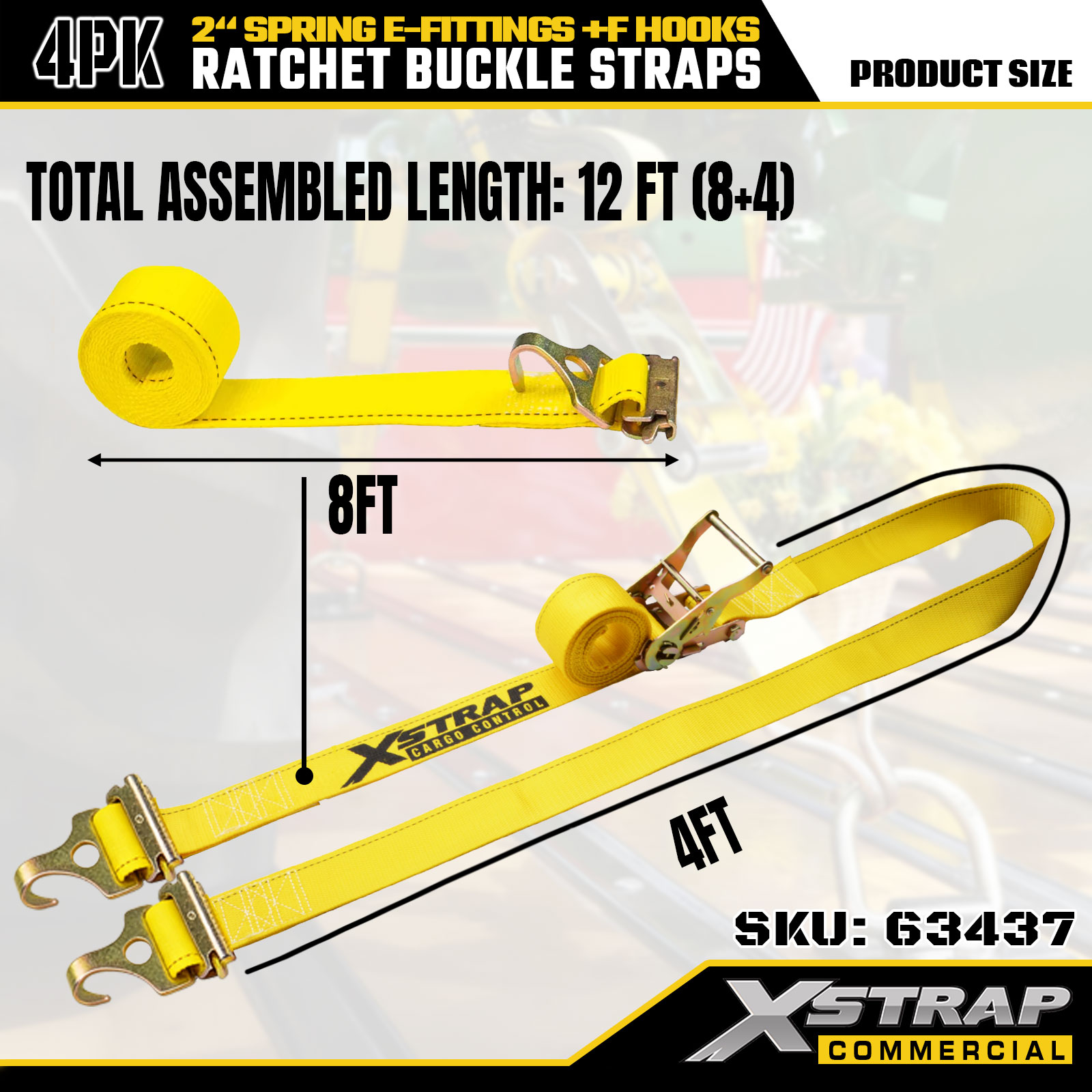 Xstrap, 4 комплекта сверхмощных стяжных ремней с храповым механизмом, высокопрочный полиэстер 2 x 12 футов с пружинными фитингами E и F-образными крючками, тяжелые грузовые стяжки 733 фунта для прицепов, грузовиков, фургонов и мотоциклов