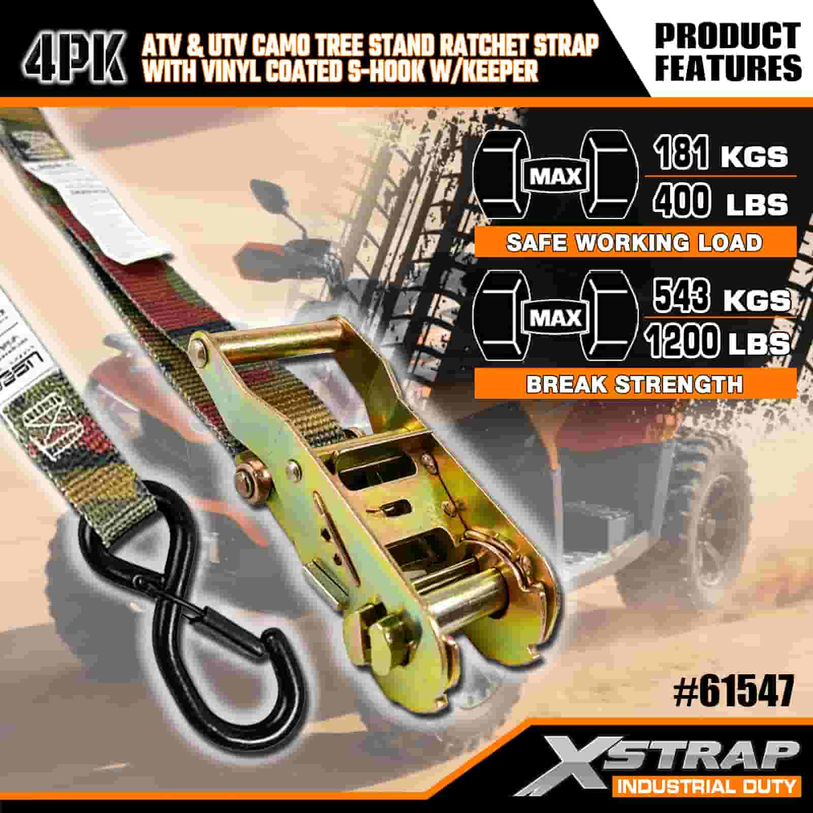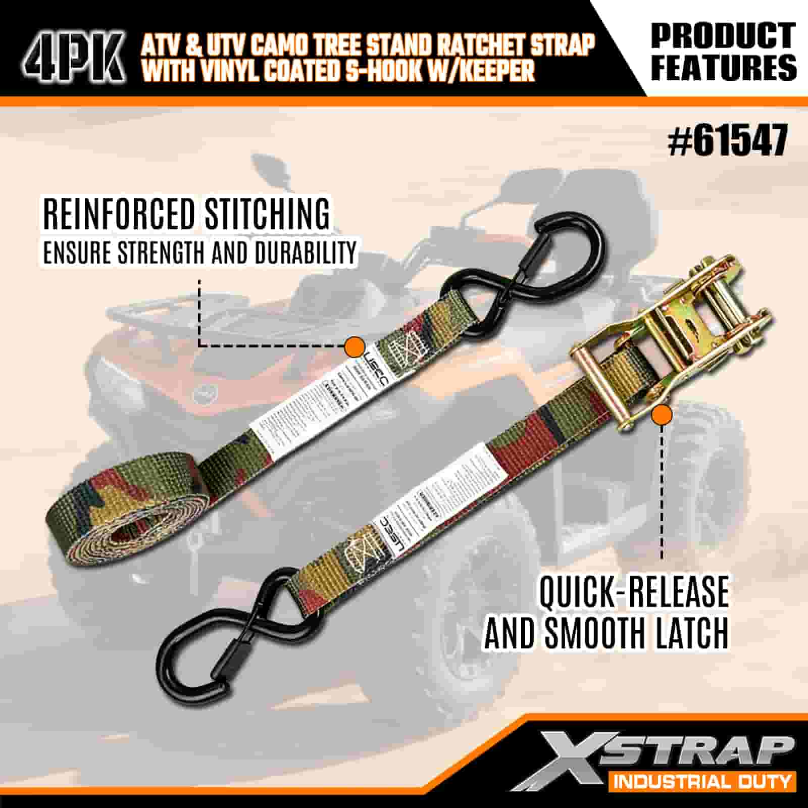 - Скрытый дизайн, бескомпромиссная прочность: камуфляжный рисунок идеально сочетается с лесной местностью, а усиленные строчки и прочная храповая система фиксируют ваш квадроцикл, подставку для дерева или мотоцикл на месте. Больше не нужно беспокоиться о перемещении груза на неровных дорогах или грязных тропах.