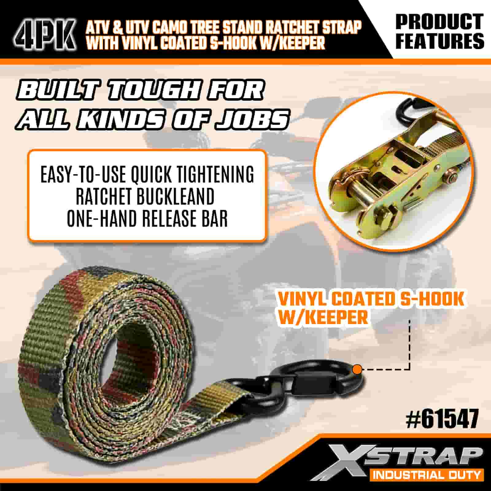 - Устойчивость к атмосферным воздействиям и царапинам: S-образные крючки с виниловым покрытием предотвращают появление царапин на вашем автомобиле или подставке для дерева, а устойчивый к коррозии храповой механизм выдерживает дождь, снег и влагу. Камуфляжная лента устойчива к ультрафиолетовому излучению и истиранию, поэтому остается прочной сезон за сезоном.