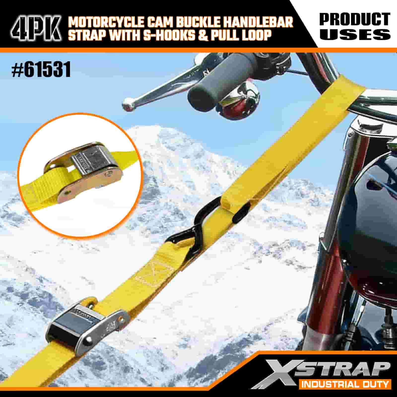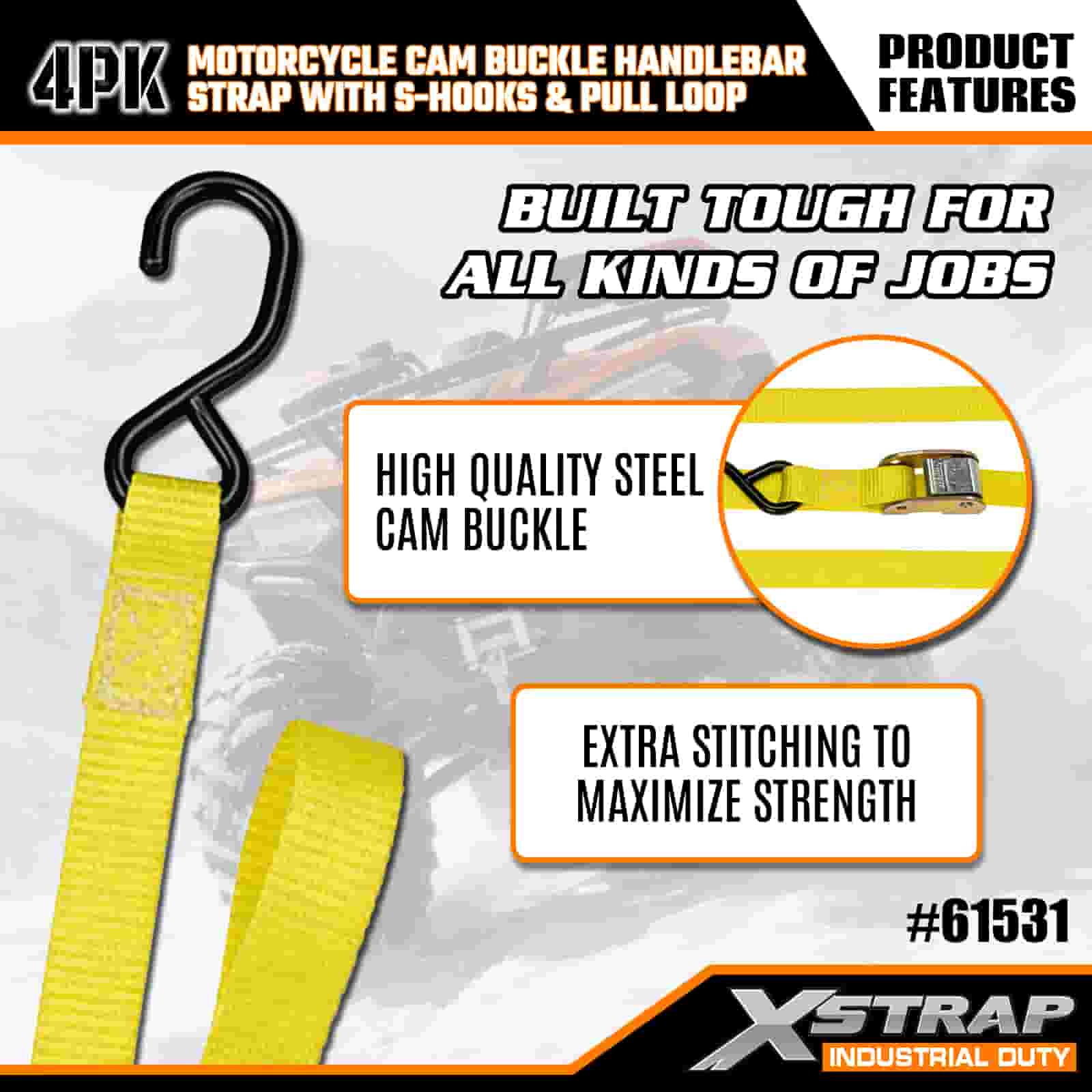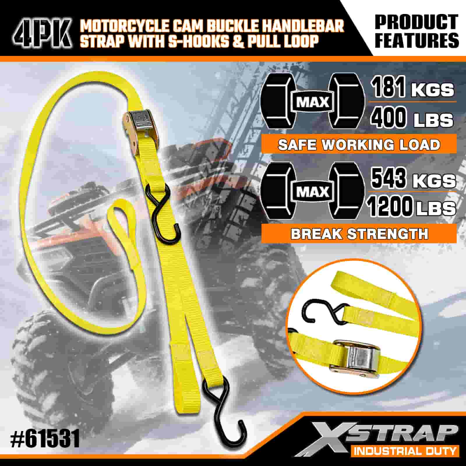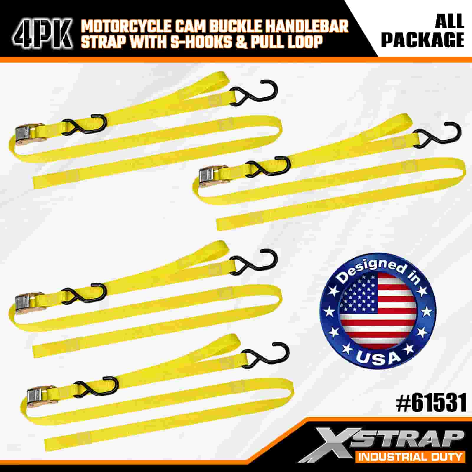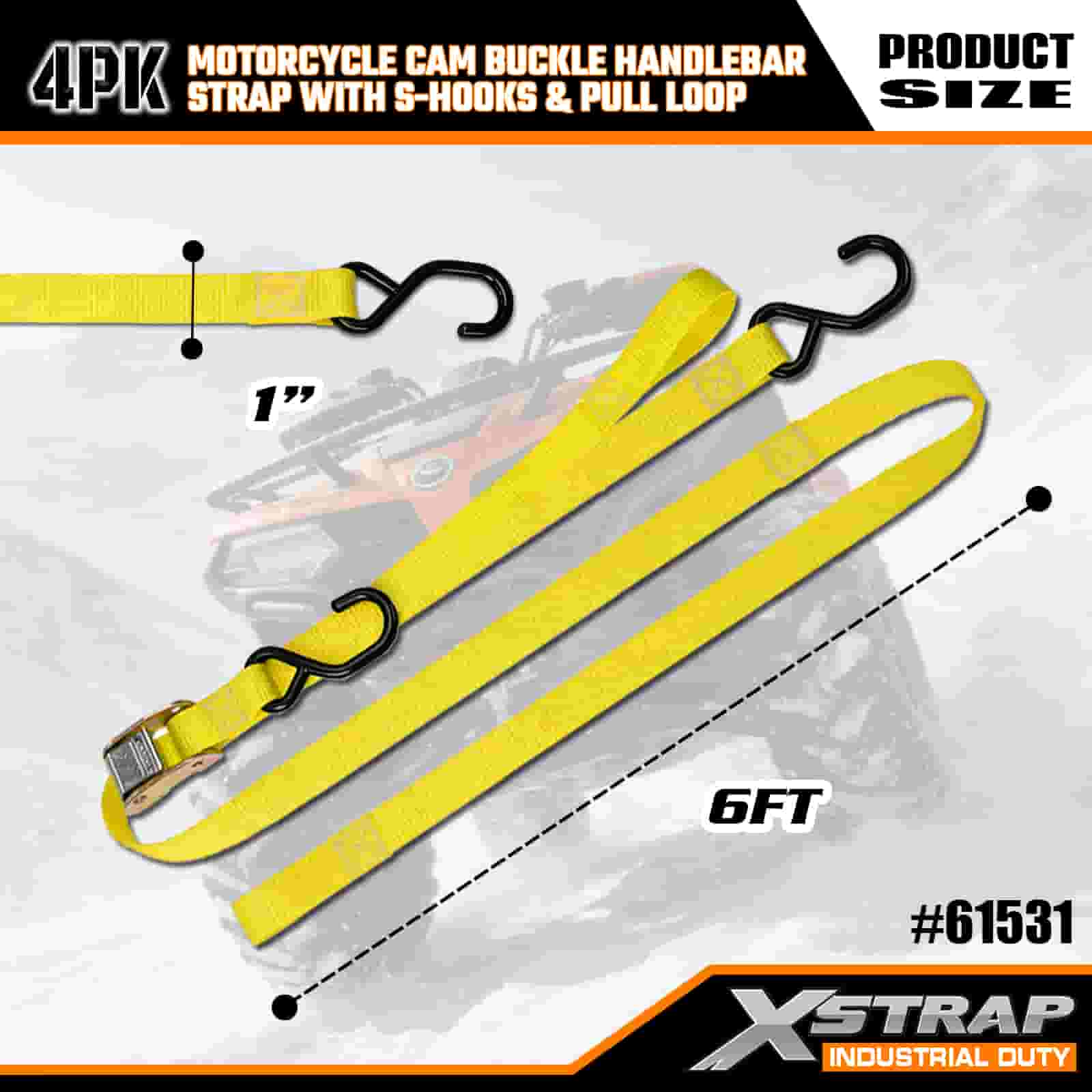 Xstrap 4PK Ремень на руль мотоцикла с пряжкой S-образной формы и петлей для вытягивания, полиэстеровый стяжной ремень 1 x 6 футов, ремень с пряжкой Cam, грузоподъемность 400 фунтов. Крепежные ремни для крепления груза с S-образными крючками для серьезных профессионалов для закрепления грузового прицепа, прицепа с плоской платформой, лыжной лодки, небольшого автомобиля.