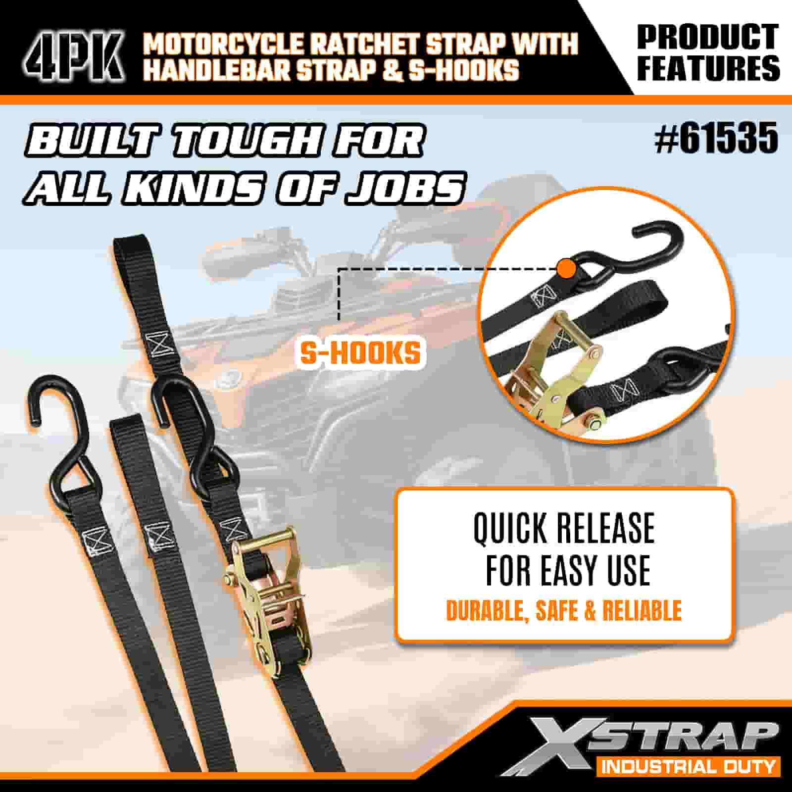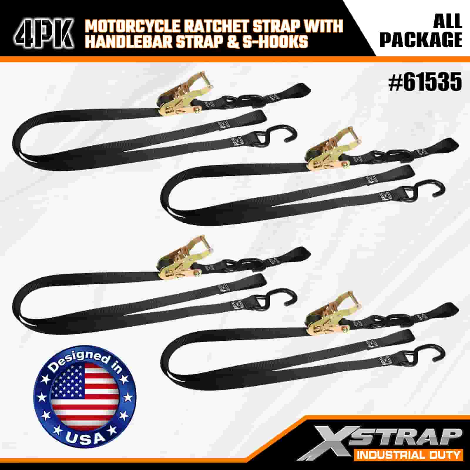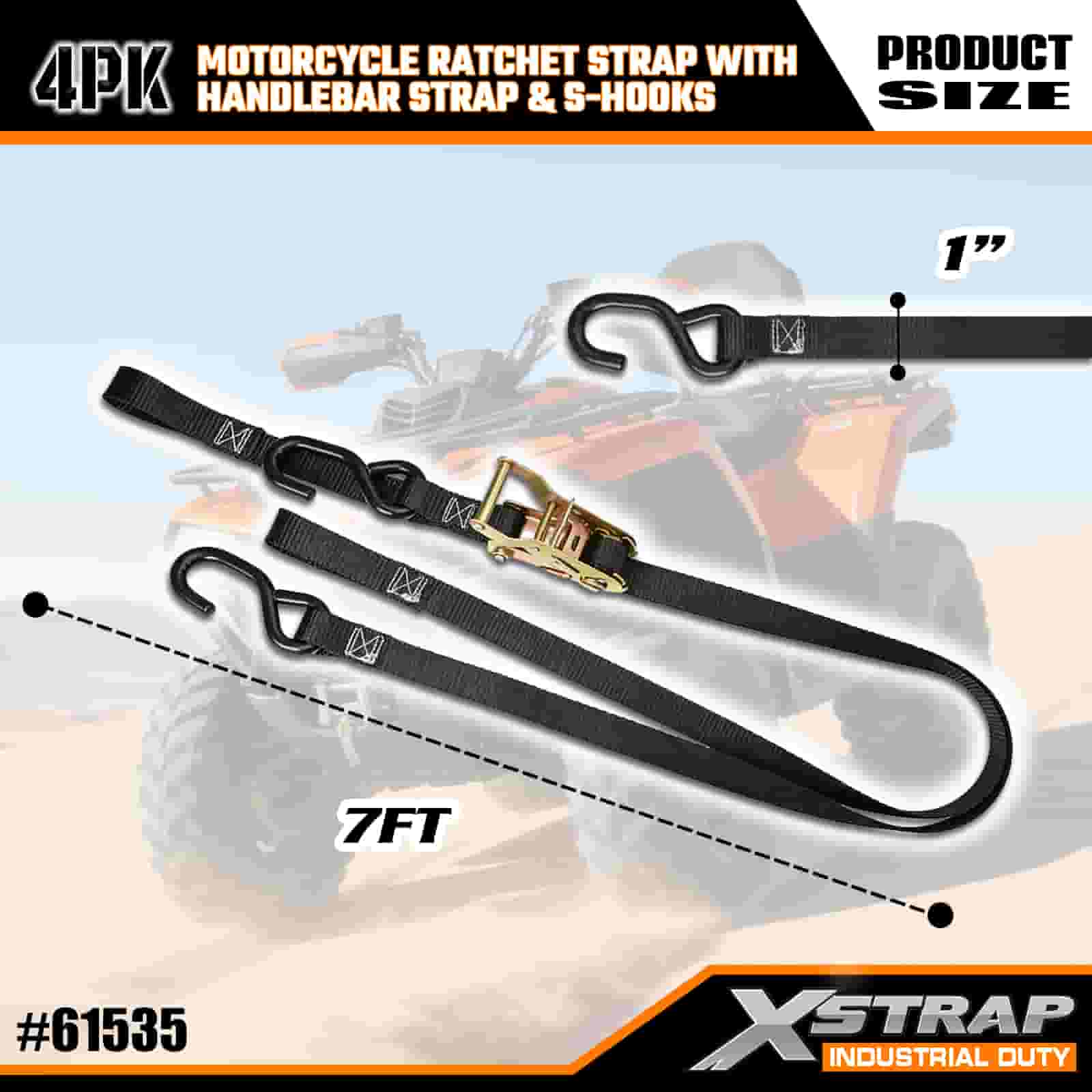 Ремень Xstrap 4PK с храповым механизмом для мотоцикла, ремнем на руль и S-образными крючками, полиэстеровый стяжной ремень 1 x 7 футов, тянущий ремень с храповым механизмом, грузоподъемность 833 фунта. Крепежные ремни для крепления груза с S-образным крючком для серьезных профессионалов для крепления грузового прицепа, прицепа с плоской платформой, лыжной лодки, небольшого автомобиля.