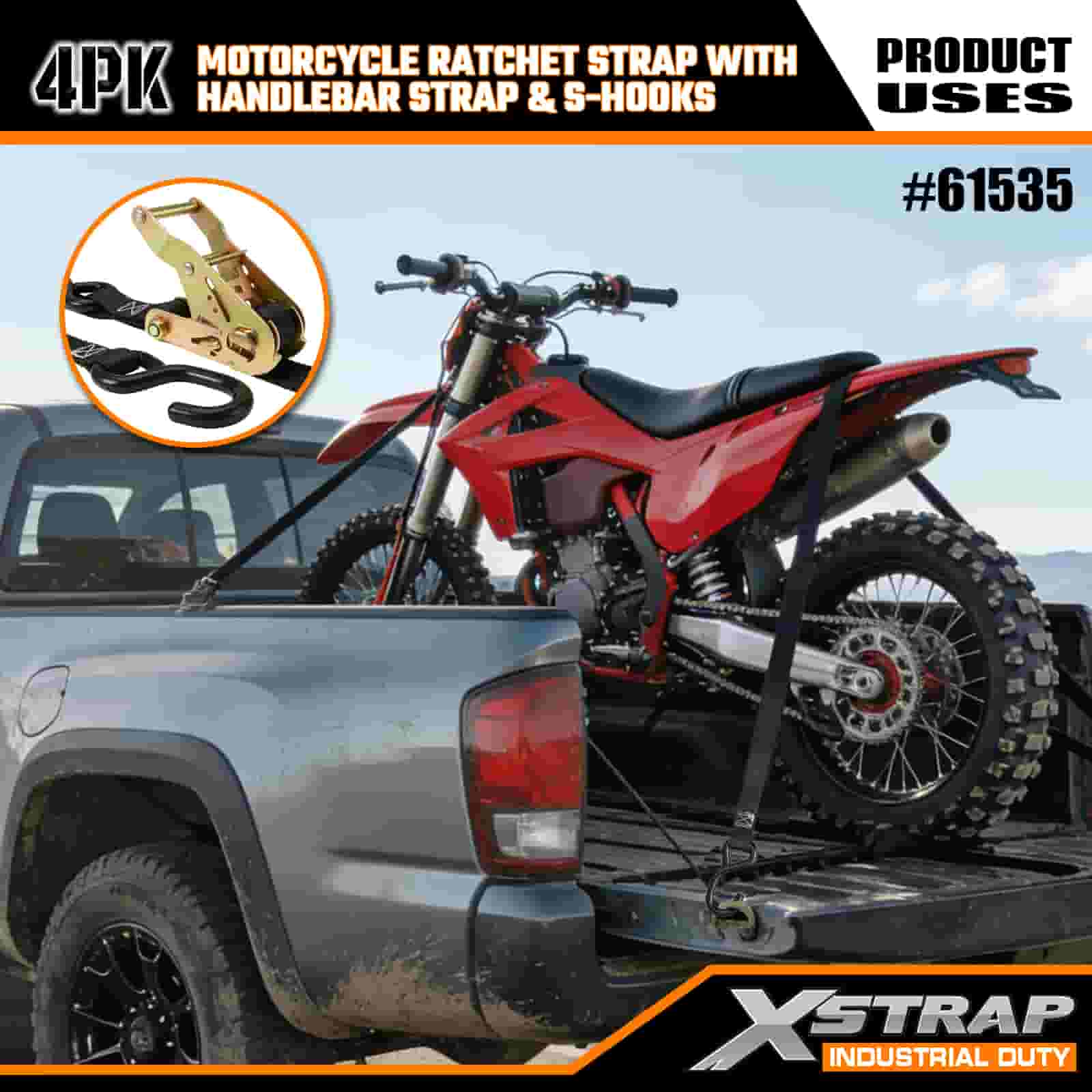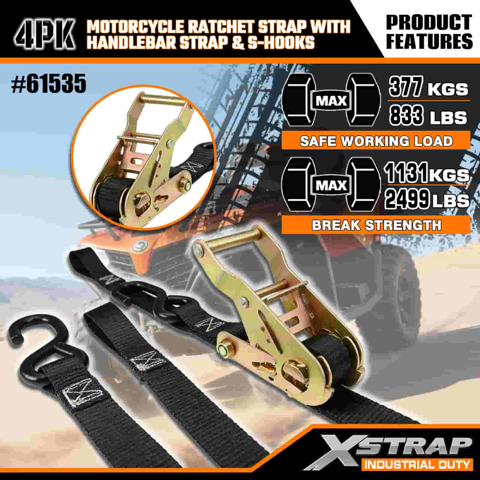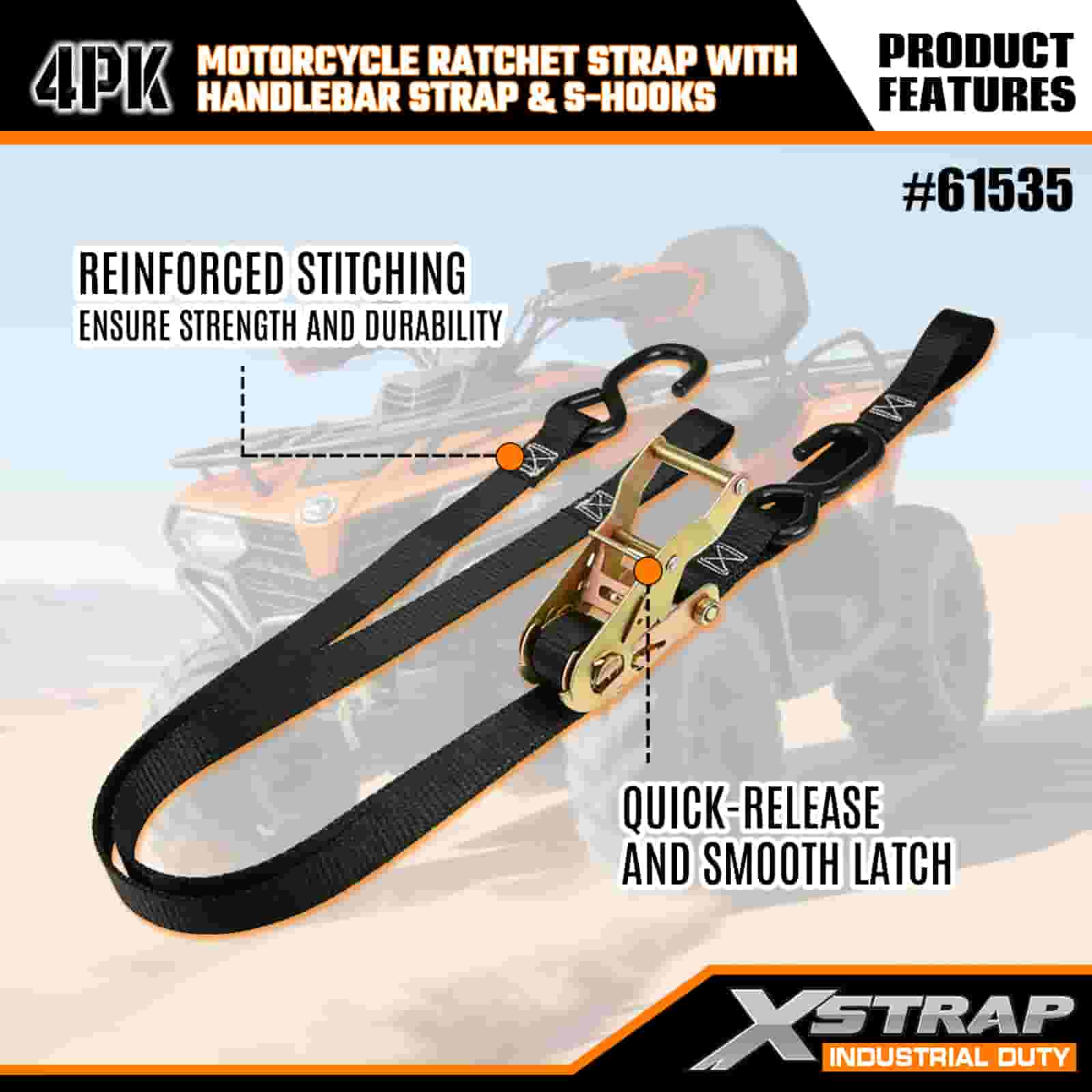Ремень Xstrap 4PK с храповым механизмом для мотоцикла, ремнем на руль и S-образными крючками, полиэстеровый стяжной ремень 1 x 7 футов, тянущий ремень с храповым механизмом, грузоподъемность 833 фунта. Крепежные ремни для крепления груза с S-образным крючком для серьезных профессионалов для крепления грузового прицепа, прицепа с плоской платформой, лыжной лодки, небольшого автомобиля.