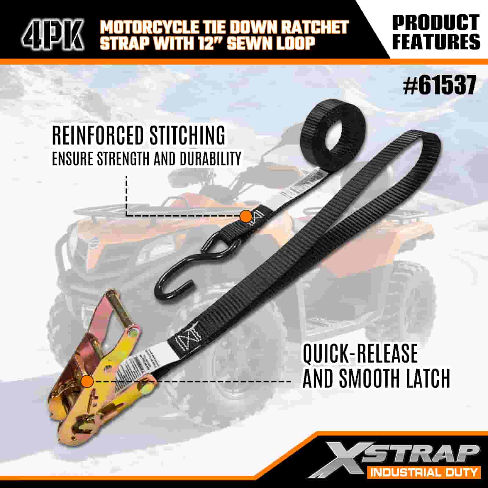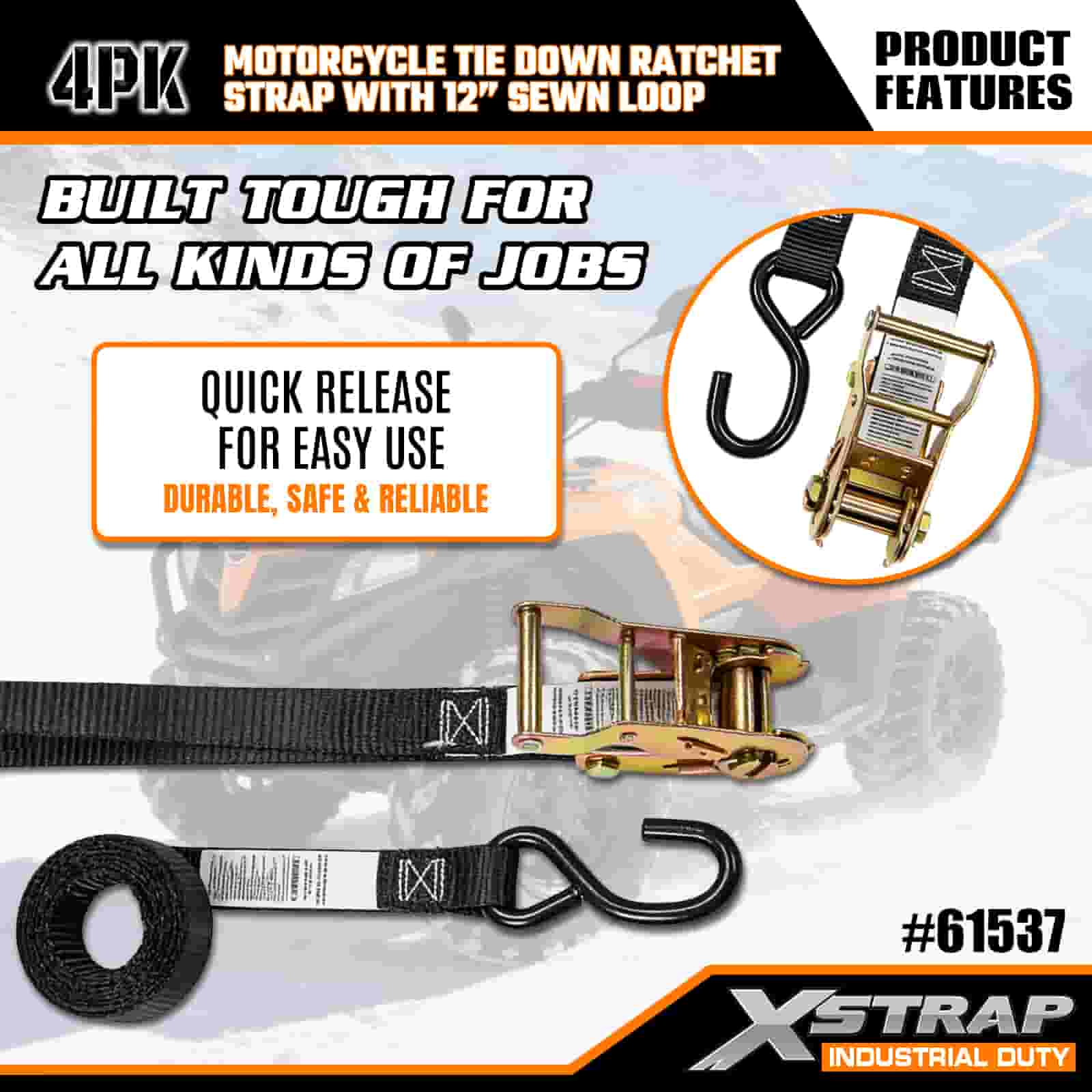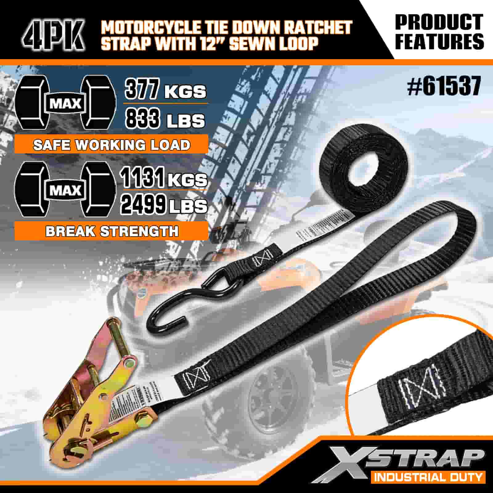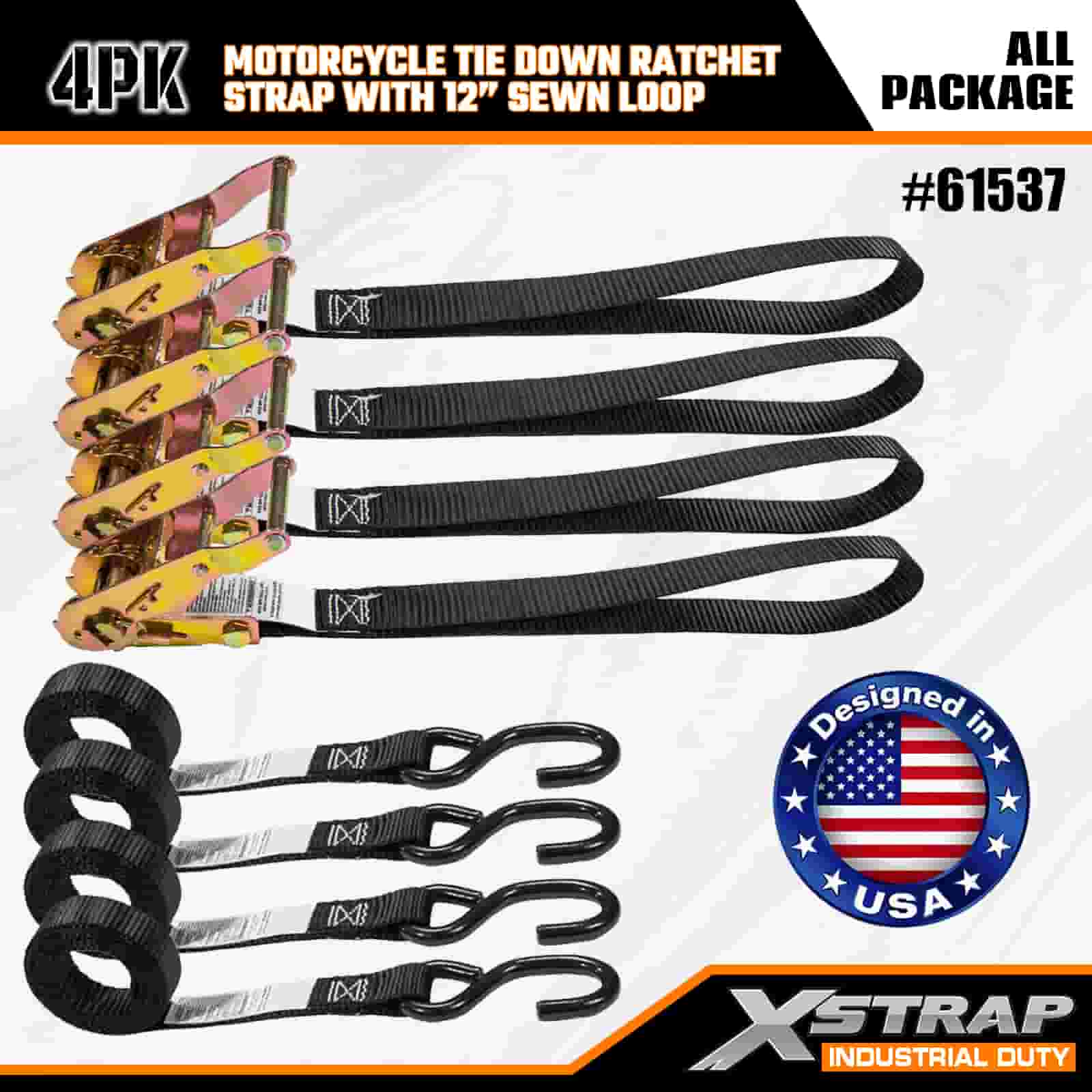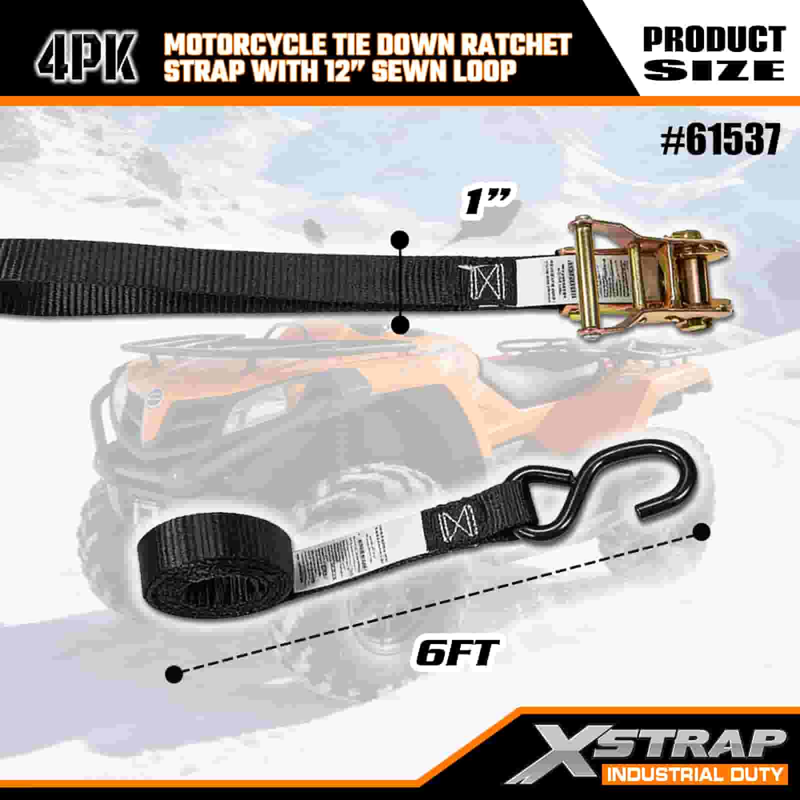 Xstrap 4PK Мотоциклетный ремень с храповым механизмом с пришитой петлей длиной 12 дюймов, полиэстеровый стяжной ремень 1 x 6 футов с храповым механизмом, грузоподъемность 833 фунта. Крепежные ремни для крепления груза с S-образным крючком для серьезных профессионалов для крепления грузового прицепа, прицепа с плоской платформой, лыжной лодки, небольшого автомобиля.