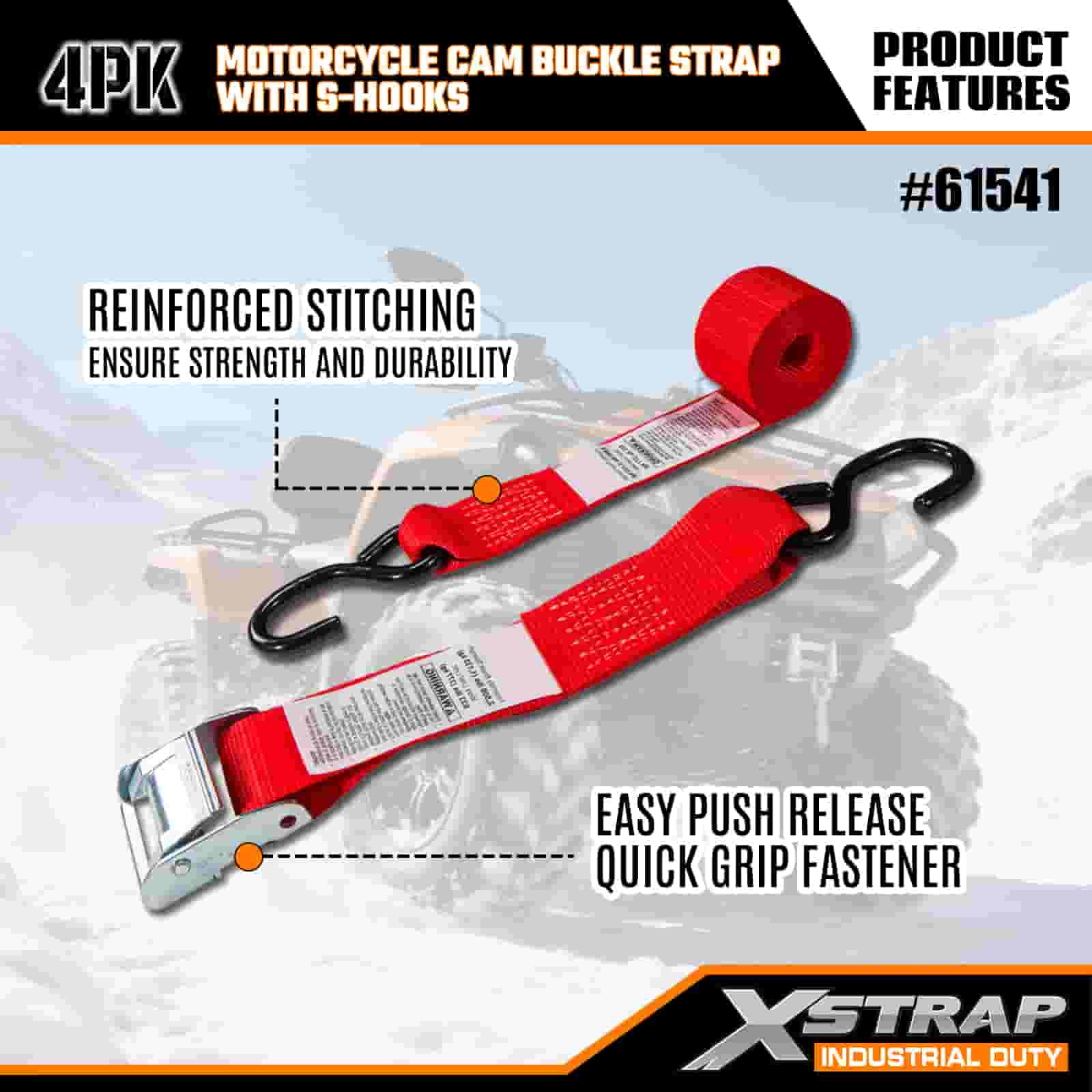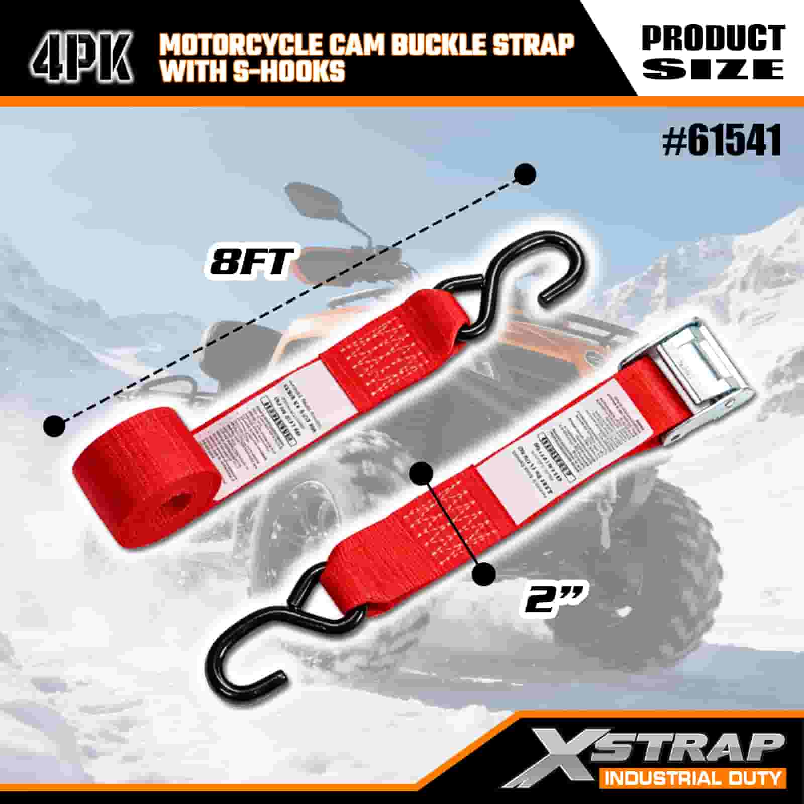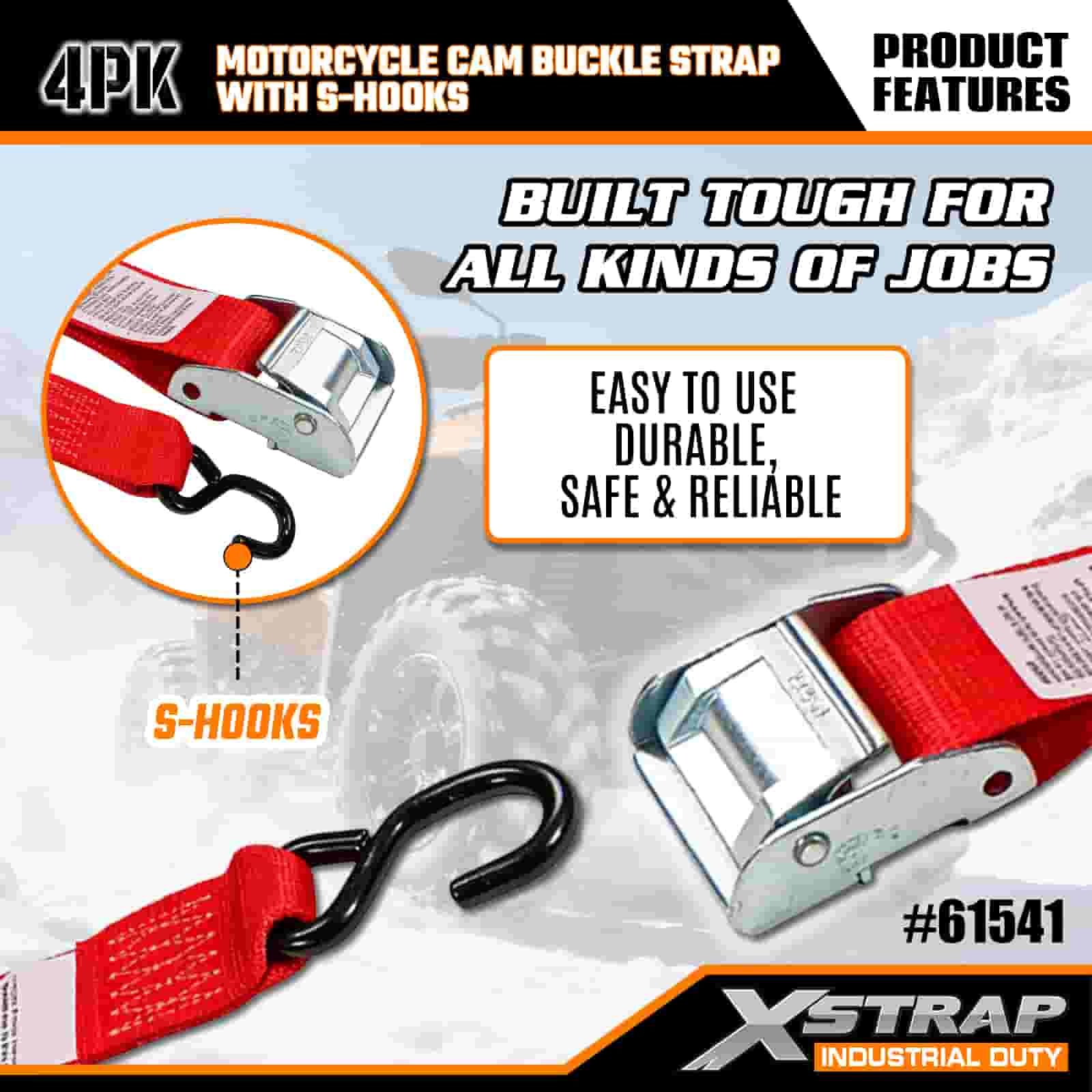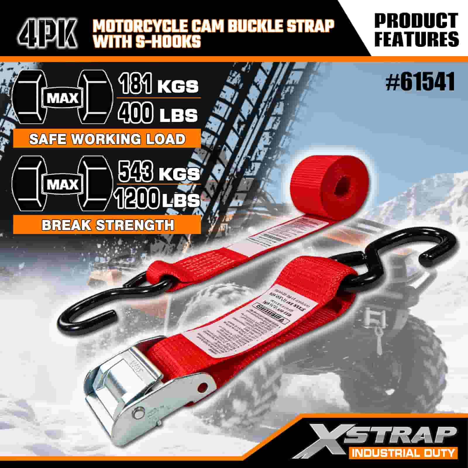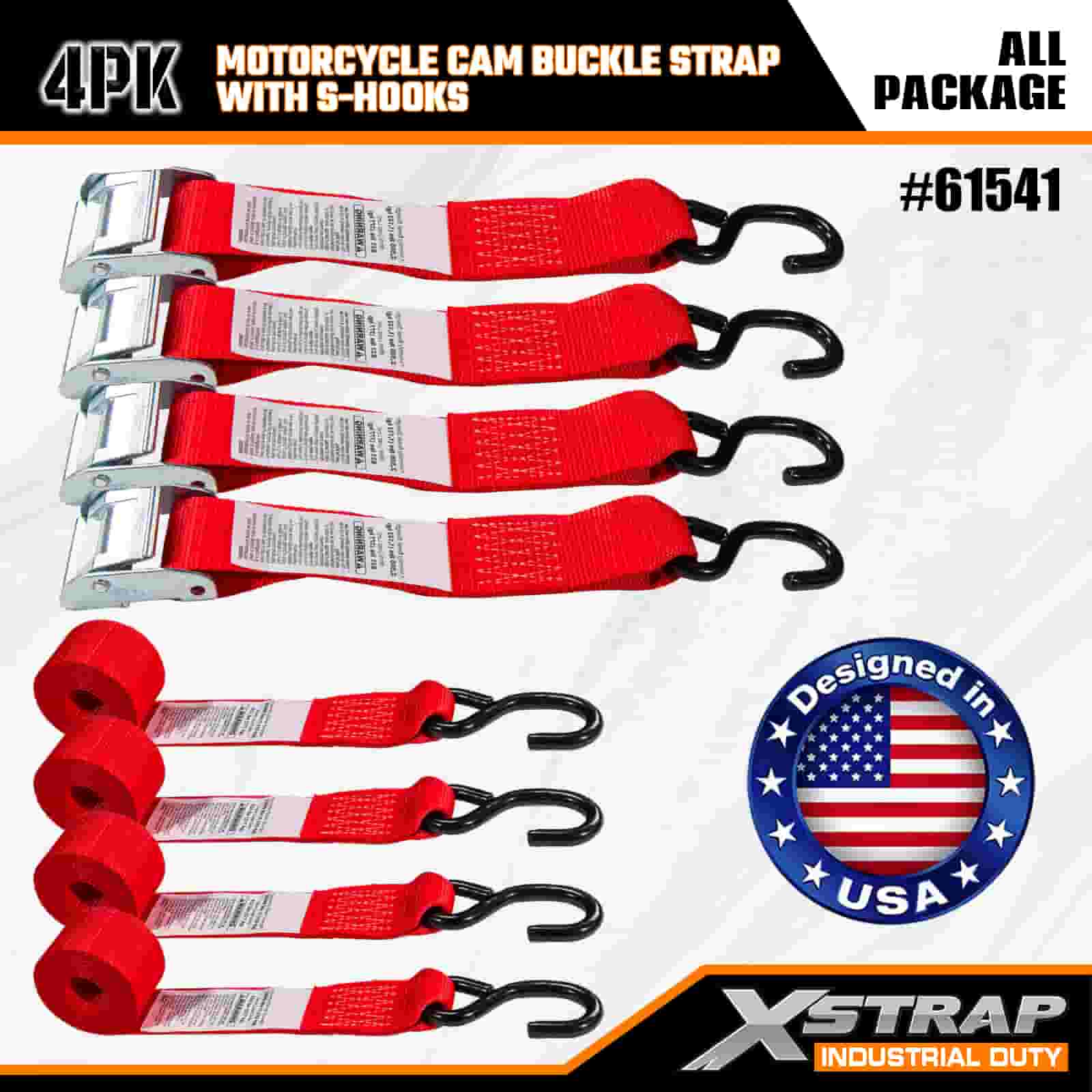 Ремень Xstrap 4PK с пряжкой для мотоцикла и S-образным крючком, полиэстеровый стяжной ремень с пряжкой и храповым механизмом, грузоподъемность 400 фунтов. Крепежные ремни для крепления груза с S-образным крючком для серьезных профессионалов для закрепления грузового прицепа, прицепа с плоской платформой, лыжной лодки, небольшого автомобиля.