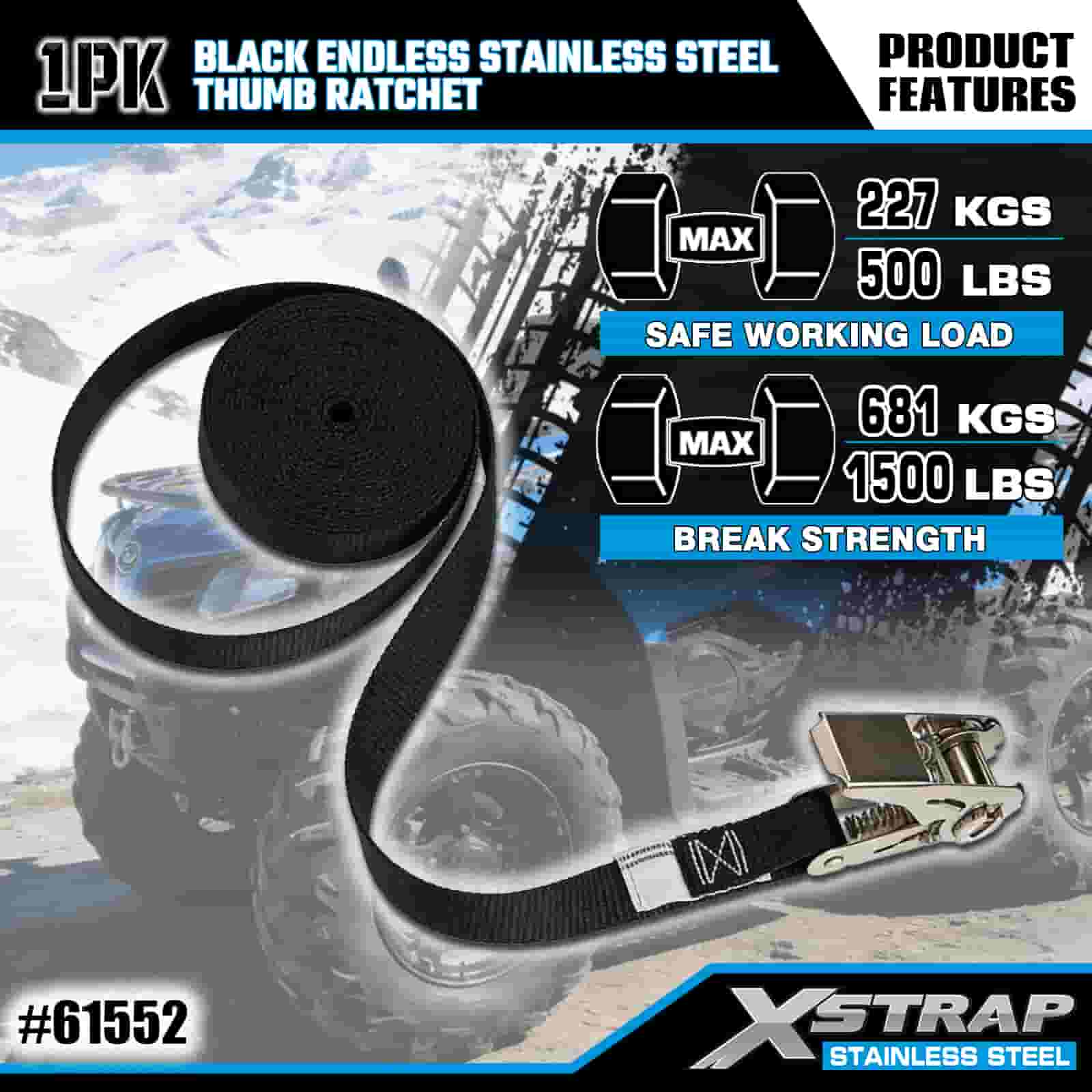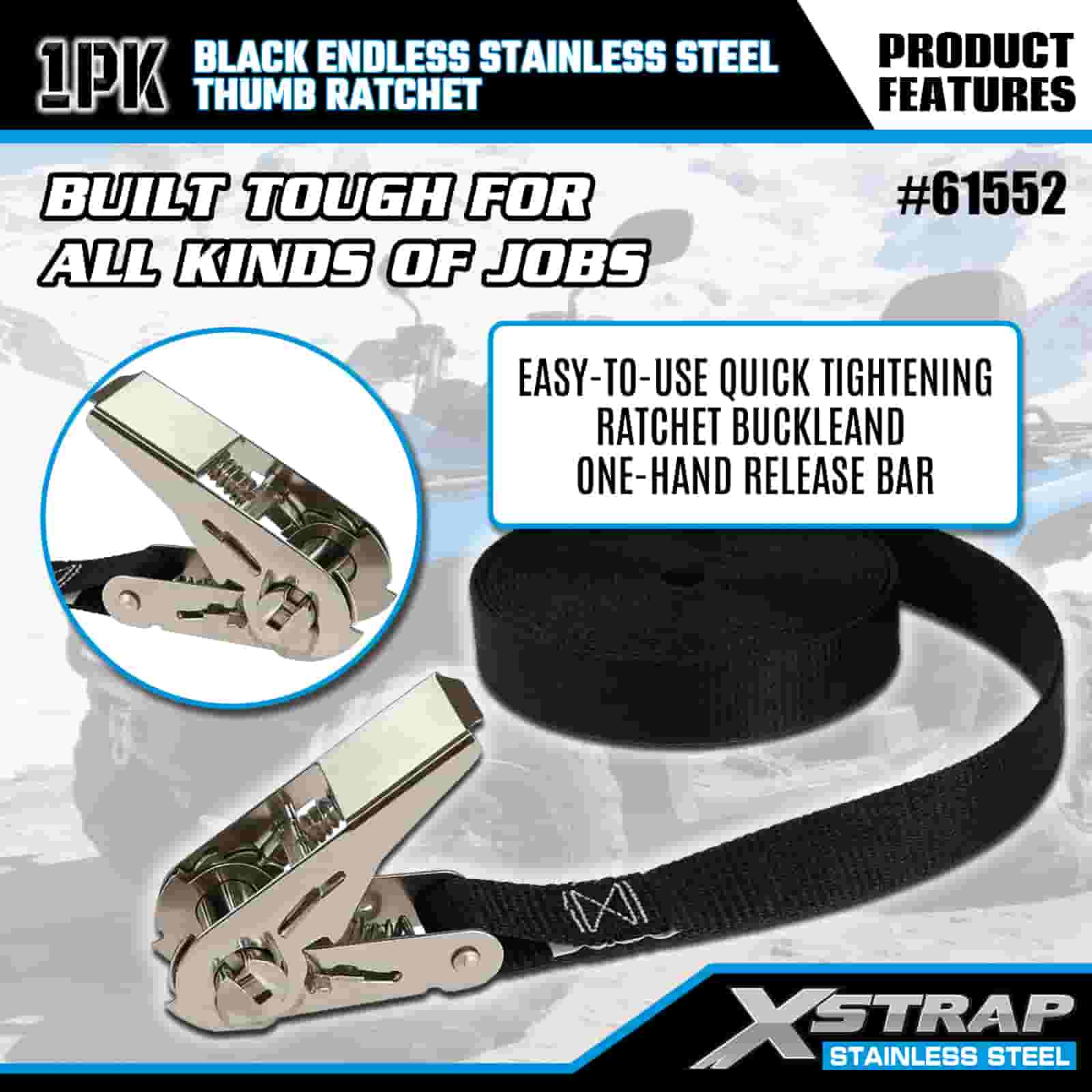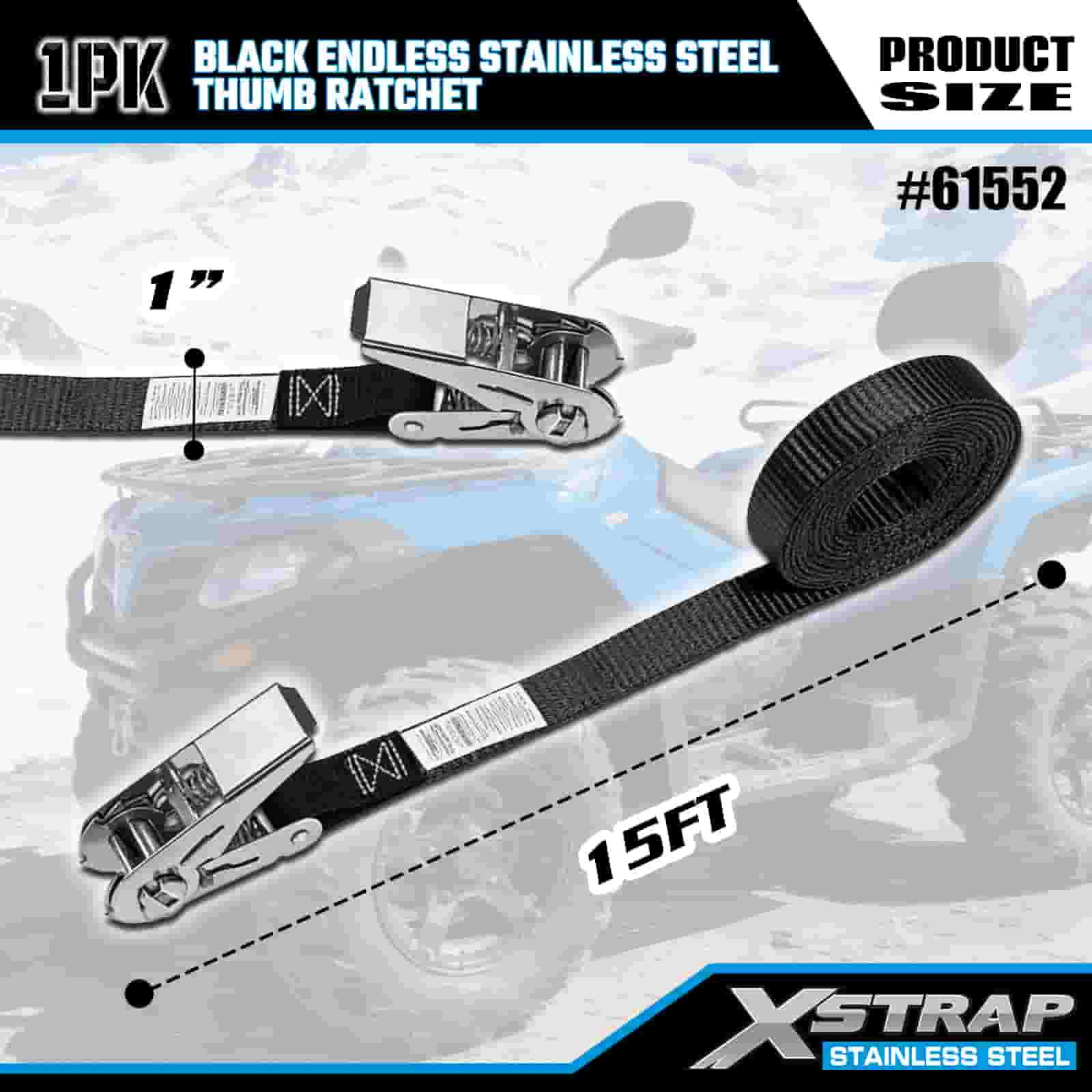 Xstrap Черная бесконечная трещотка для большого пальца из нержавеющей стали, полиэстеровый стяжной ремень с храповым механизмом размером 1 x 15 футов, крепежные ремни для крепления груза грузоподъемностью 500 фунтов для прицепа, лыжной лодки с прицепом с плоской платформой, небольшого автомобиля, тяжелого оборудования.