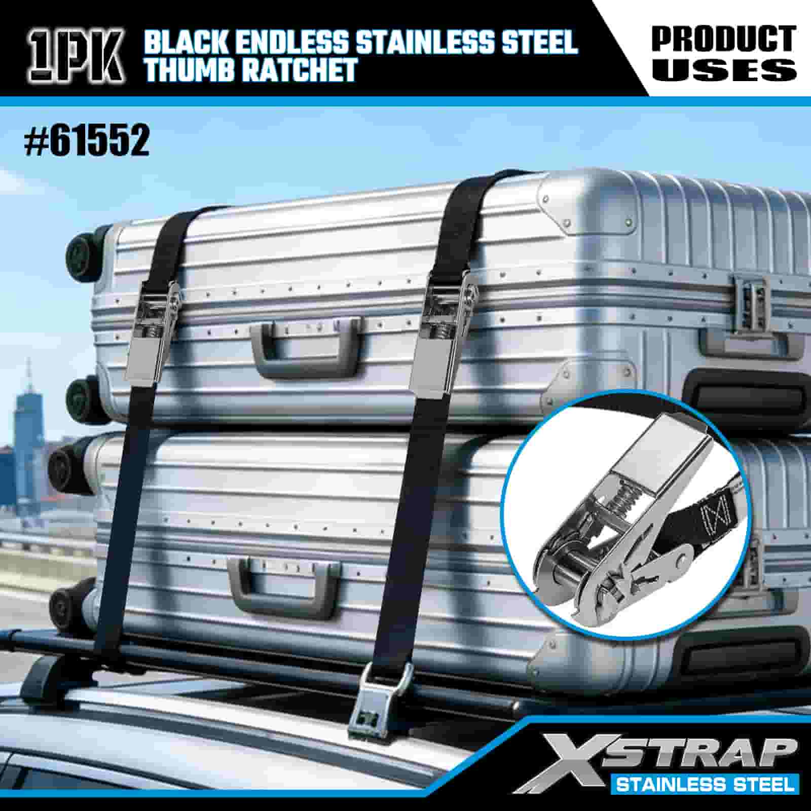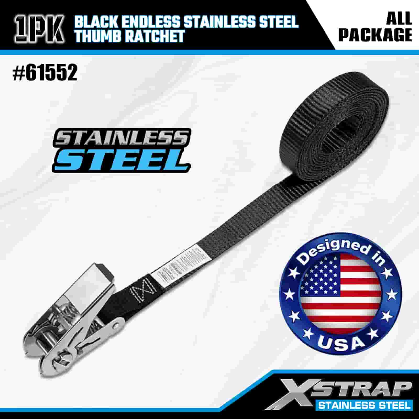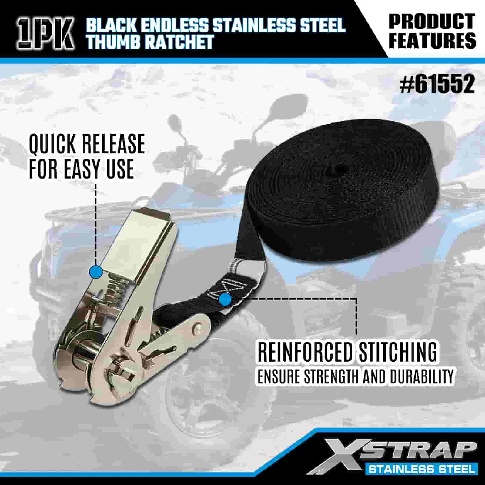 Xstrap Черная бесконечная трещотка для большого пальца из нержавеющей стали, полиэстеровый стяжной ремень с храповым механизмом размером 1 x 15 футов, крепежные ремни для крепления груза грузоподъемностью 500 фунтов для прицепа, лыжной лодки с прицепом с плоской платформой, небольшого автомобиля, тяжелого оборудования.