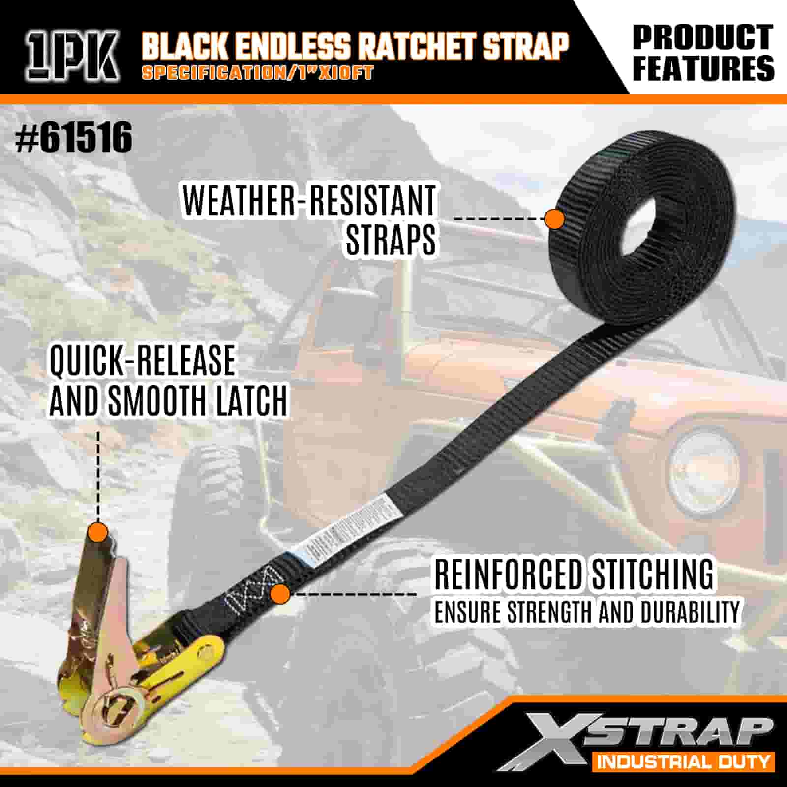 Черный бесконечный ремень с храповым механизмом Xstrap, полиэстеровый стяжной ремень с храповым механизмом размером 1 х 10 футов, крепежные ремни для крепления груза грузоподъемностью 500 фунтов для серьезных профессионалов, которые могут закрепить грузовой прицеп, прицеп с плоской платформой, лыжную лодку, небольшой автомобиль.