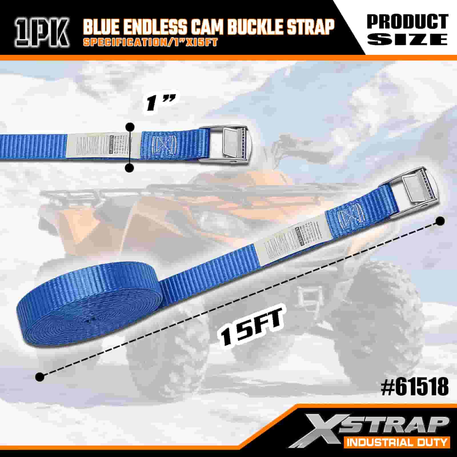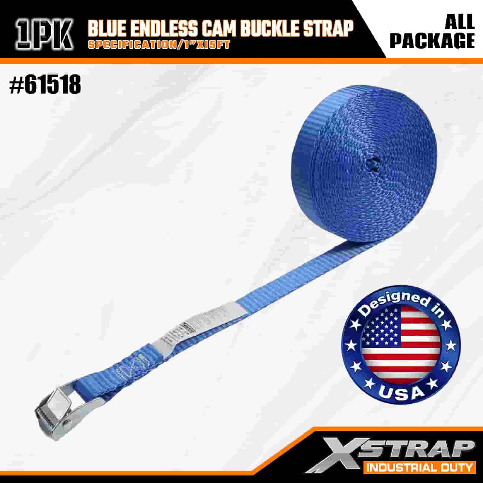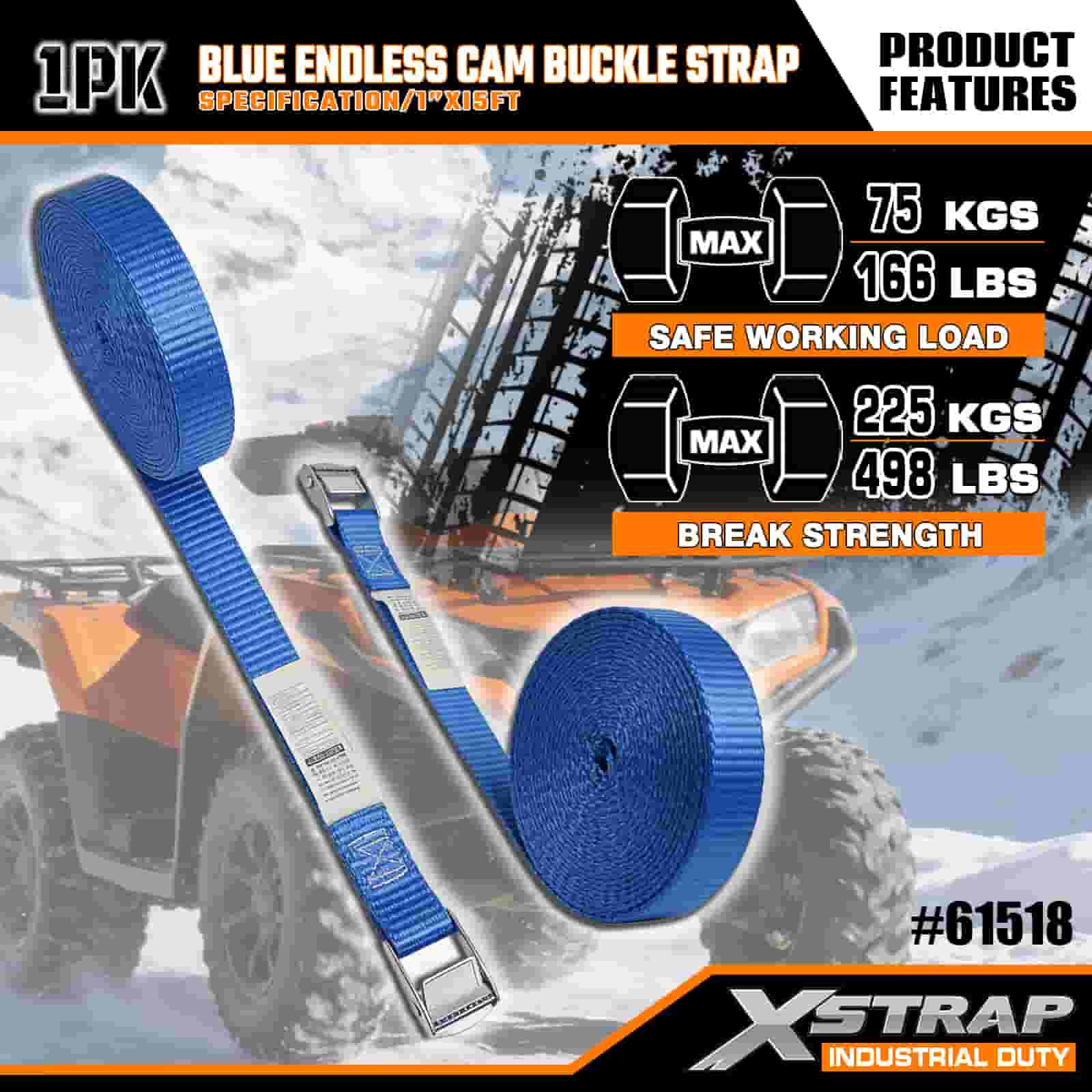 Синий ремень с бесконечной кулачковой пряжкой Xstrap, полиэстеровый стяжной ремень с храповым механизмом размером 1 дюйм x 15 футов, крепежные ремни для крепления груза грузоподъемностью 166 фунтов для серьезных профессионалов, которые могут закрепить грузовой прицеп, прицеп с плоской платформой, лыжную лодку, небольшой автомобиль.