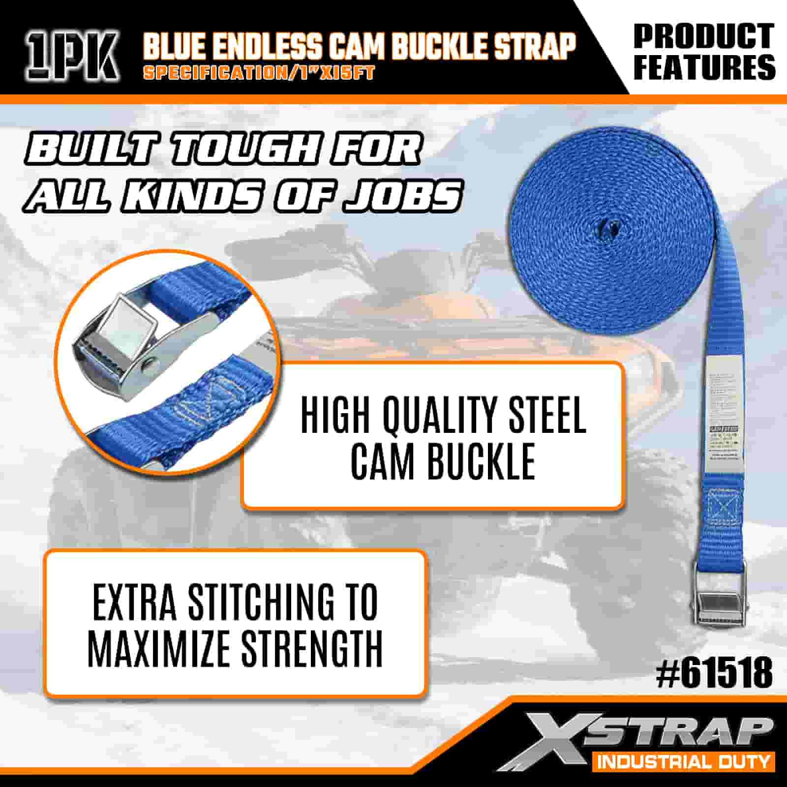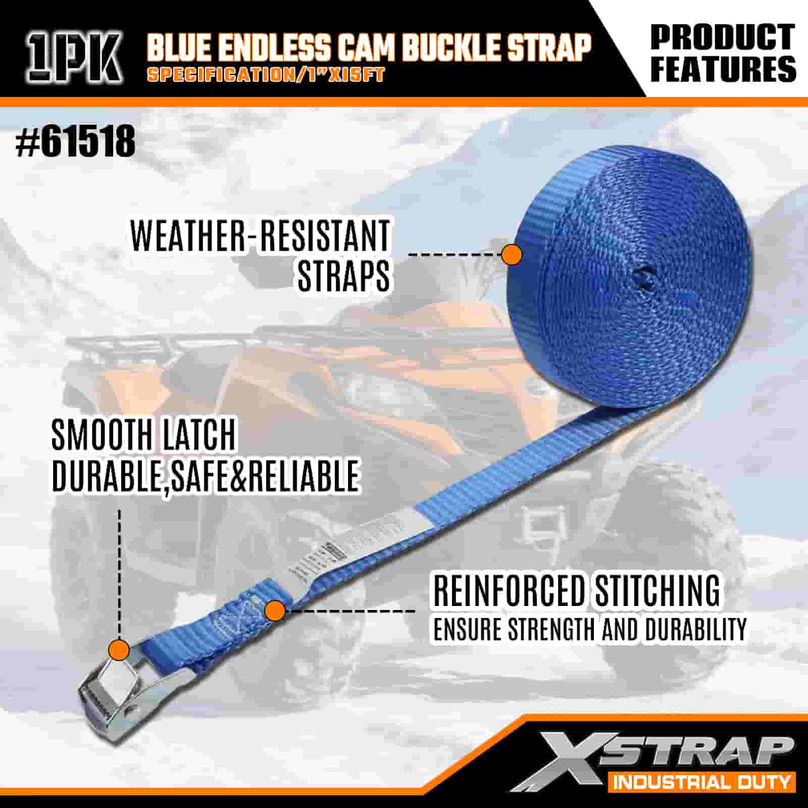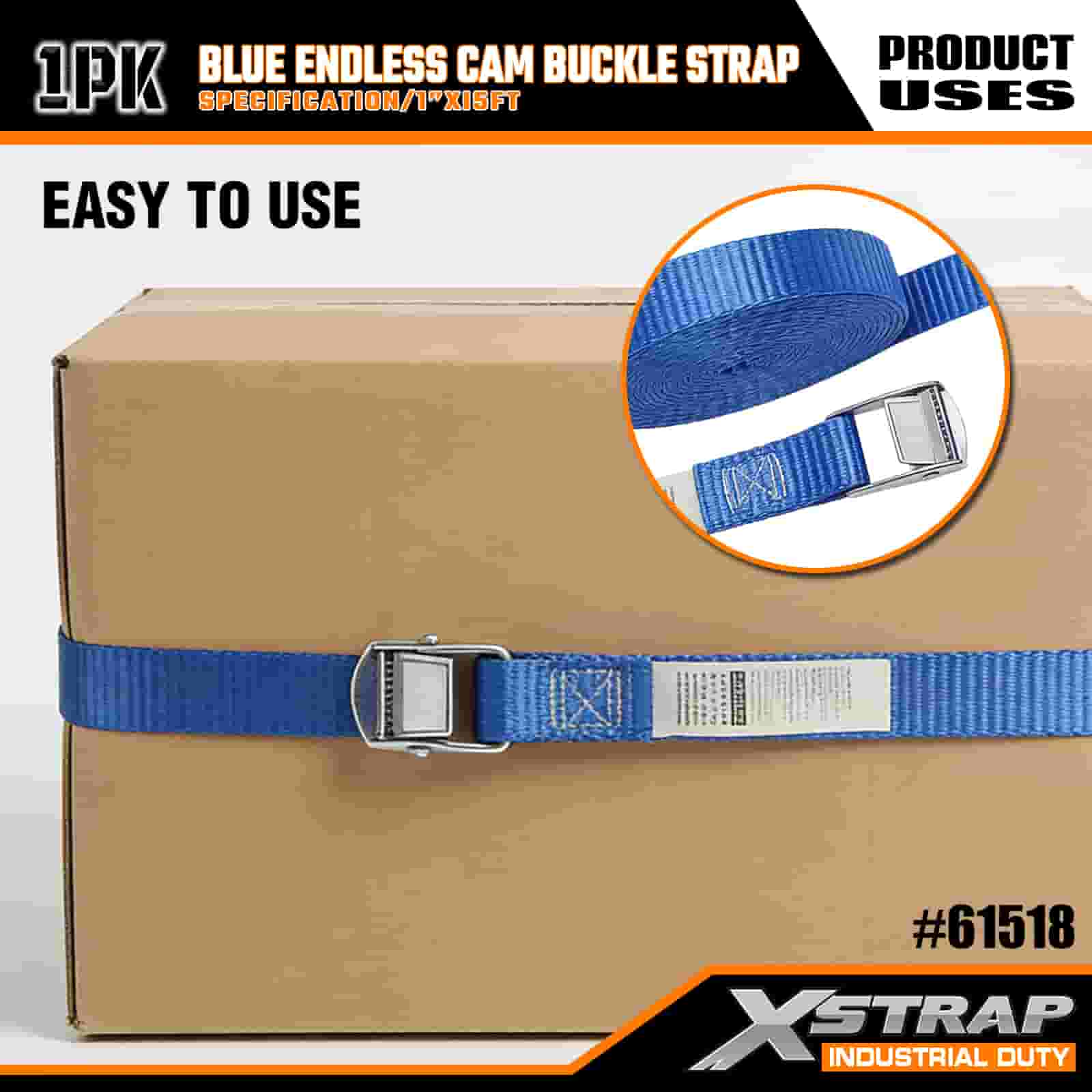 Синий ремень с бесконечной кулачковой пряжкой Xstrap, полиэстеровый стяжной ремень с храповым механизмом размером 1 дюйм x 15 футов, крепежные ремни для крепления груза грузоподъемностью 166 фунтов для серьезных профессионалов, которые могут закрепить грузовой прицеп, прицеп с плоской платформой, лыжную лодку, небольшой автомобиль.