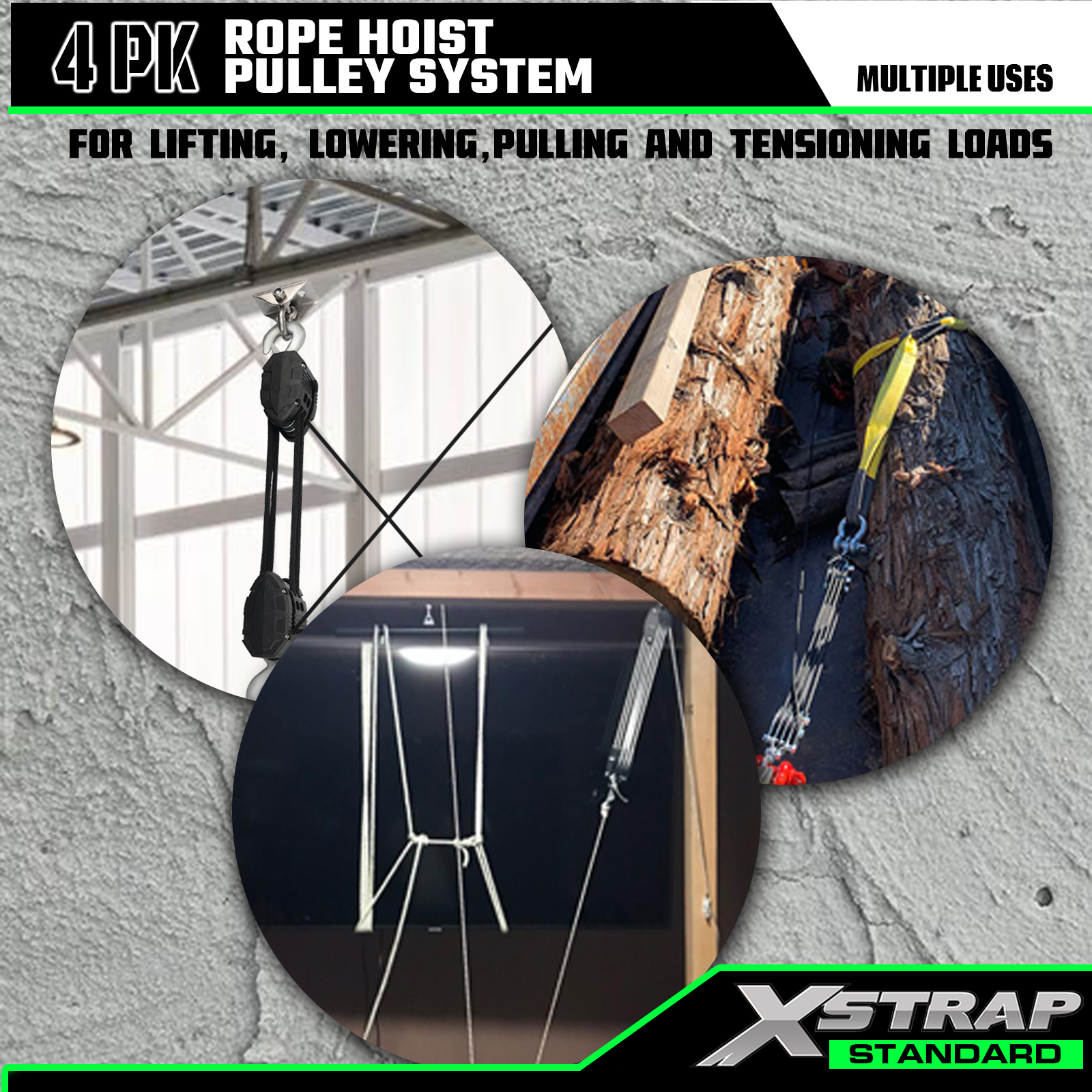 Это наш канатный подъемник XSTRAP STANDARD длиной 50 футов, сверхмощный колесный блок грузоподъемностью 2000 фунтов и система шкивов для подъема тяжелых предметов в рабочих перчатках, 2 мягких петли, 1 поворотная вешалка для склада в гараже.