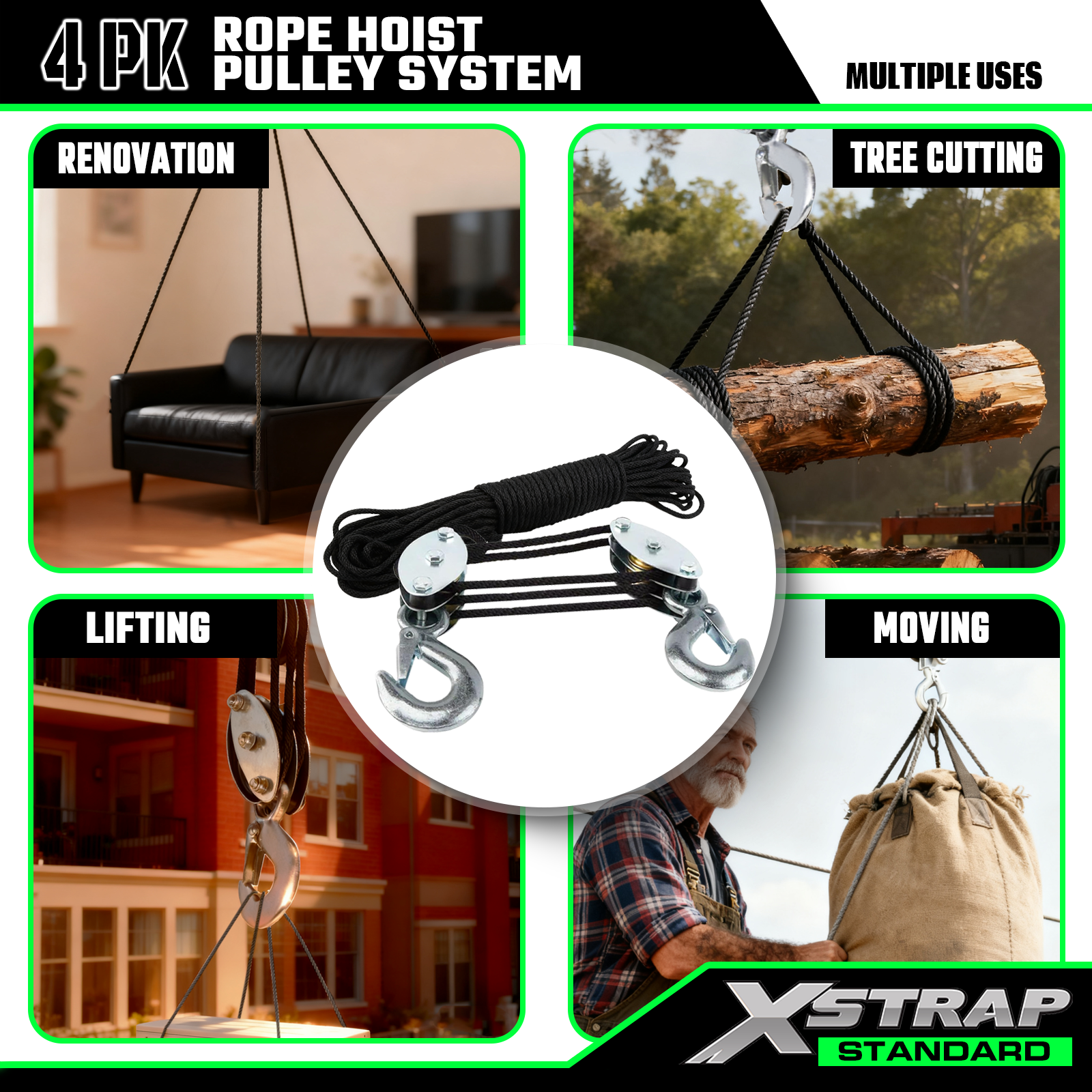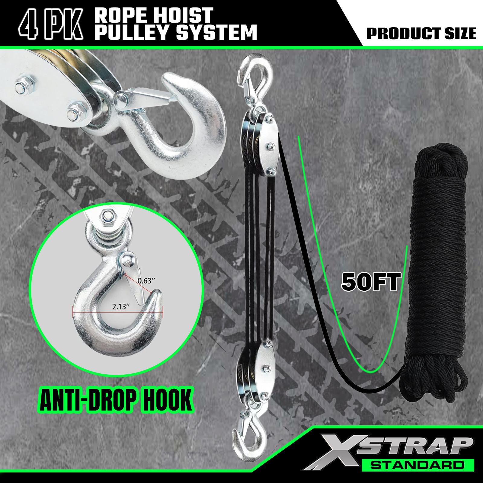 Это стандартная система канатных подъемных шкивов Xstrap. Грузоподъемность 1000 фунтов, прочность на разрыв 2000 фунтов. Подъемная сила 5:1. Сверхмощный полиспаст длиной 50 футов для охоты, подъем тяжелых предметов с противоскользящими рабочими перчатками, 2 мягких петли.
