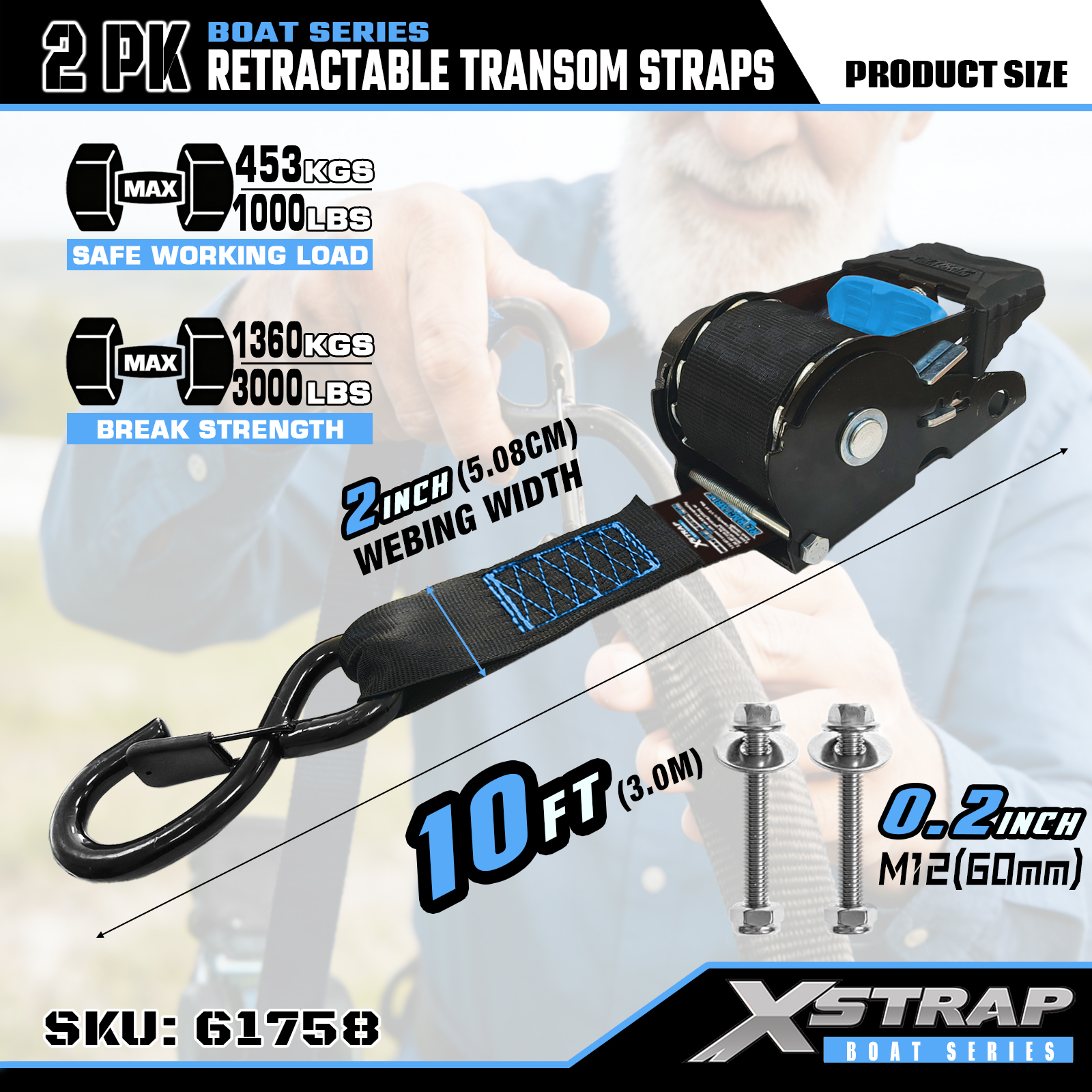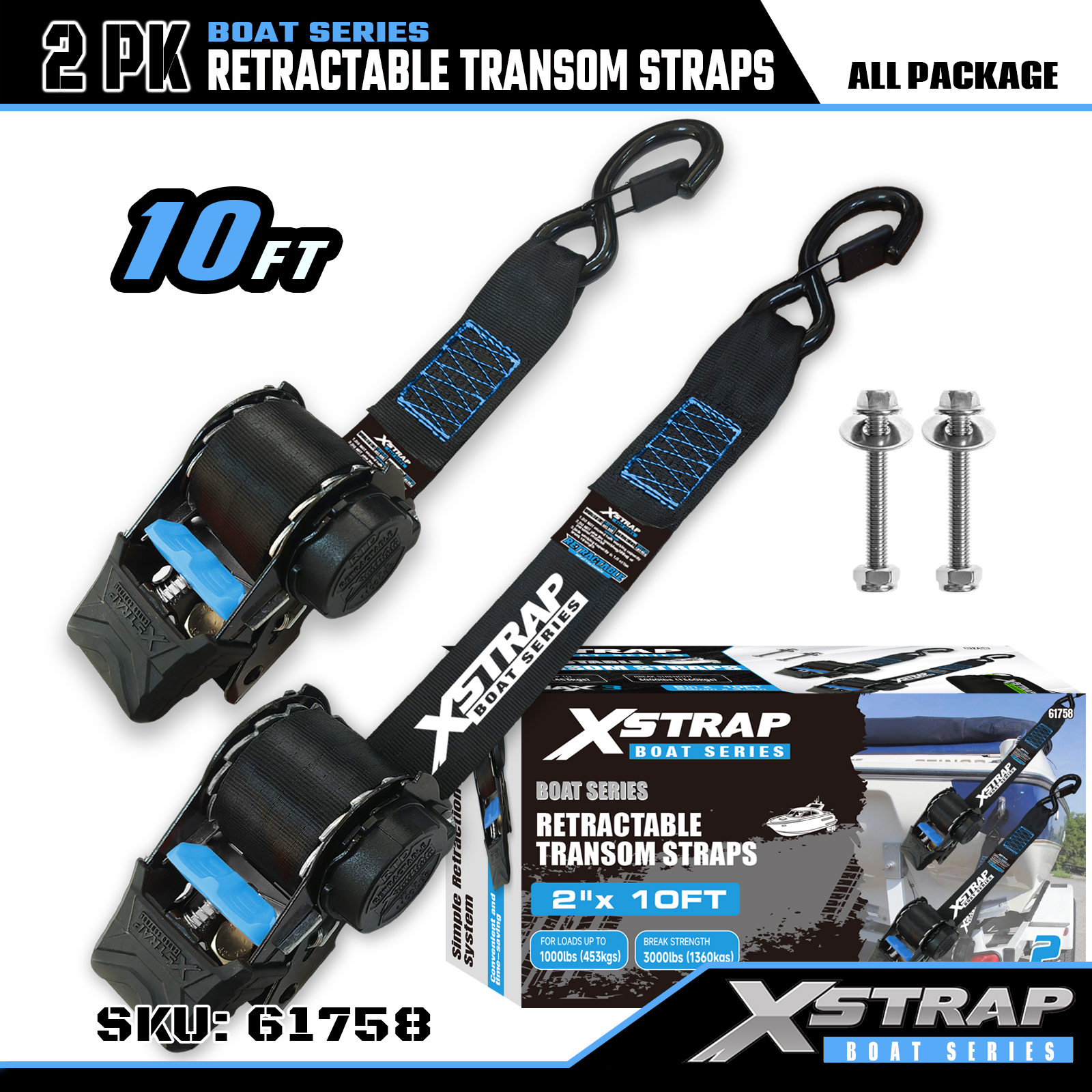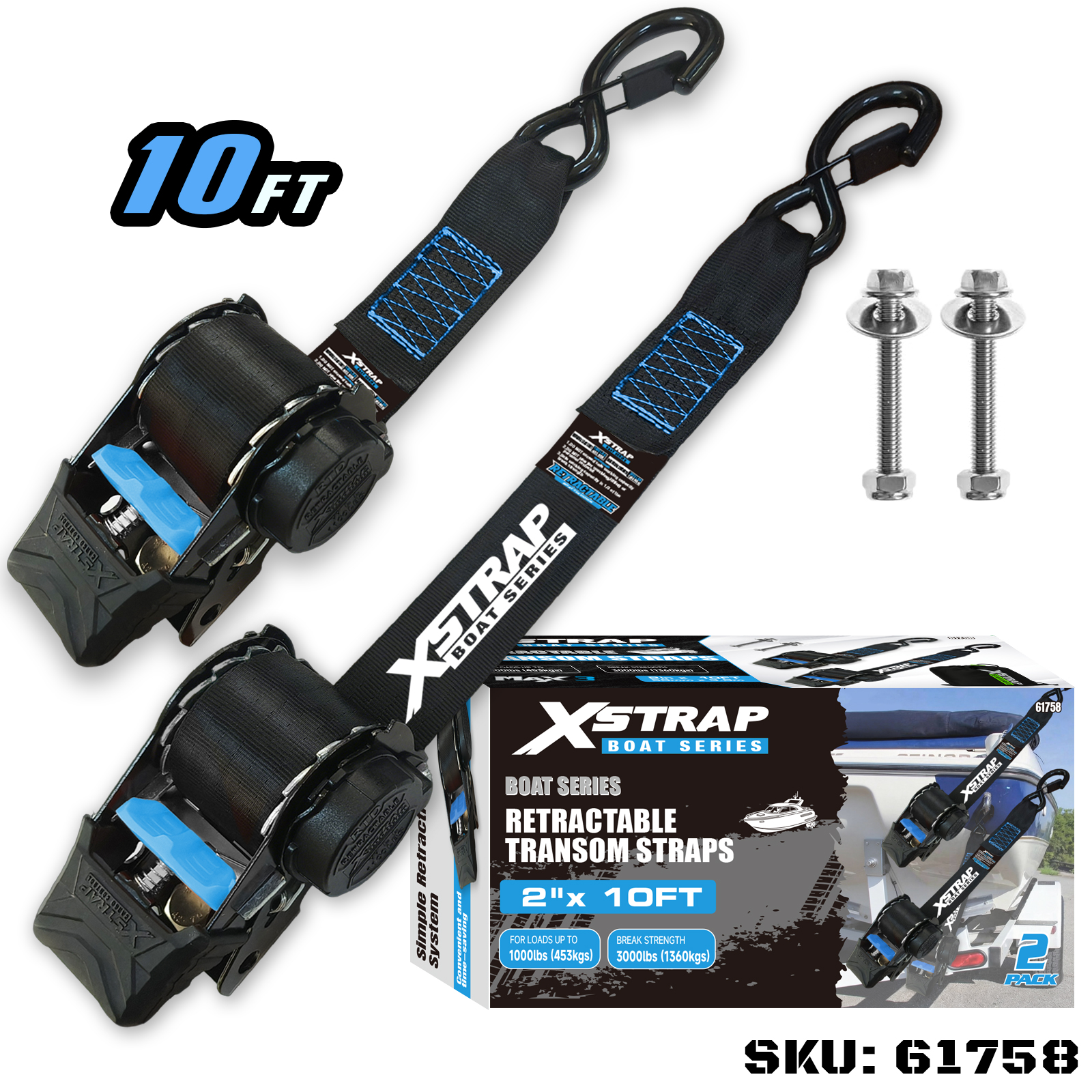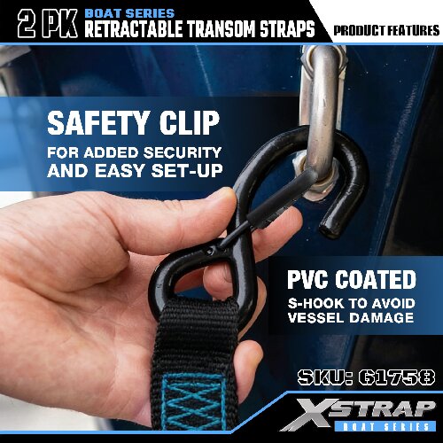 Это выдвижные транцевые ремни Xstrap с безопасными S-образными крючками. Безопасная рабочая нагрузка составляет 1000 фунтов, а прочность на разрыв — 3000 фунтов.