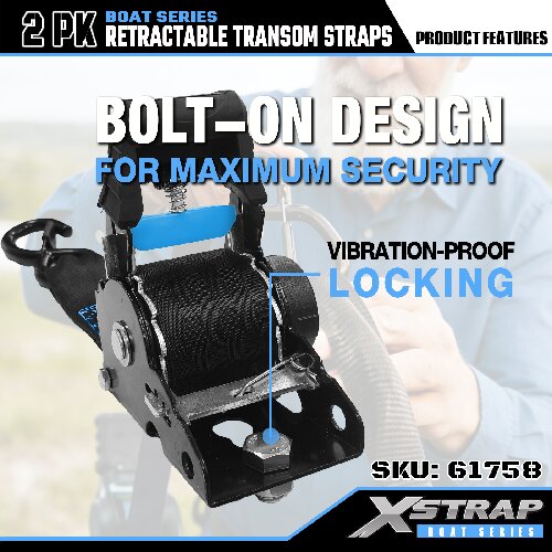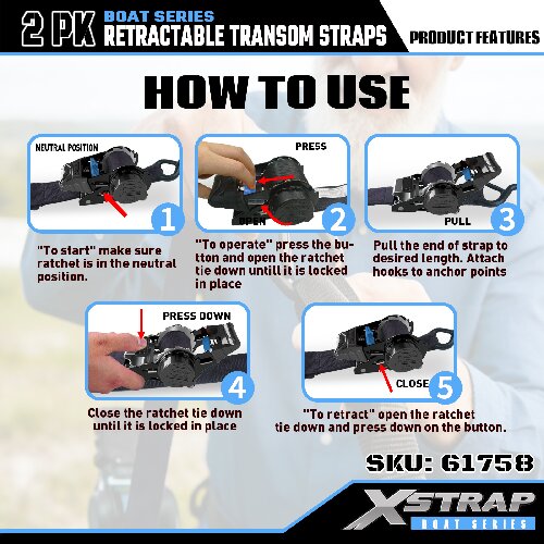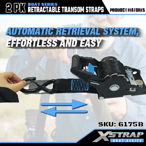 - Простота в использовании: 2-дюймовая выдвижная транцевая стяжка имеет удобный храповой механизм и простые в использовании предохранительные крючки на соединительном конце.