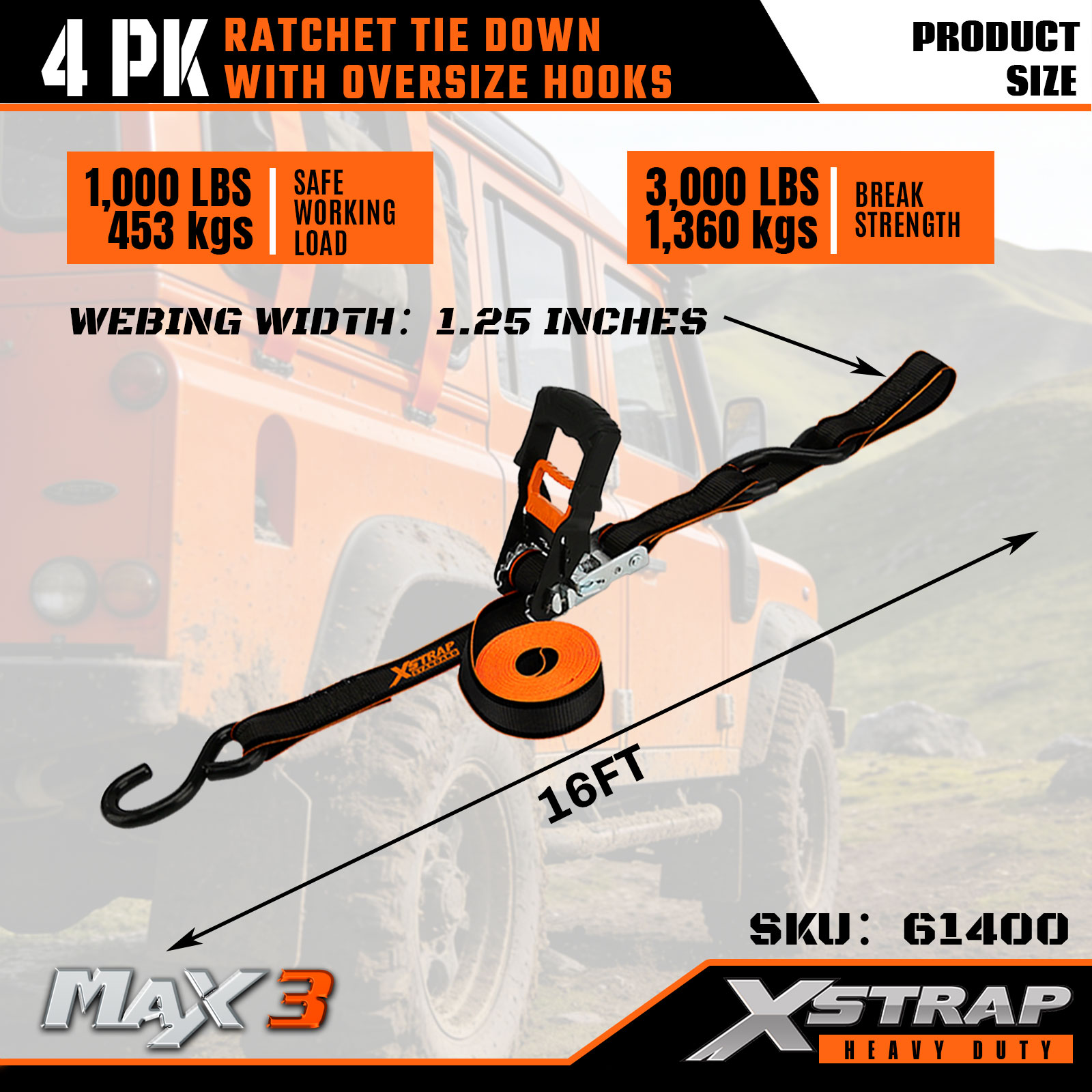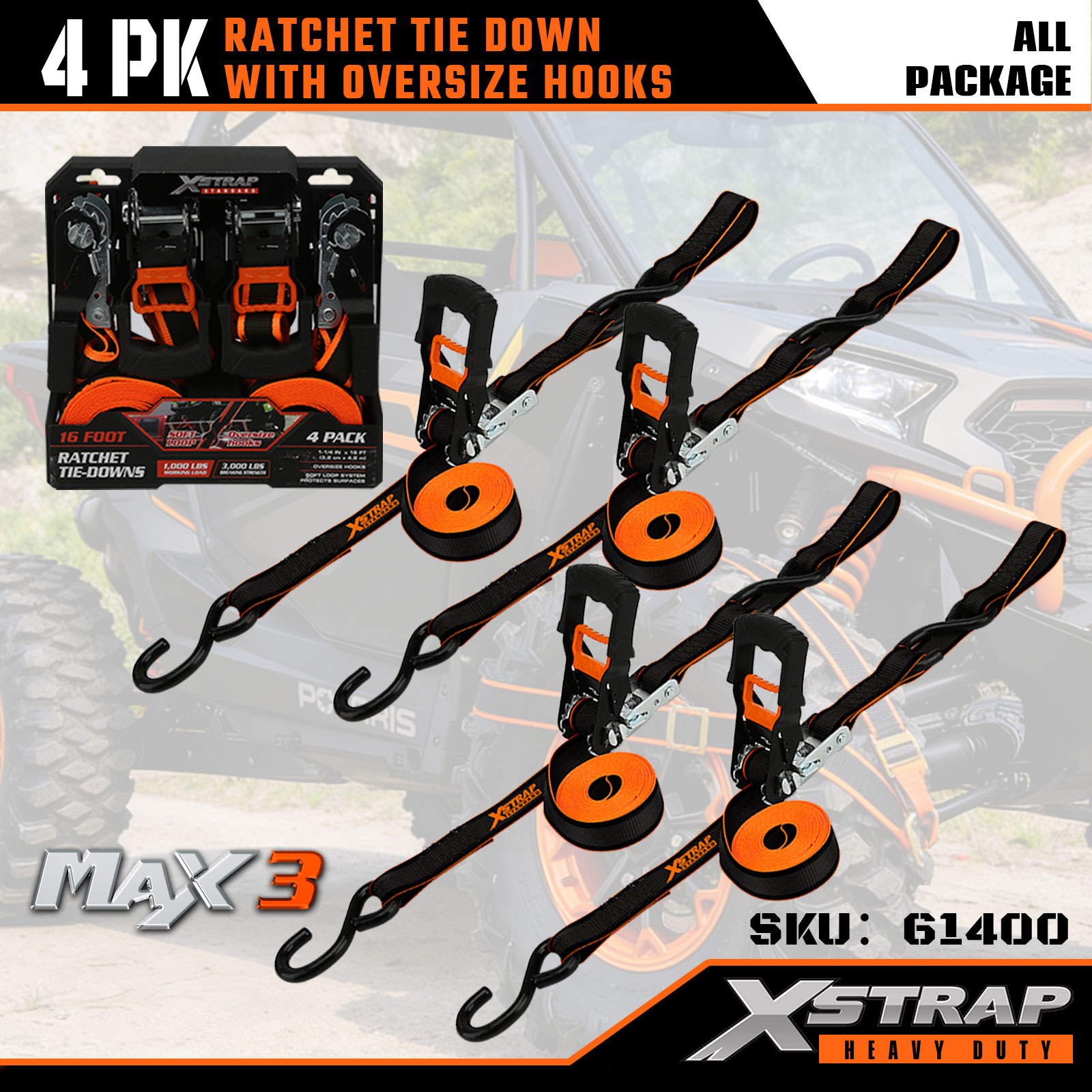 Xstrap 4 комплекта стяжек с храповым механизмом, полиэстеровый стяжной ремень 1-1/4 дюйма x 16 футов, ремень с храповым механизмом, грузоподъемность 1000 фунтов. Крепежные ремни для крепления груза с двойными J-образными крючками для пикапа, внедорожника, автомобильных верхних багажников для мотоциклов, легких рыбацких лодок, гидроциклов, снегоходов, газонокосилок.