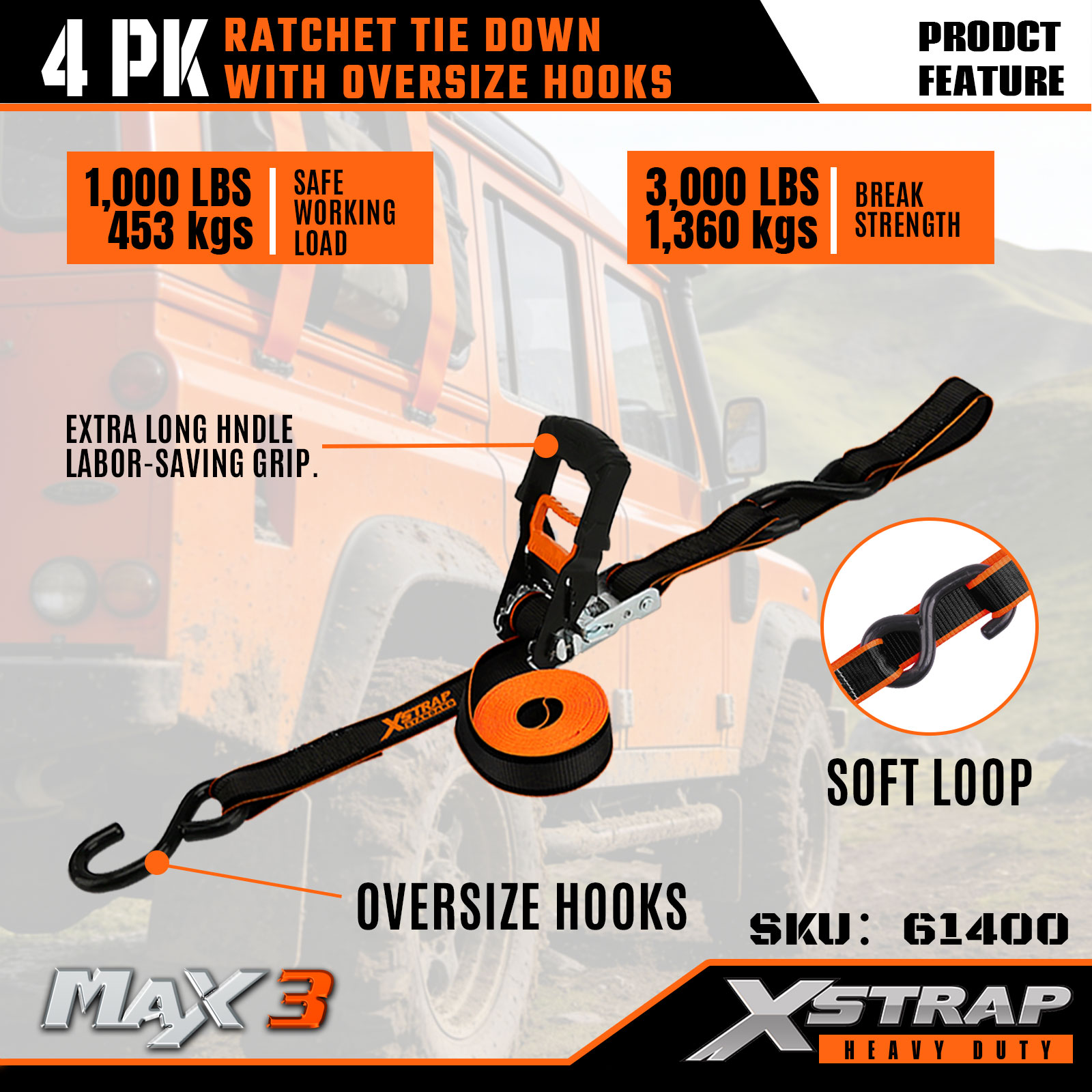 - Удлиненная рукоятка с храповым механизмом, экономящая трудозатраты: имеет очень длинную эргономичную рукоятку, которая сокращает усилия при натяжении — идеально подходит для крепления тяжелых грузов, таких как UTV или оборудование, даже для работы одним человеком.