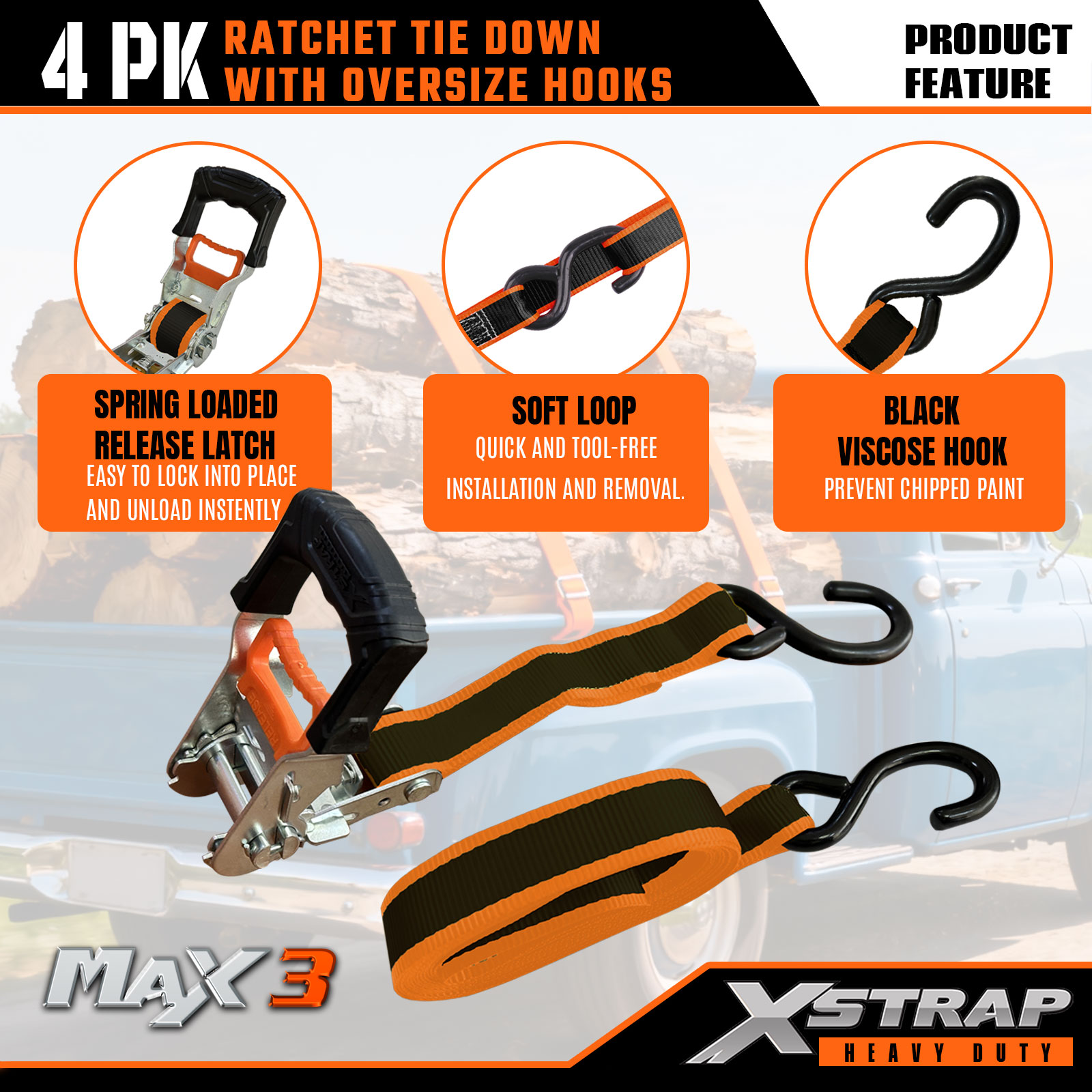 - Защитное оборудование увеличенного размера: оснащено большими S-образными крючками с черным вязкостным покрытием, которые предотвращают сколы и царапины краски на транспортных средствах/грузе; в сочетании с мягкой петлей для фиксации деликатных предметов без использования инструментов и повреждений.