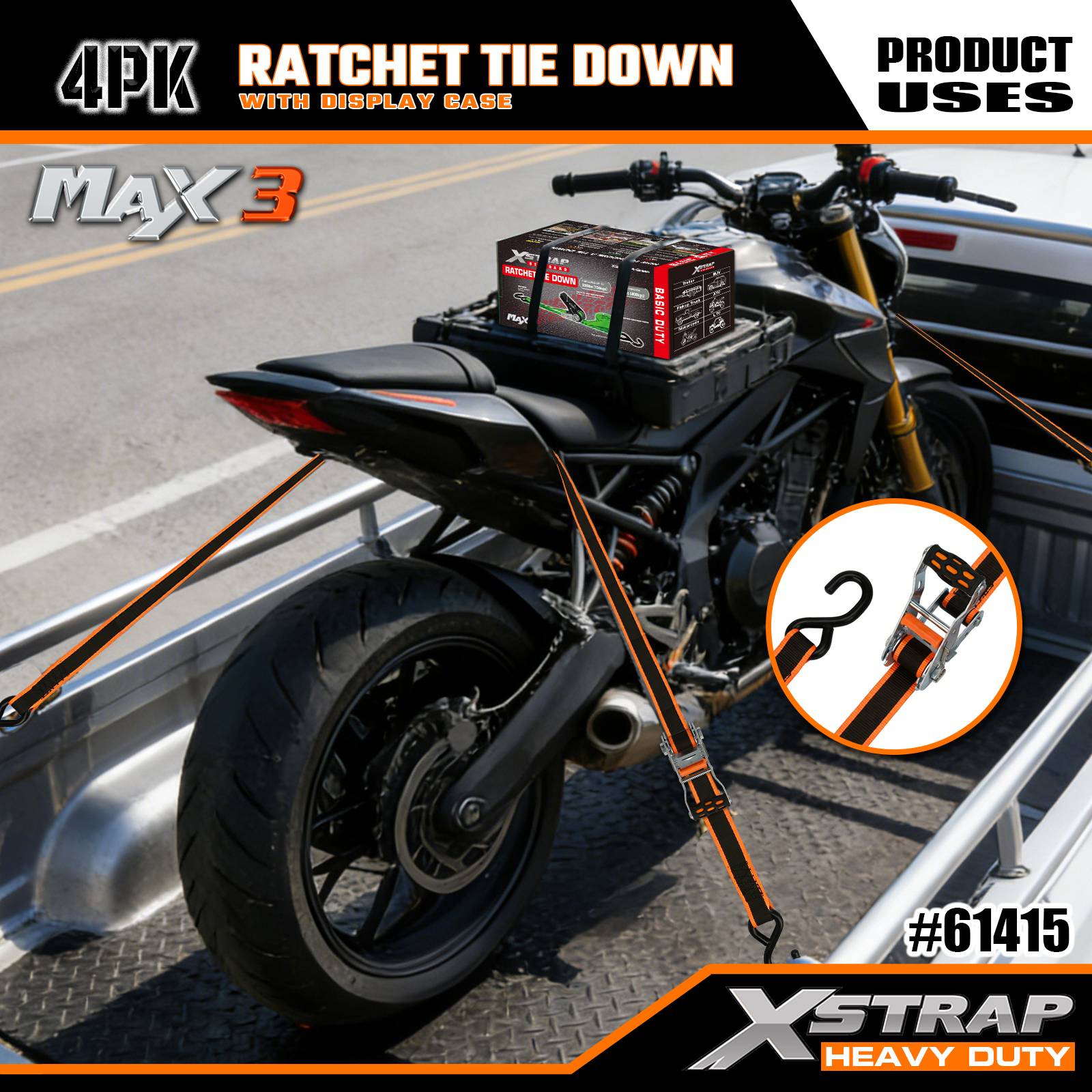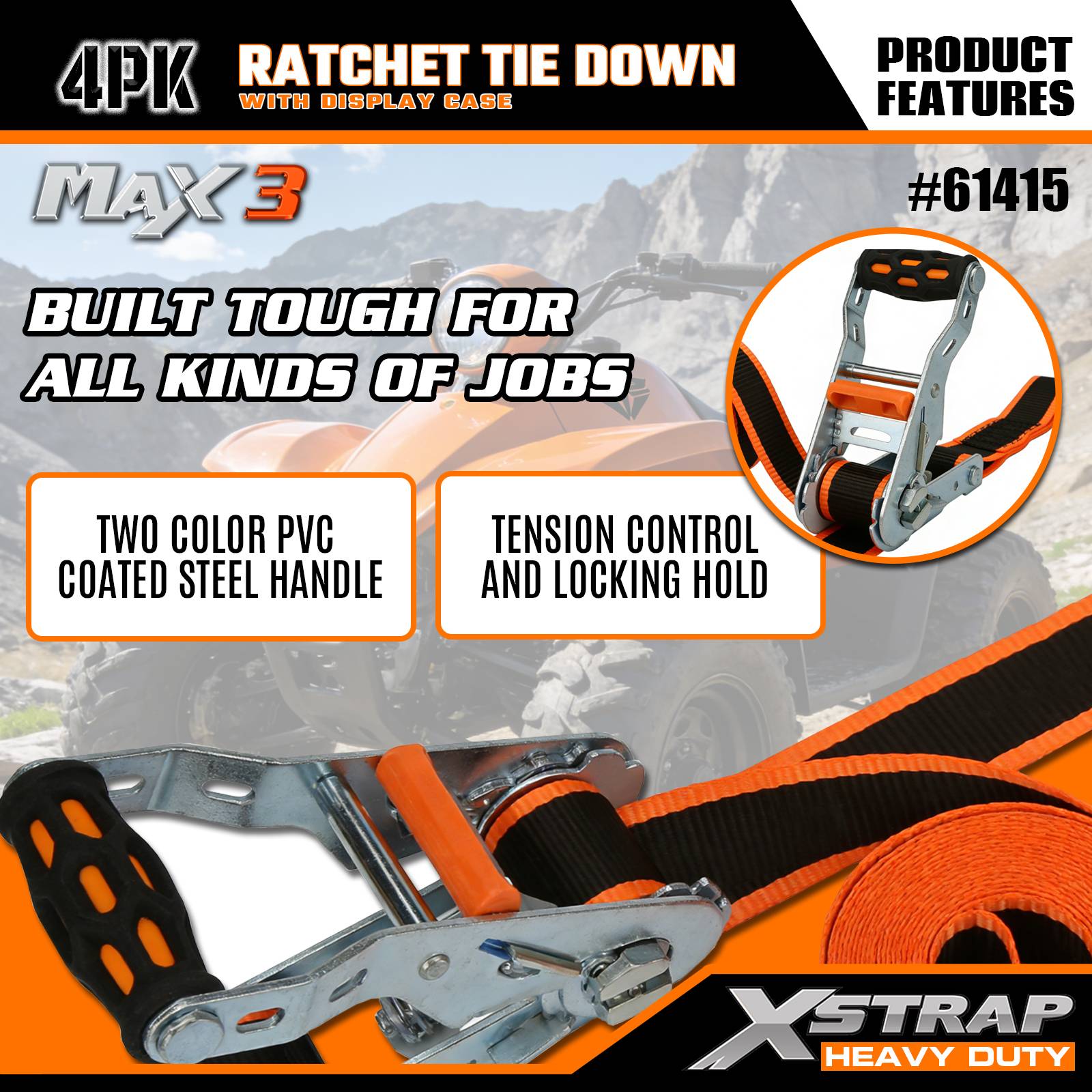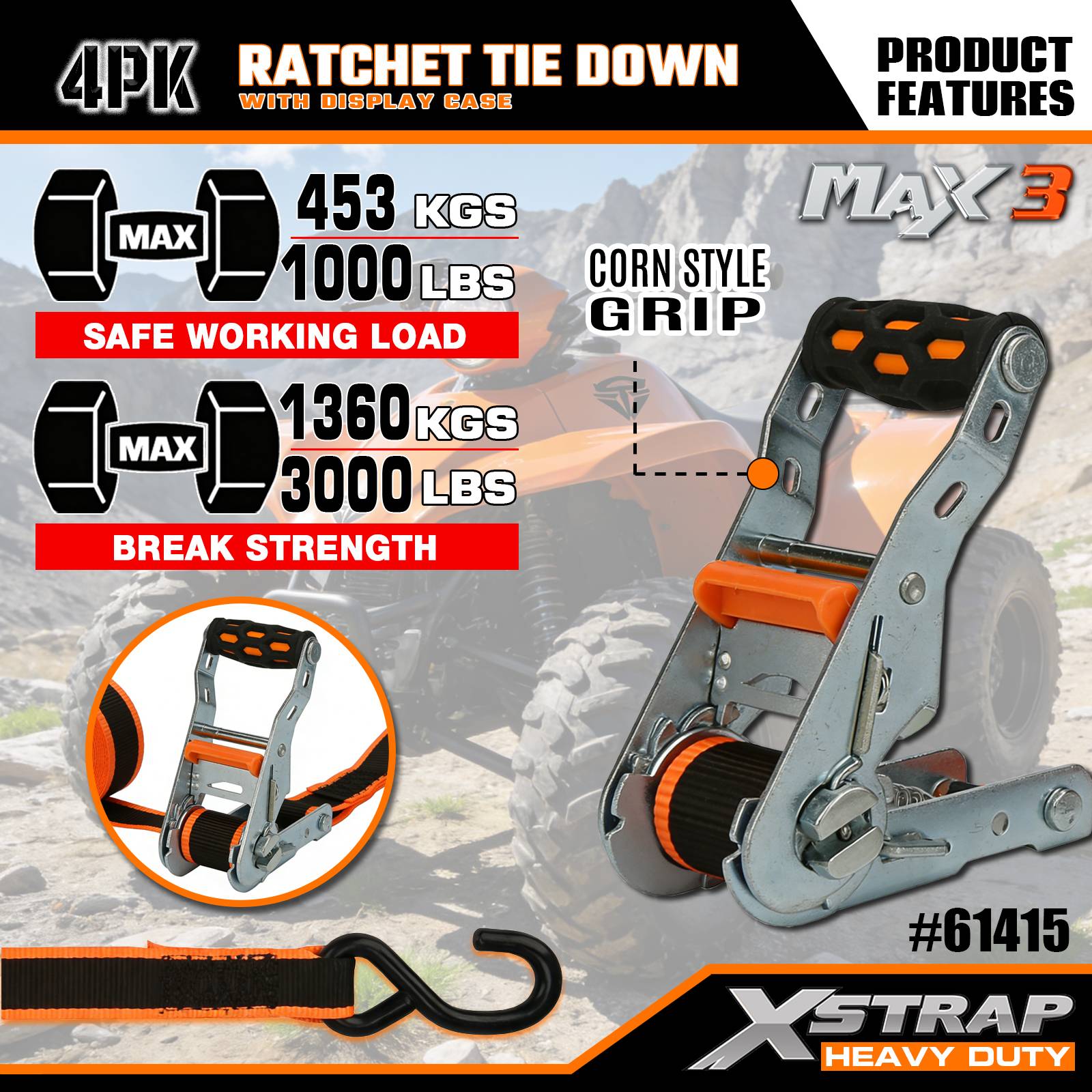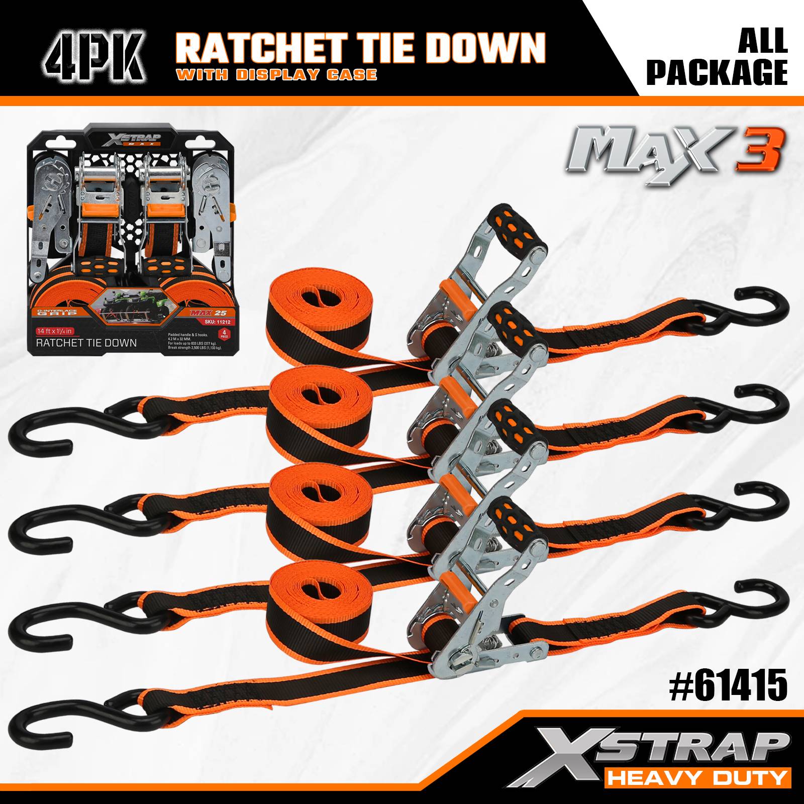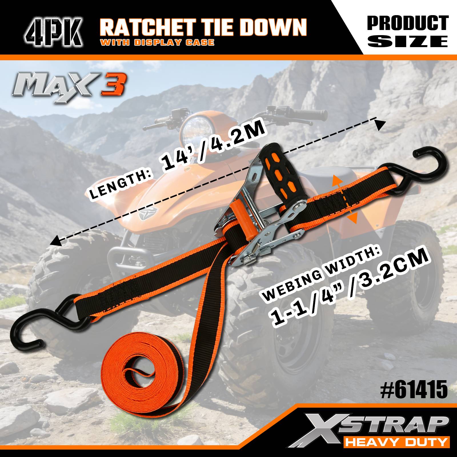 Xstrap 4 комплекта стяжек с храповым механизмом, 1-1/4 дюйма x 14 футов, полиэстеровый стяжной ремень с храповым механизмом, грузоподъемность 1000 фунтов, крепежные ремни с S-образными крючками для грузовиков, внедорожников, автомобильных верхних багажников, мотоциклов.