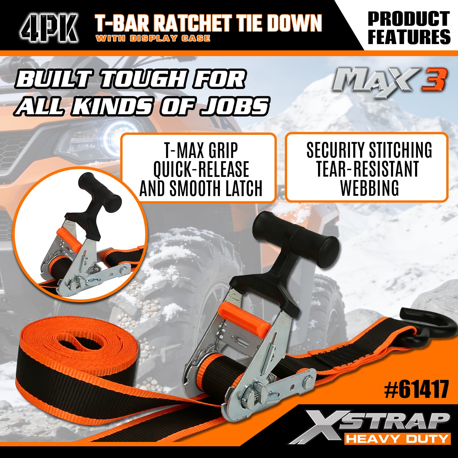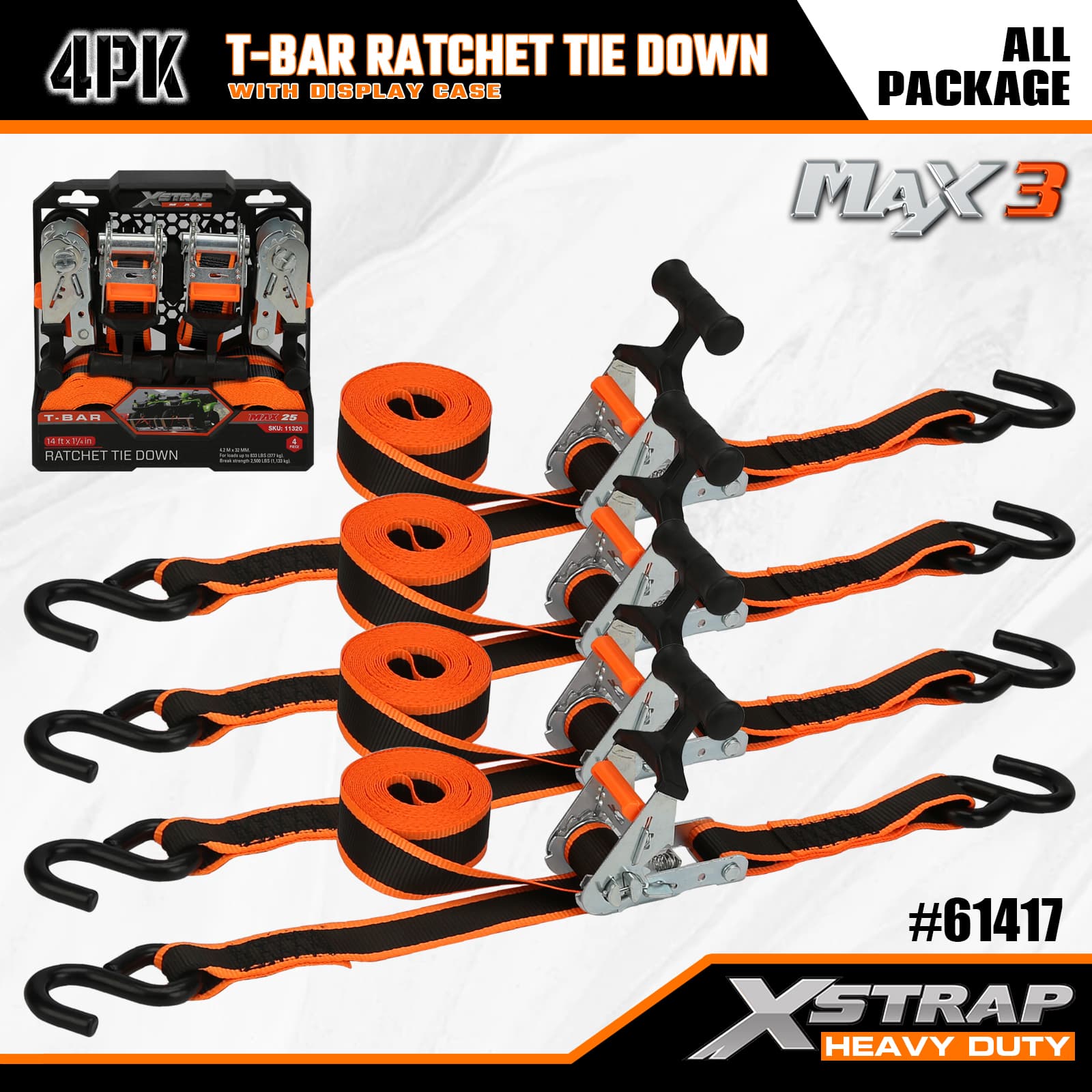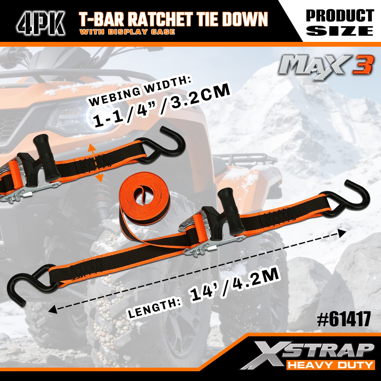 Xstrap 4 Pack T-Max Grip Tie Down, 1–1/4 дюйма x 14 футов, полиэстеровый стяжной ремень с храповым механизмом, грузоподъемность 1000 фунтов. Крепежные ремни с S-образными крючками для пикапа, внедорожника, автомобильных верхних багажников для мотоциклов, легких рыбацких лодок, гидроциклов, снегоходов, газонокосилок.