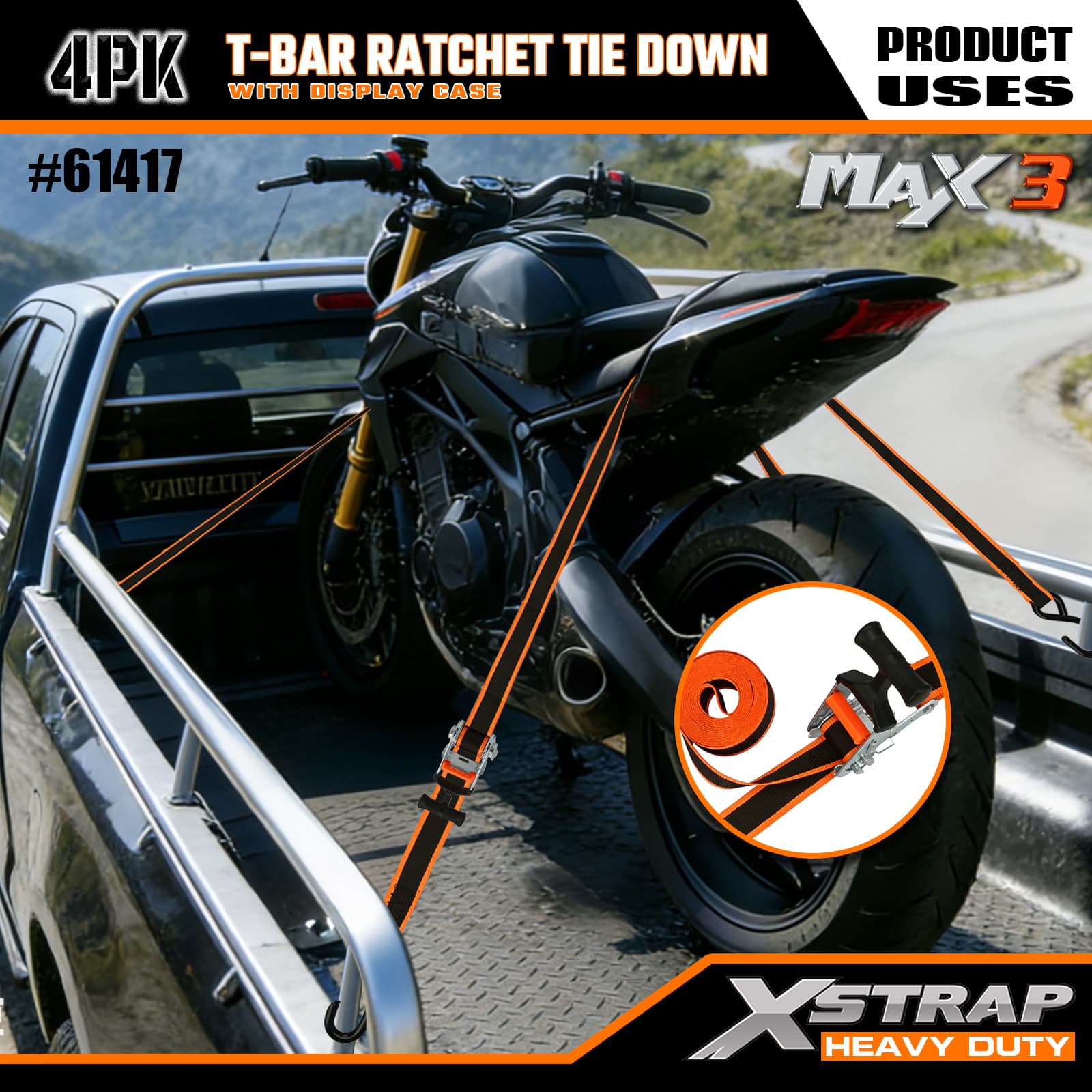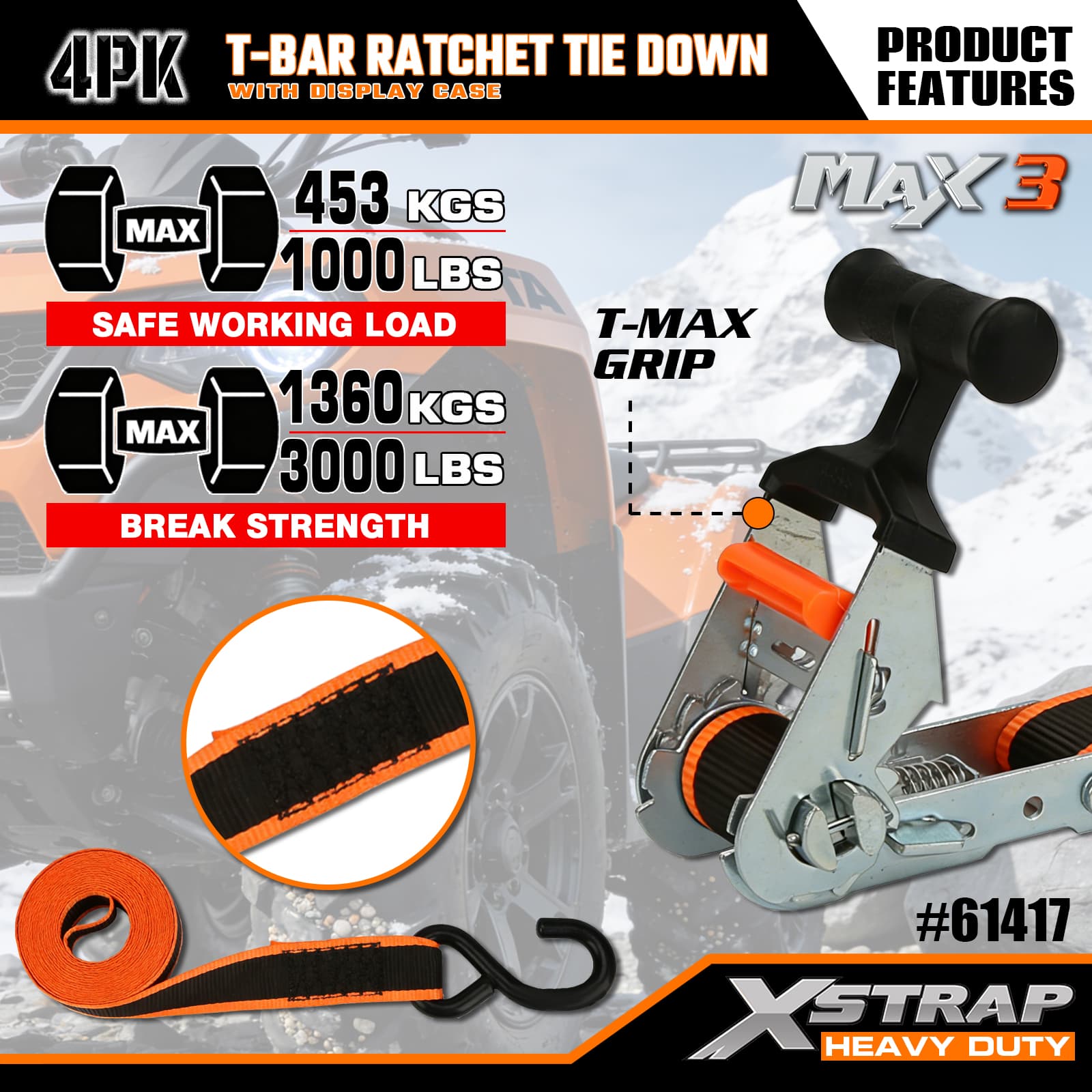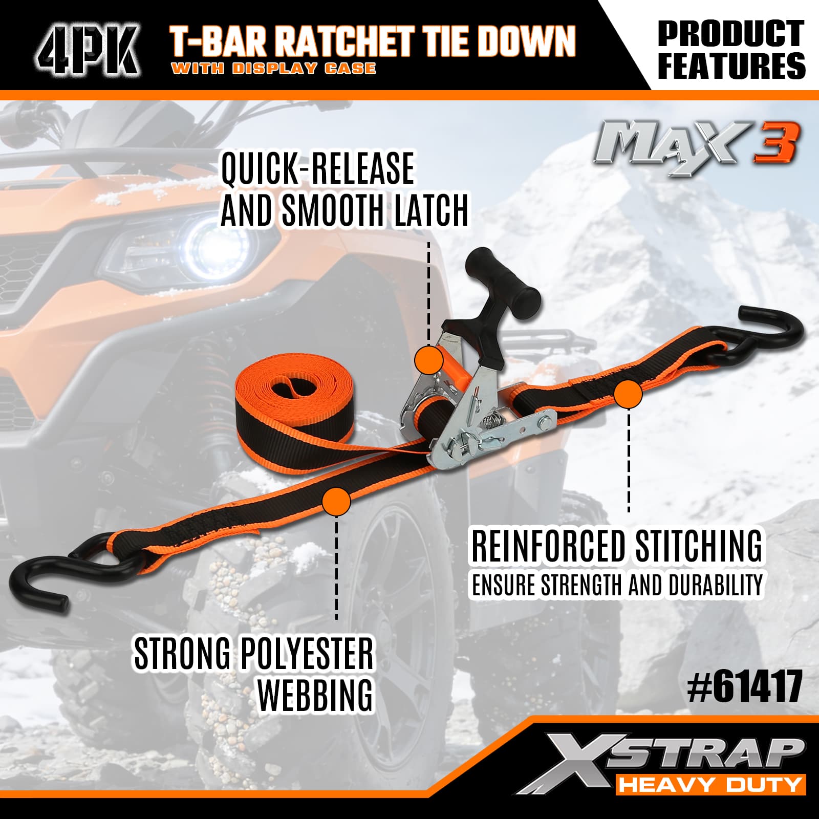 Xstrap 4 Pack T-Max Grip Tie Down, 1–1/4 дюйма x 14 футов, полиэстеровый стяжной ремень с храповым механизмом, грузоподъемность 1000 фунтов. Крепежные ремни с S-образными крючками для пикапа, внедорожника, автомобильных верхних багажников для мотоциклов, легких рыбацких лодок, гидроциклов, снегоходов, газонокосилок.