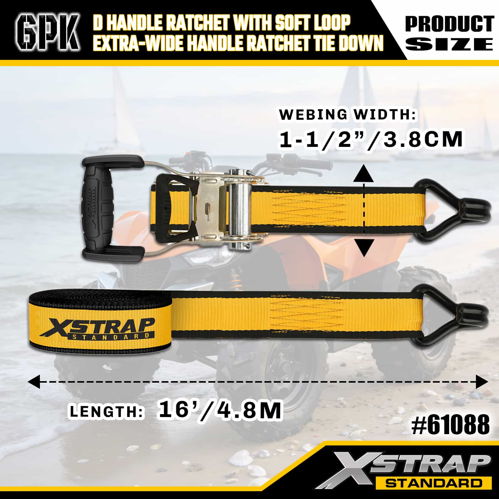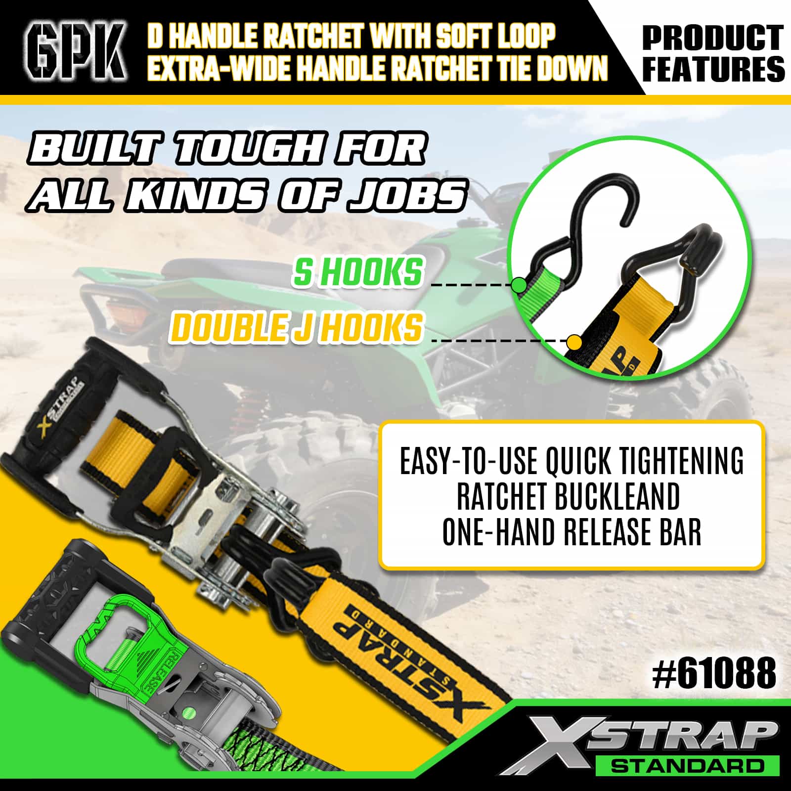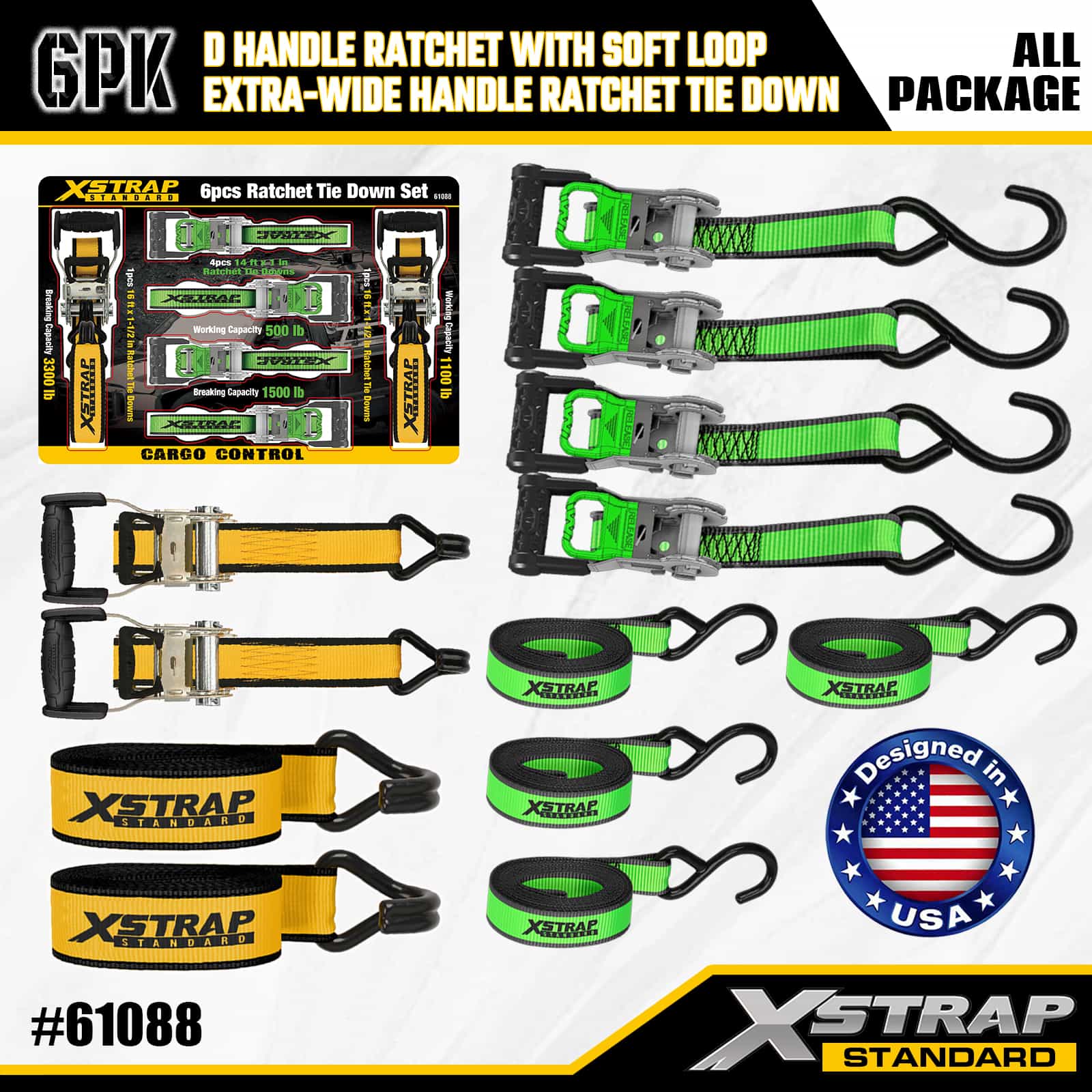 Xstrap 6 Pack Алюминиевая стяжка с храповым механизмом, 1 x 14 и 1 x 16 футов Полиэфирный стяжной ремень Тяговый ремень с храповым механизмом, Крепежные ремни для крепления груза грузоподъемностью 500 фунтов и 1100 фунтов с S-образными крючками и двойными J-образными крючками для управления грузовым автомобилем, пикапом, внедорожником, автомобильными багажниками для мотоциклов.