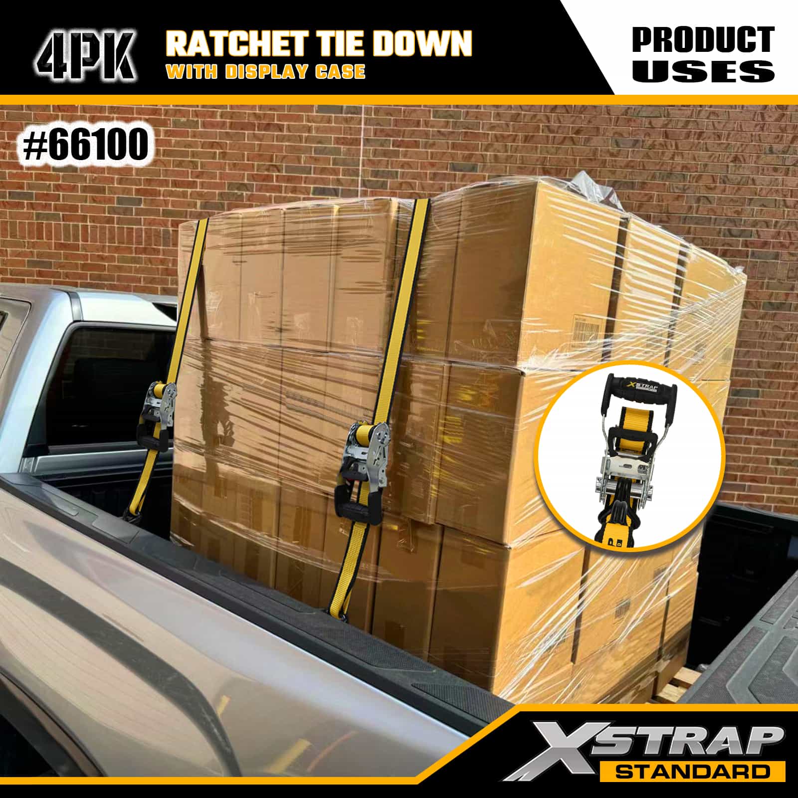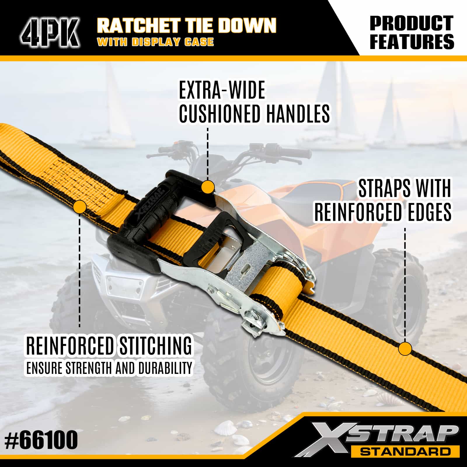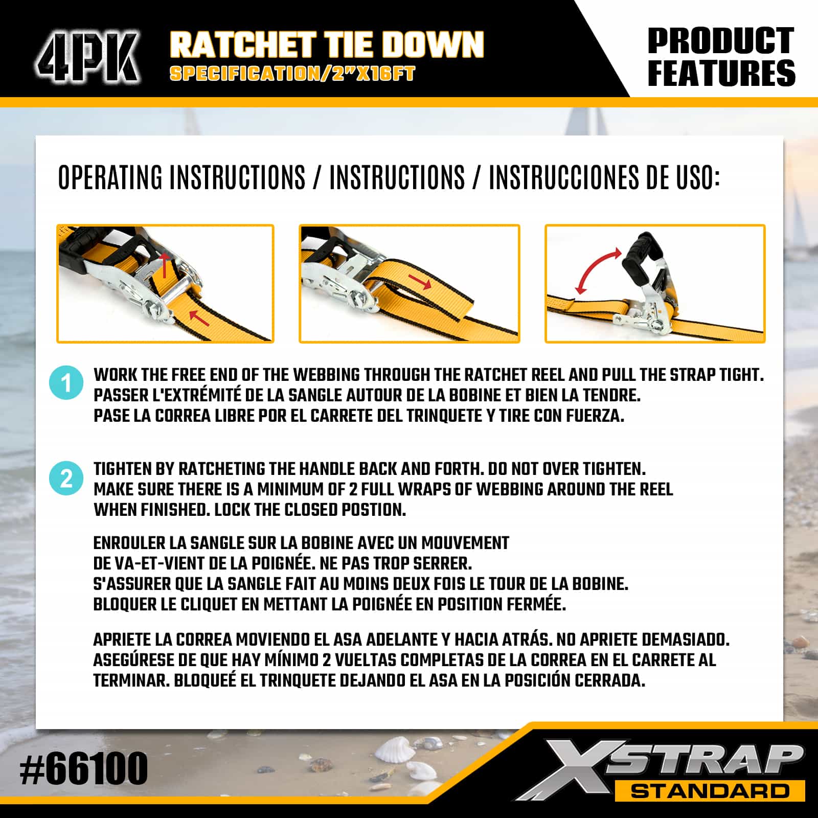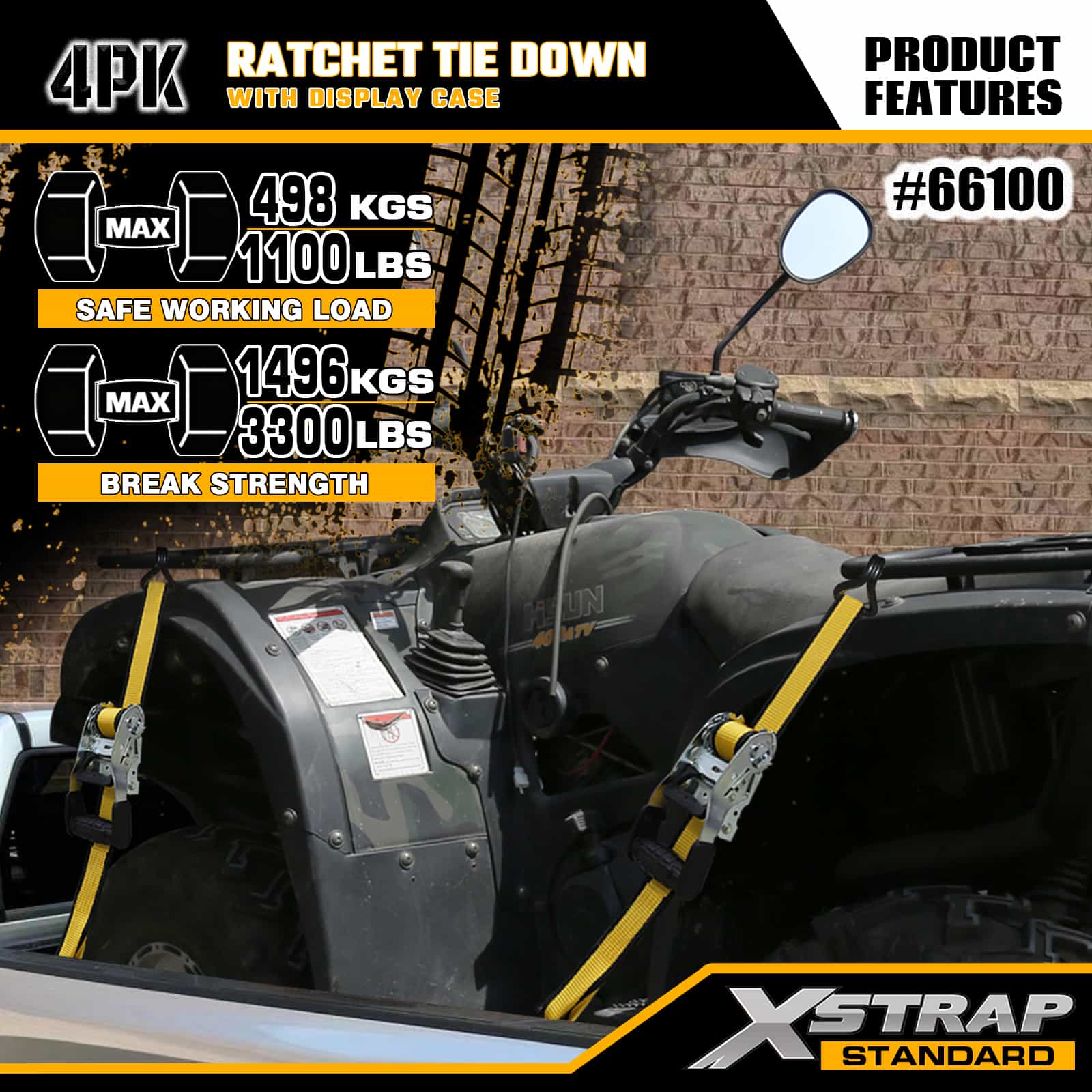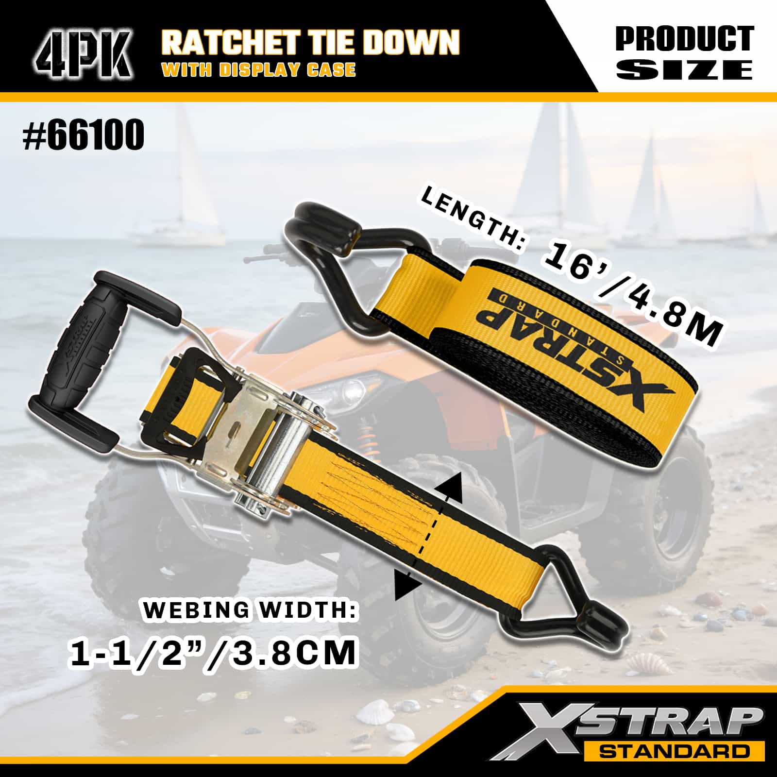 Xstrap, 4 комплекта стяжек с храповым механизмом и двойными J-образными крючками, полиэстеровый стяжной ремень размером 1-1/2 дюйма x 16 футов, ремень с храповым механизмом, грузоподъемность 1100 фунтов. Крепежные ремни для крепления груза с двойными J-образными крючками для пикапа, внедорожника, автомобильных верхних багажников, мотоциклов, легких рыбацких лодок, гидроциклов, снегоходов, газонокосилок.