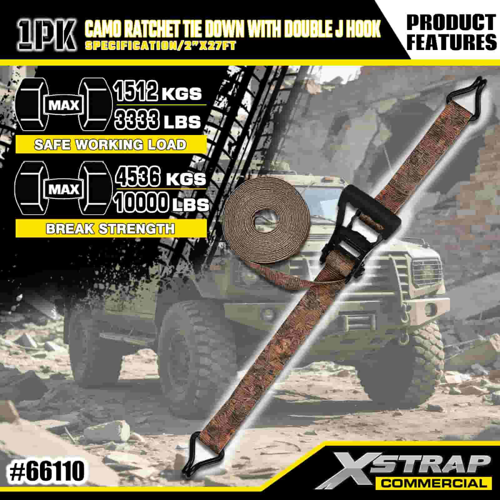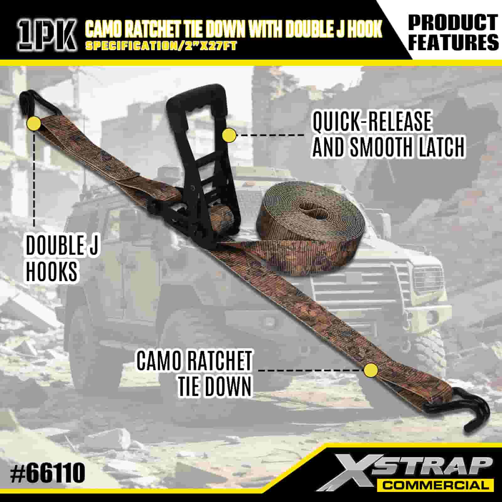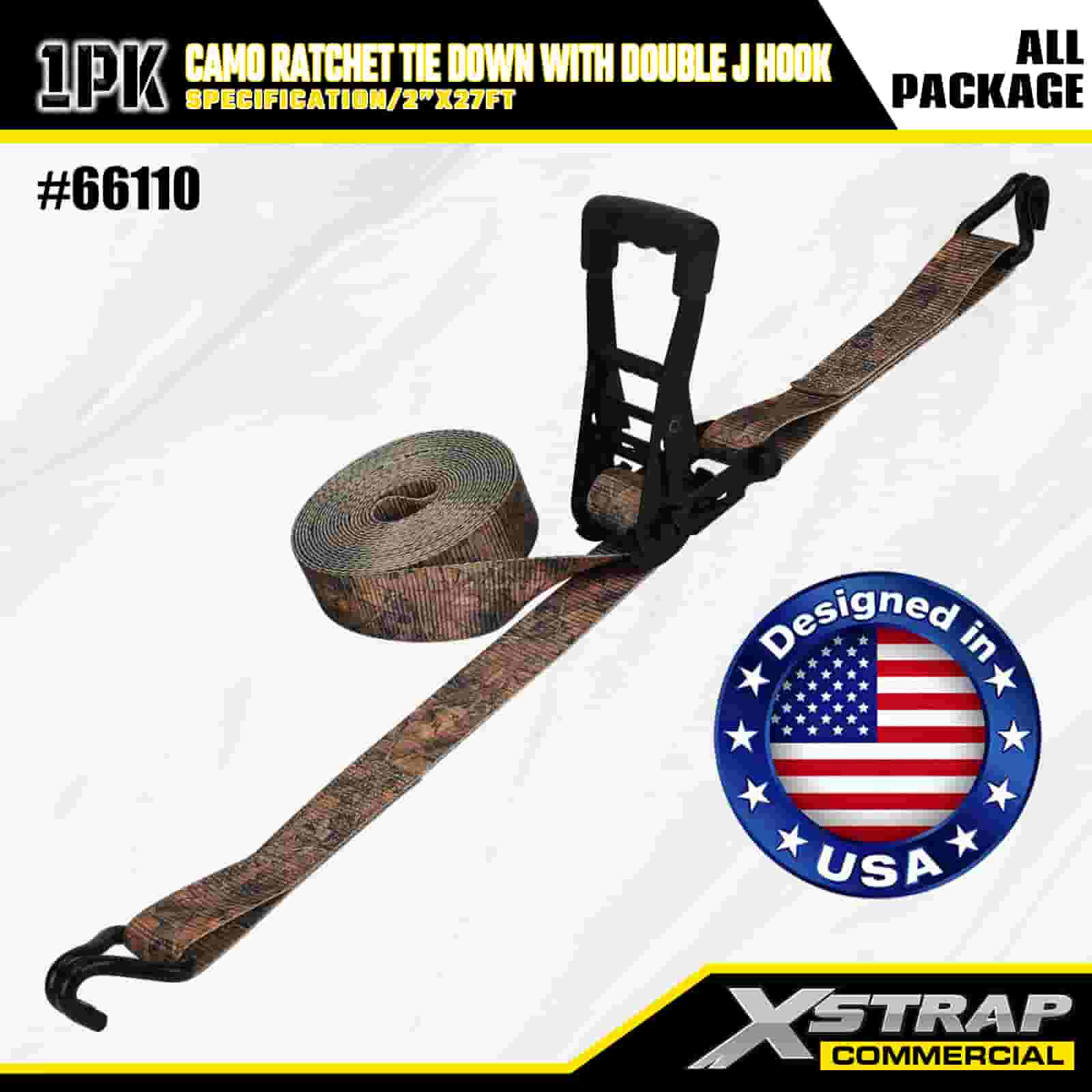 Xstrap CAMO с храповым механизмом с двойными J-образными крючками, полиэстеровый стяжной ремень размером 2 x 27 футов. Ремень с храповым механизмом, грузоподъемность 3333 фунта. Крепежные ремни для крепления груза с двойными J-образными крючками для грузового пикапа, внедорожника, автомобильных верхних багажников для мотоциклов.