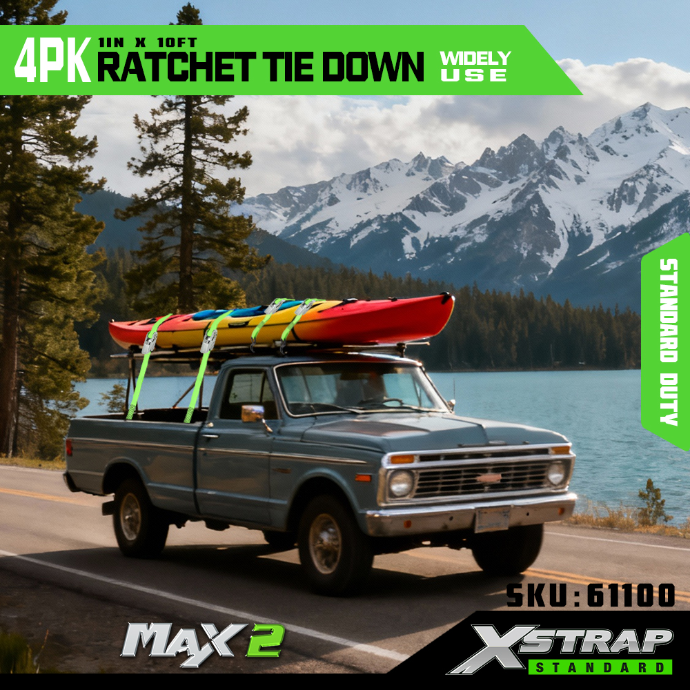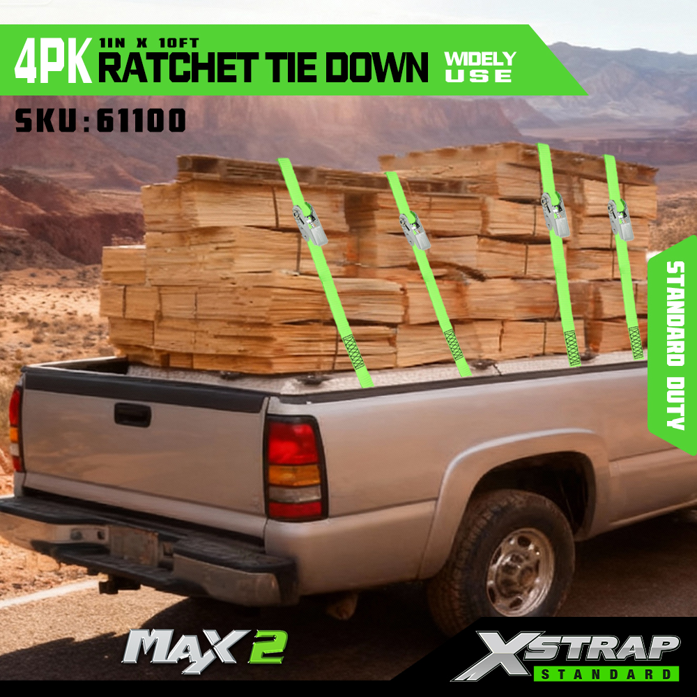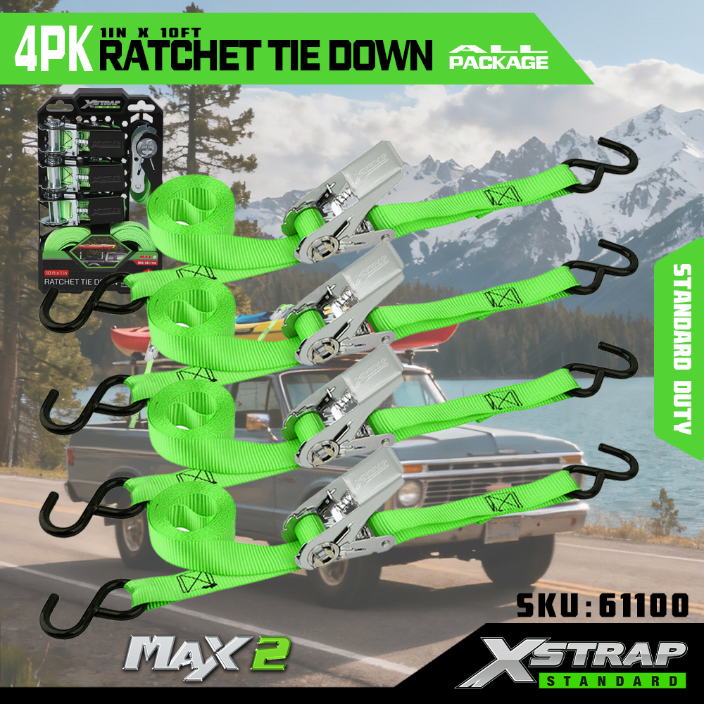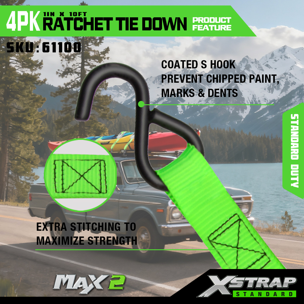 Xstrap 4 Pack с храповым механизмом, полиэстеровый стяжной ремень 1 x 15 футов, тянущий ремень с храповым механизмом, грузоподъемность 500 фунтов. Крепежные ремни с S-образными крючками для пикапа, легкого мотоцикла с прицепом, легкой рыбацкой лодки, гидроцикла, снегохода.