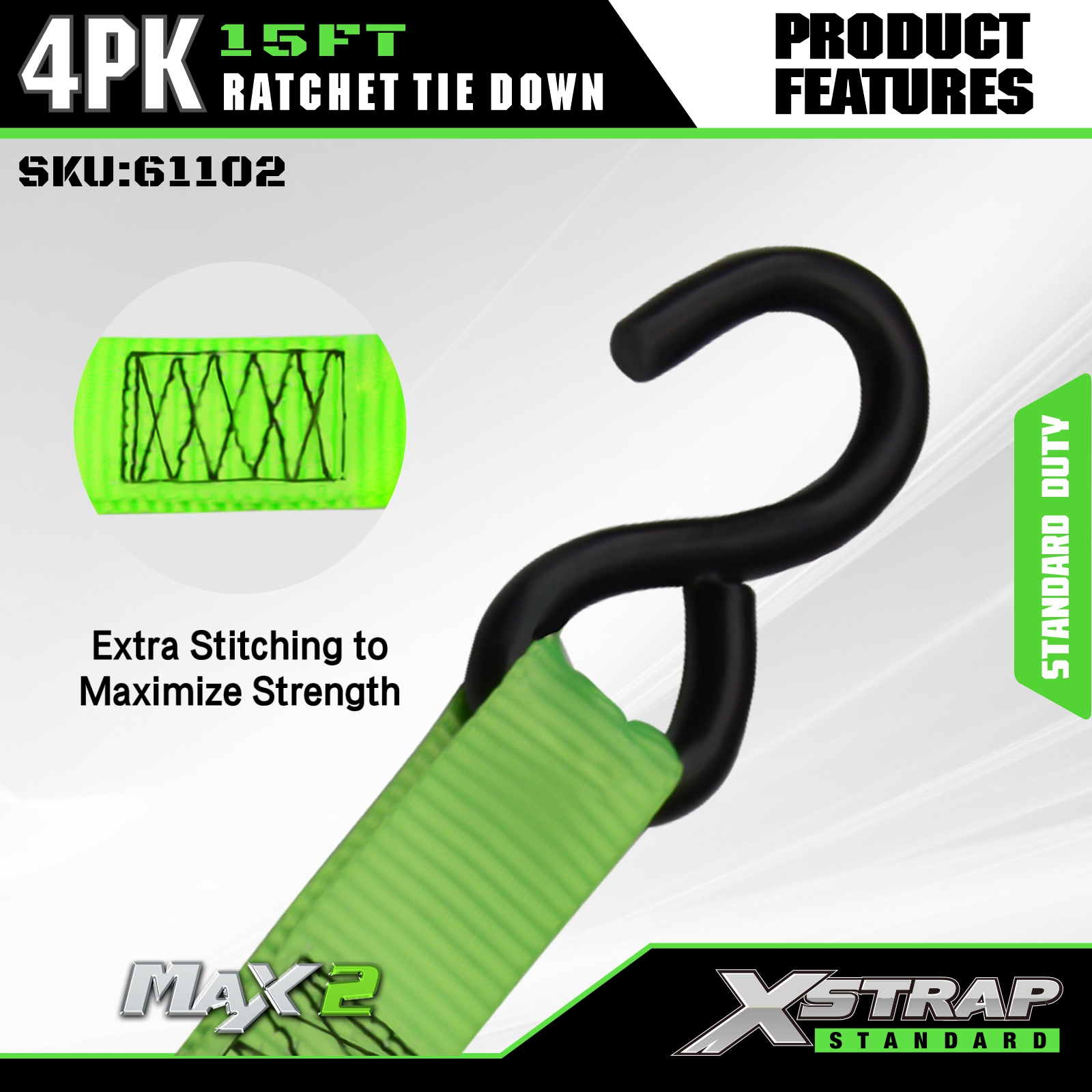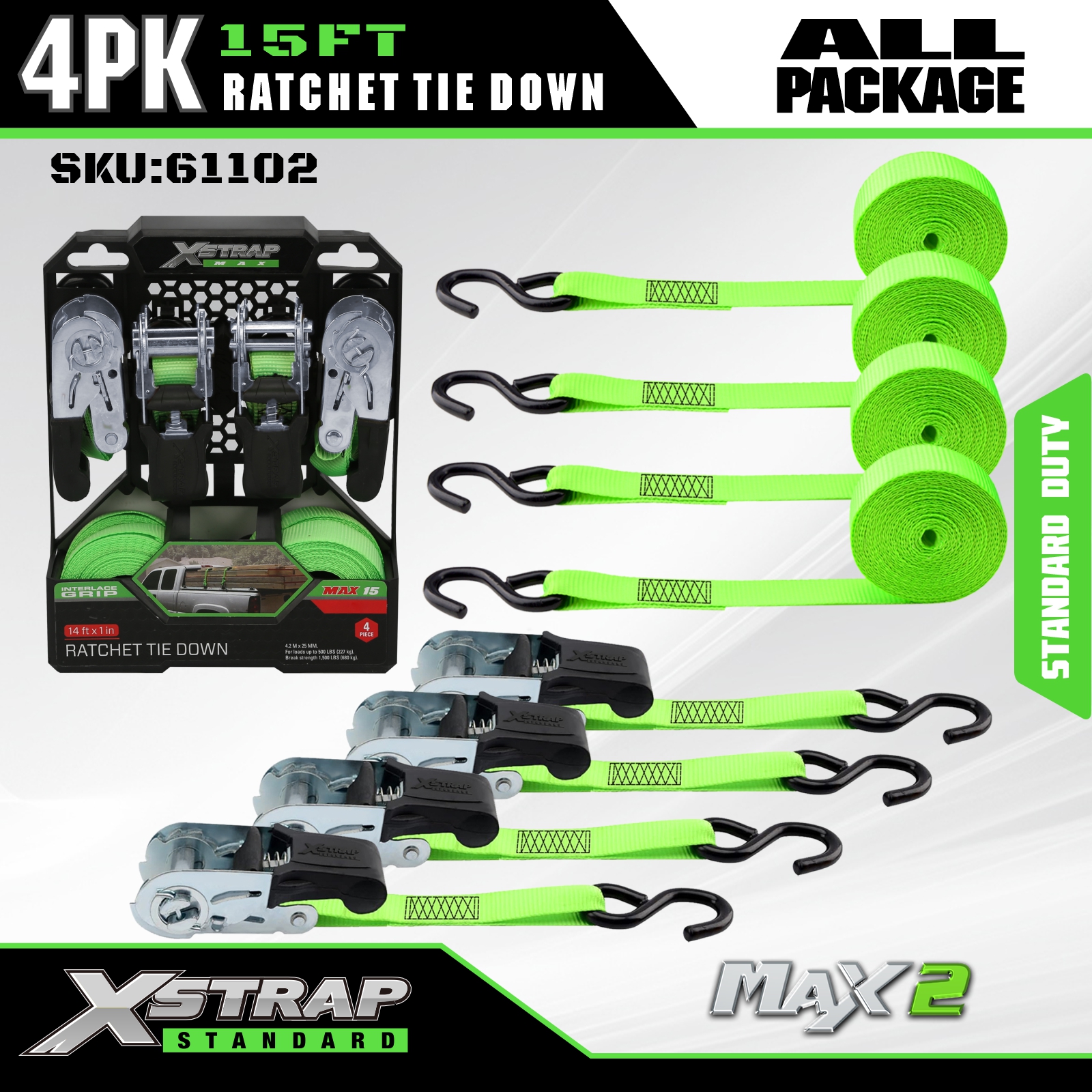 Связывающие ремни Xstrap с храповым механизмом 4 шт. 15 футов — 500 фунтов Грузоподъемность 1500 фунтов на разрыв — грузовые ремни для движущихся устройств, газонного оборудования, мотоциклов.