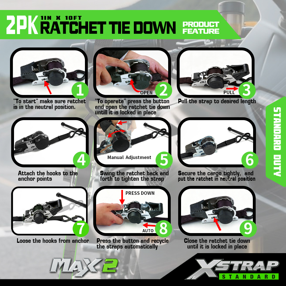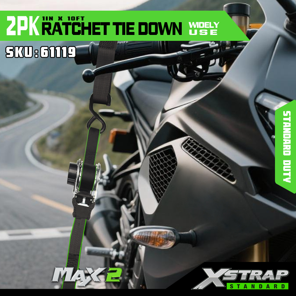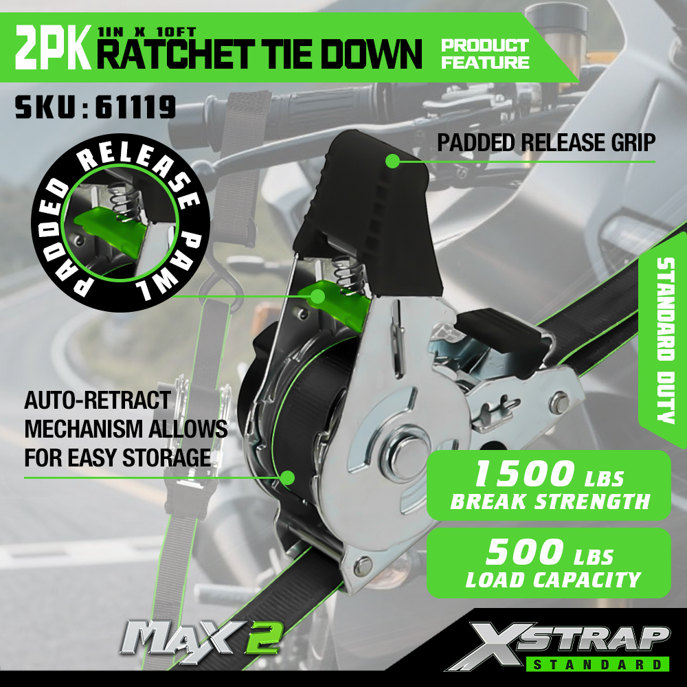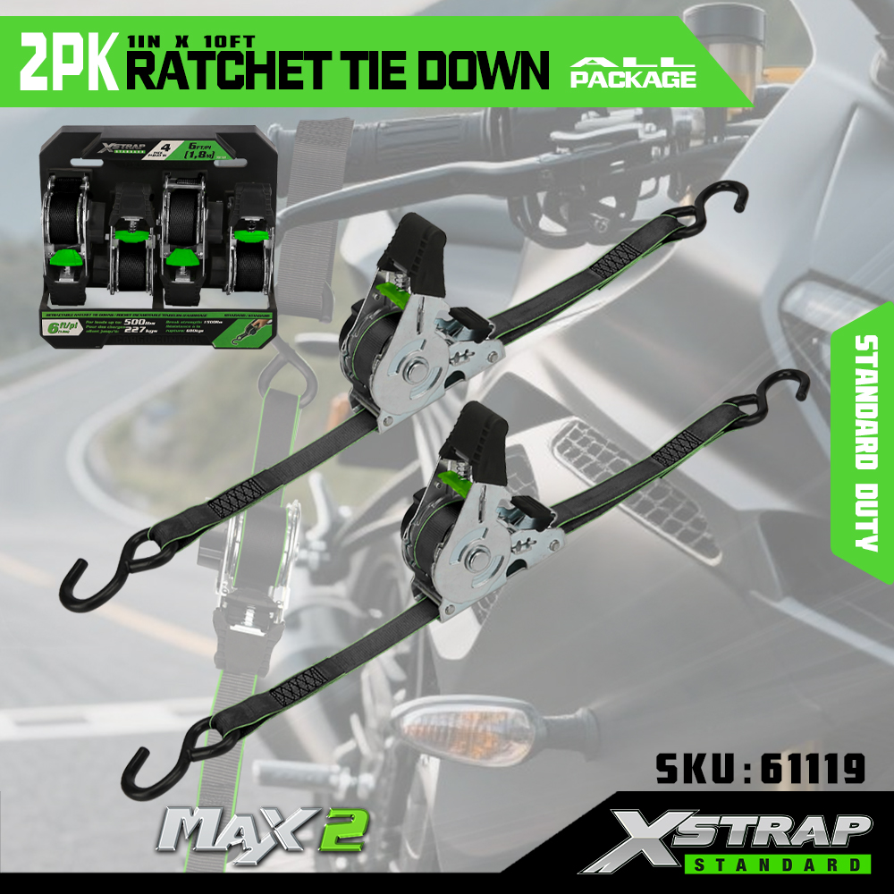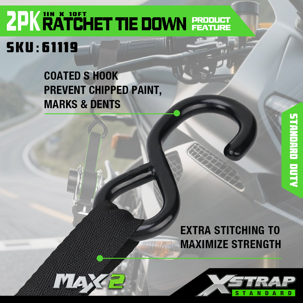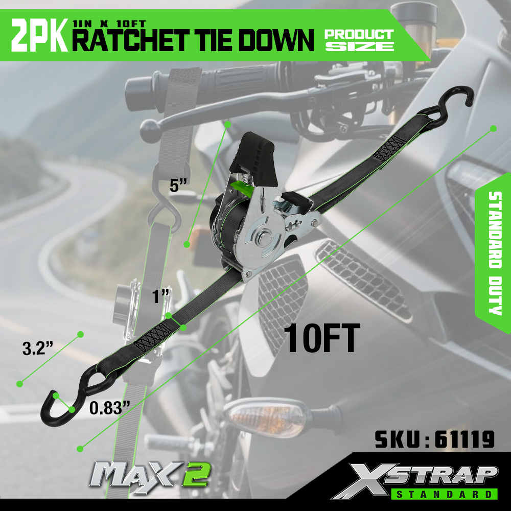 Xstrap 2 Pack с храповым механизмом, полиэстеровый стяжной ремень размером 1 x 10 футов, ремень с храповым механизмом, грузоподъемность 500 фунтов. Крепежные ремни с S-образными крючками для пикапа, внедорожника, автомобильных верхних багажников для мотоциклов, легких рыбацких лодок, гидроциклов, снегоходов, газонокосилок.