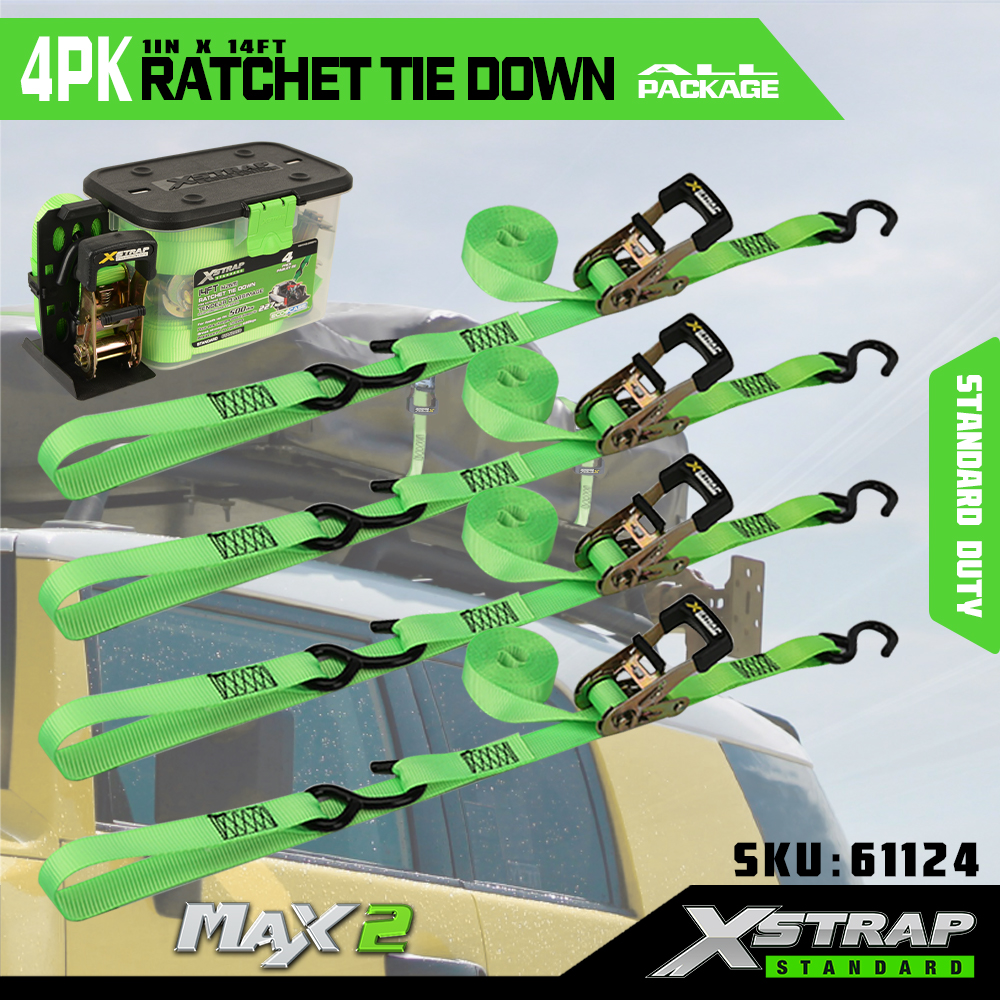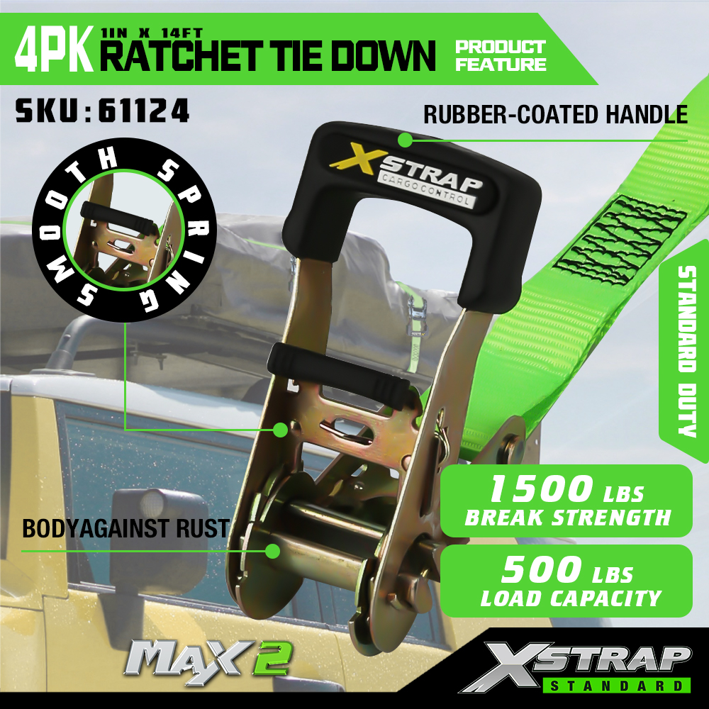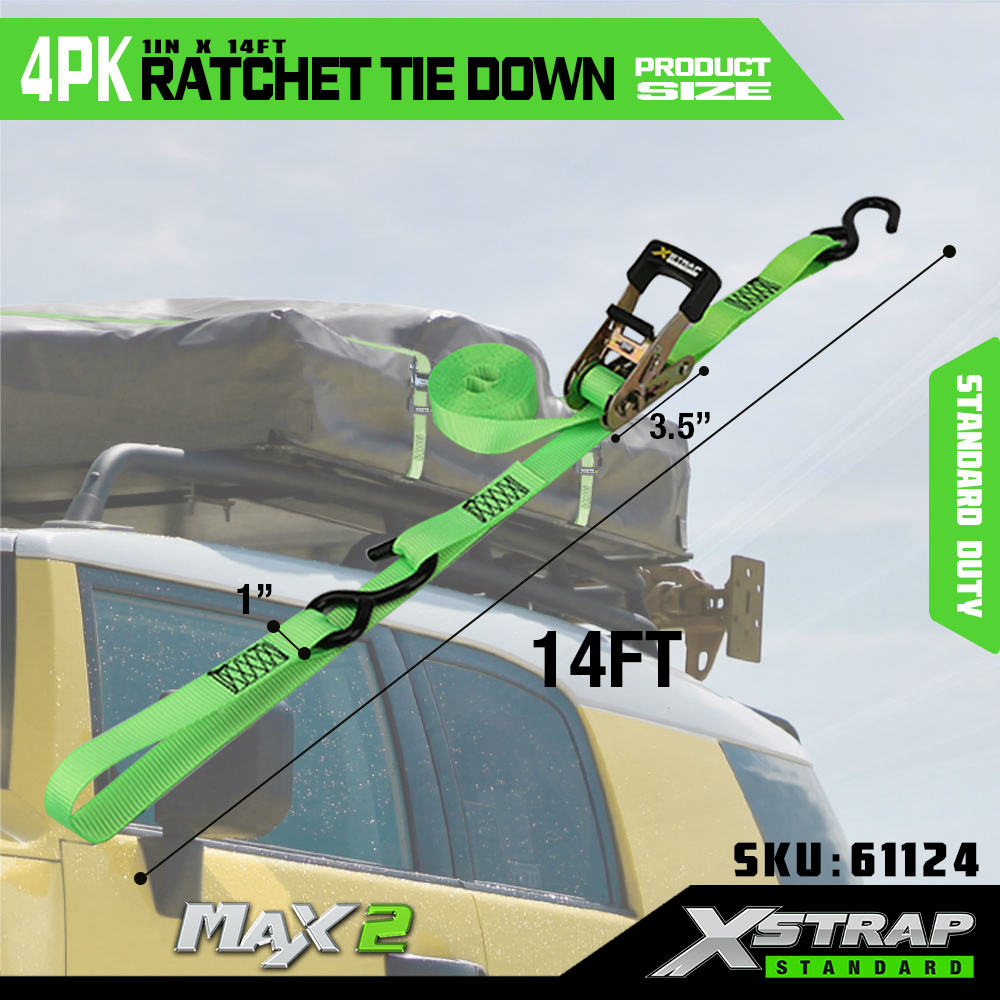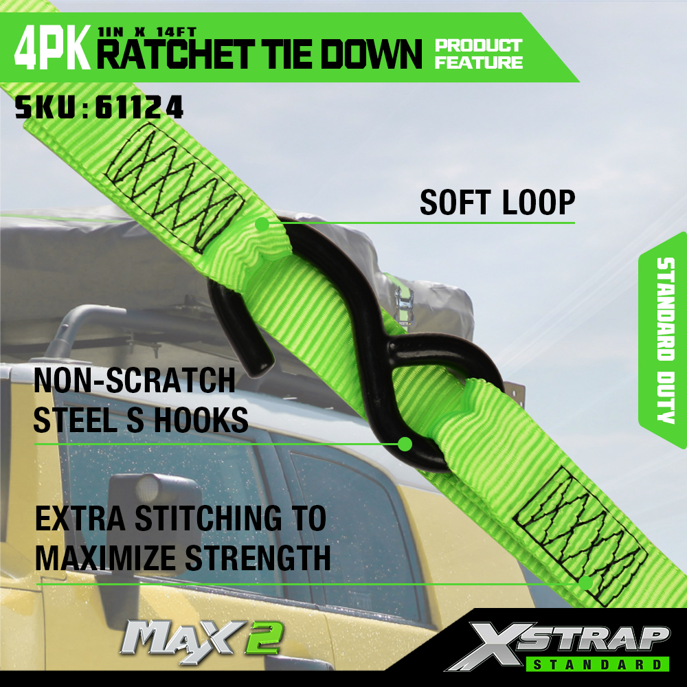 Xstrap, 4 комплекта привязных ремней с храповым механизмом, полиэстеровый ремень с храповым механизмом размером 1 х 14 футов и мягкой петлей, крепежные ремни для крепления груза грузоподъемностью 1500 фунтов (500 фунтов) с металлической храповой системой и S-образными крючками для грузов, грузовиков, газонокосилок, квадроциклов.