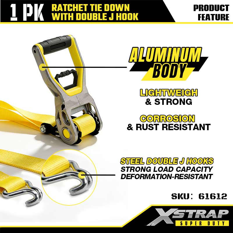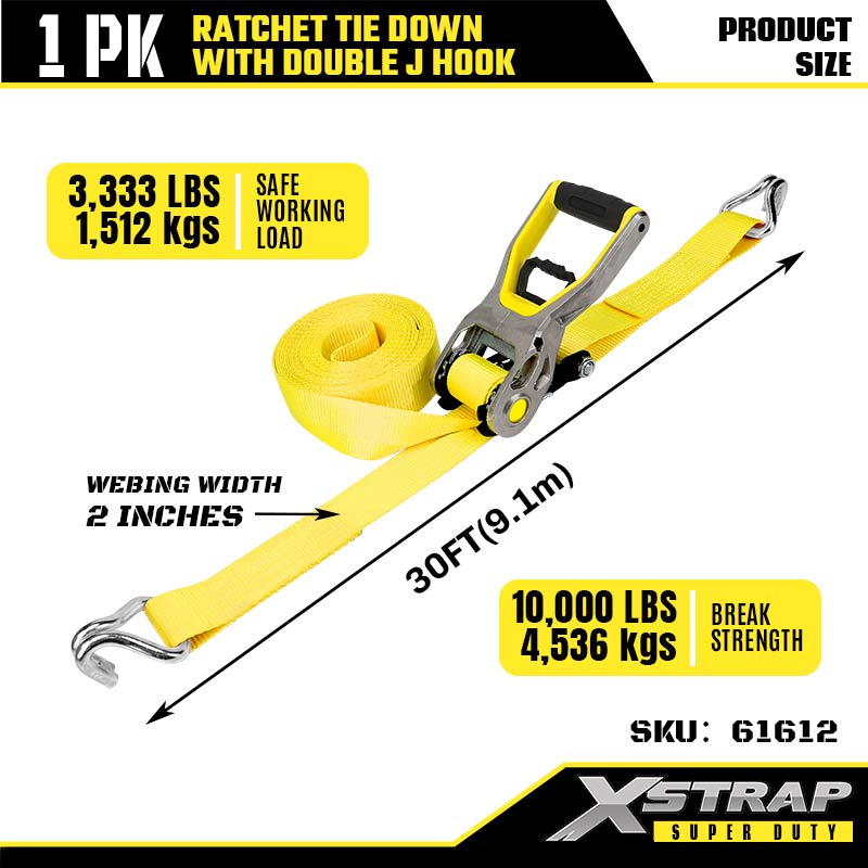 Xstrap 2PK Стяжной ремень с храповым механизмом с двойными J-образными крючками, полиэстеровый стяжной ремень размером 2 x 30 футов. Ремень с храповым механизмом, грузоподъемность 3333 фунта. Крепежные ремни для крепления груза с двойными J-образными крючками для тяжелых прицепов, лыжных лодок с прицепом с плоской платформой, небольших автомобилей, тяжелого оборудования.