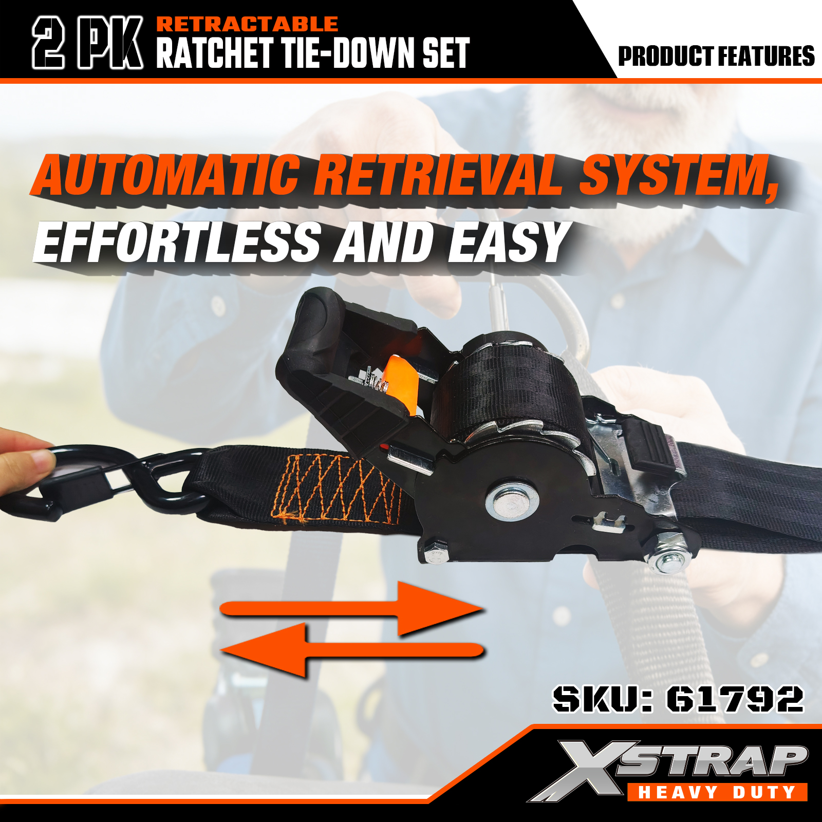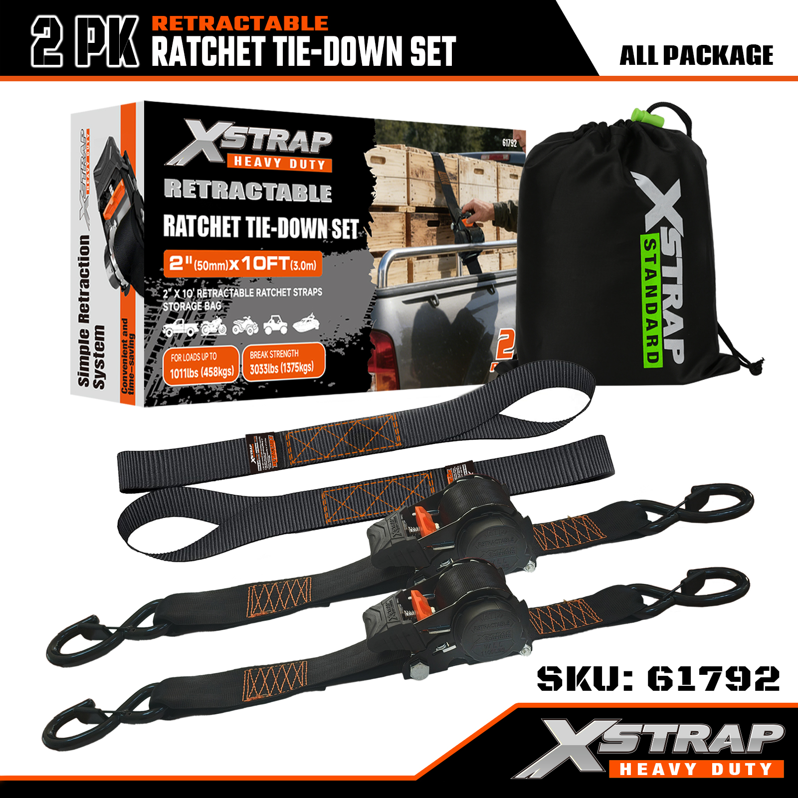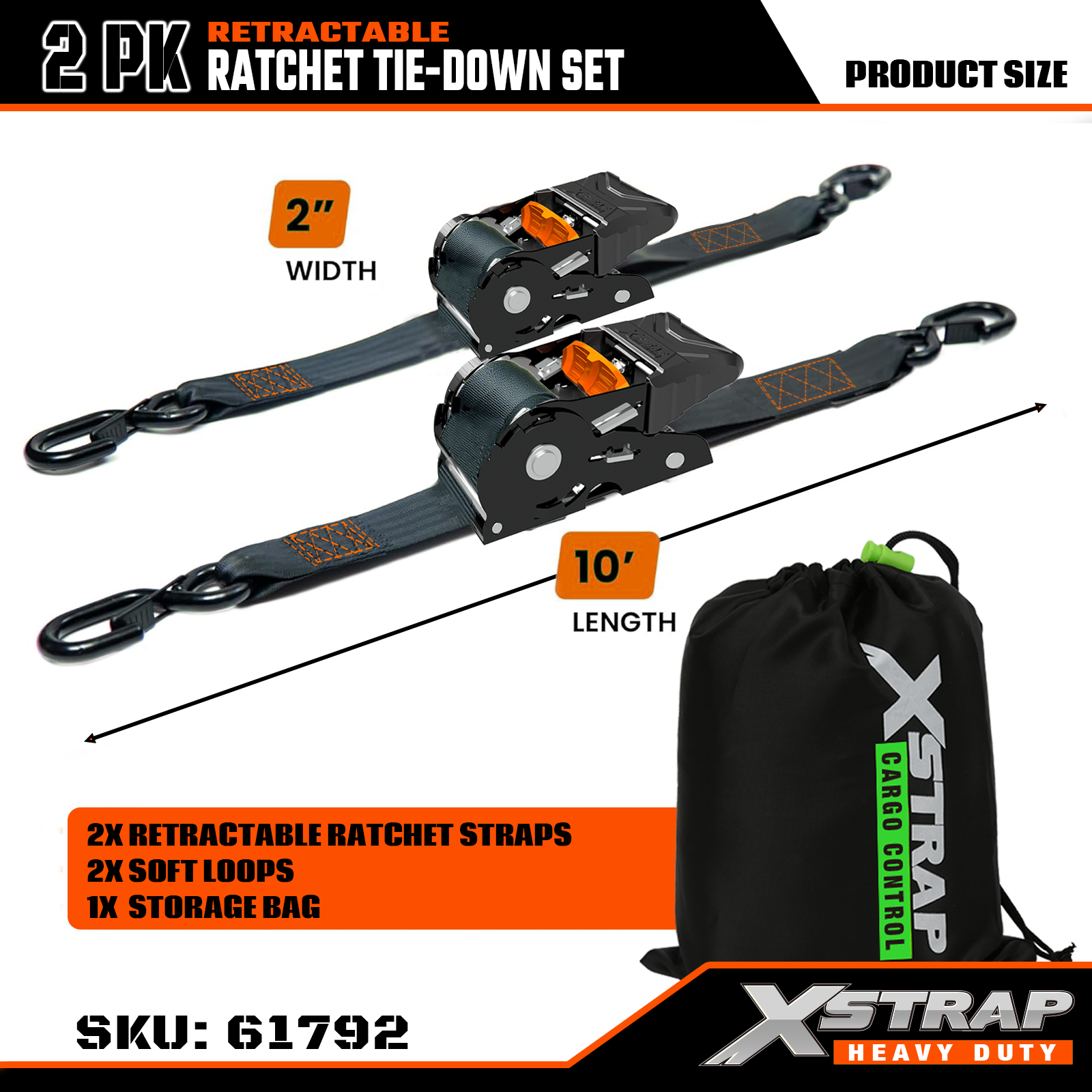 Xstrap 2PK Выдвижной набор стяжек с храповым механизмом и безопасными S-образными крючками, полиэстеровый стяжной ремень размером 2 x 10 футов с храповым механизмом, крепежные ремни для крепления груза грузоподъемностью 1011 фунтов с безопасными S-образными крючками для грузовиков, грузовых прицепов и мотоциклов.